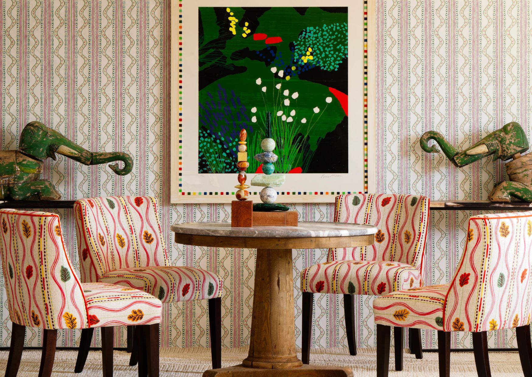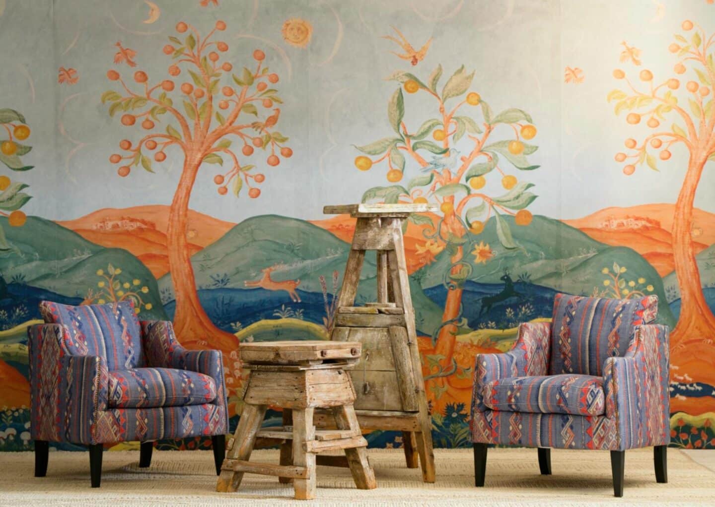 Our Rufus wallpaper in Stone and Meadow draws inspiration from medieval tapestries, bringing a sense of wonder and enchantment to any space. These designs add depth, intrigue and joy to a room, creating a story in every corner.