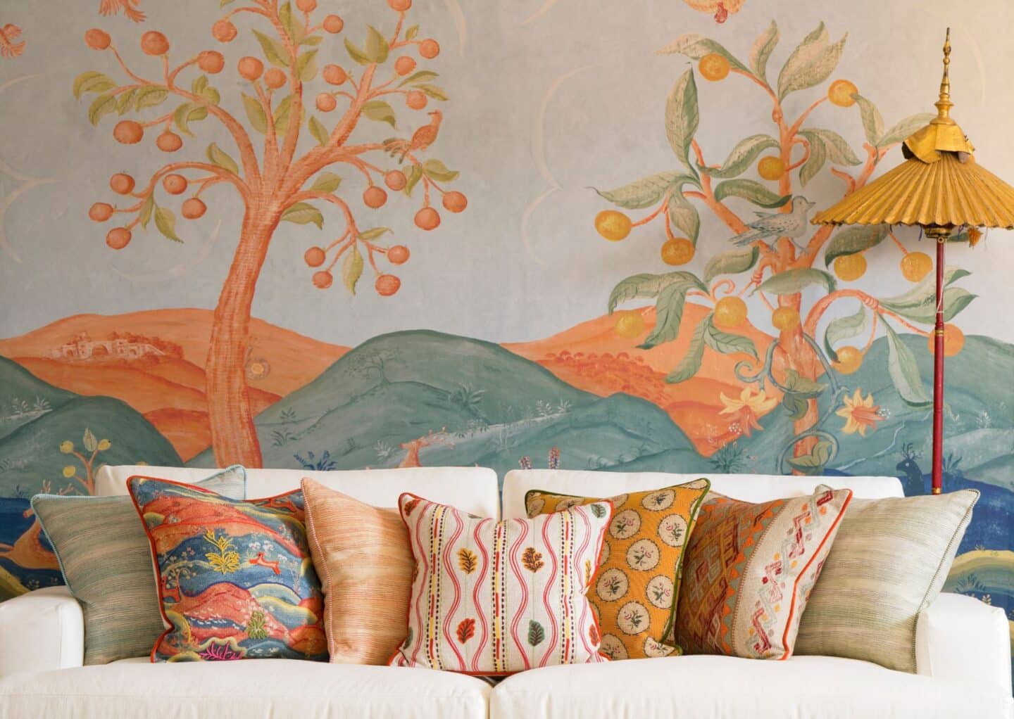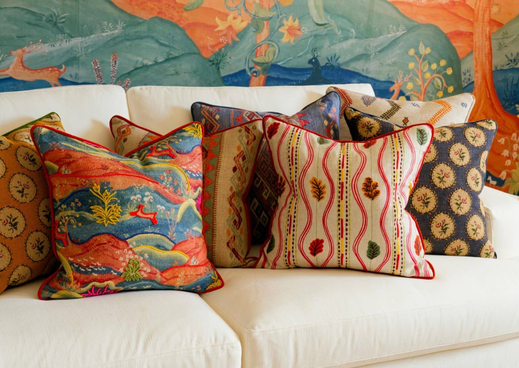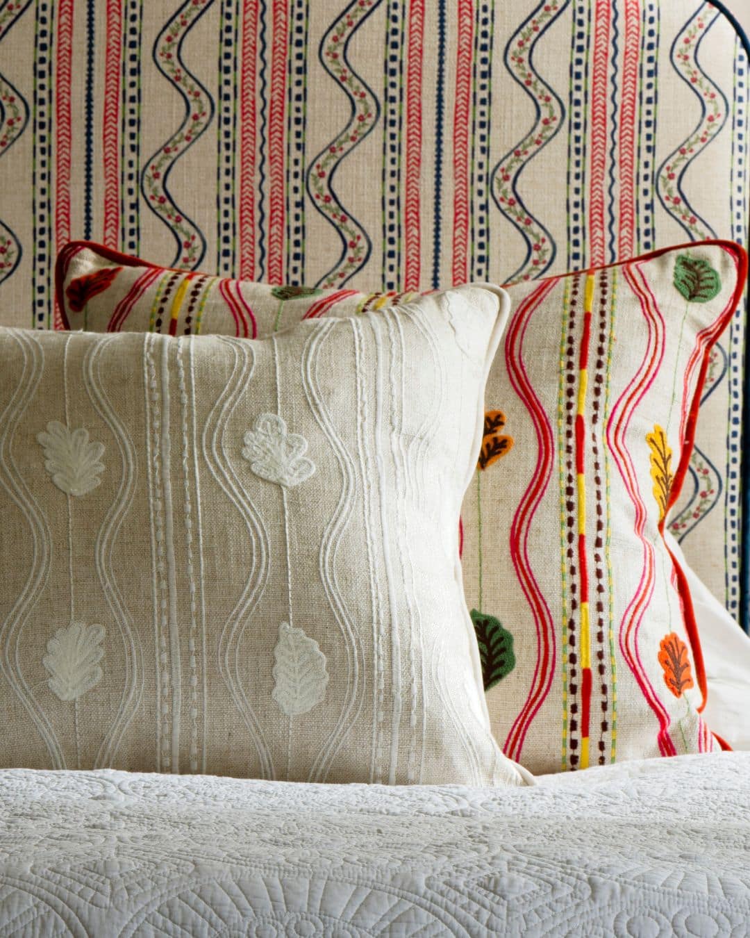 At our Design Studio, we embrace a wide range of techniques across our portfolio, and bringing these crafts together in Harvest Moon has been a truly rewarding achievement. The Falling Leaves fabric is intricately embroidered, while the richly layered Meadow fabric, derived from the hand painted Rufus Stone mural, is digitally printed and enhanced with bold embroidery accents. Both designs bring a tactile, handcrafted quality that adds depth and character to the collection.