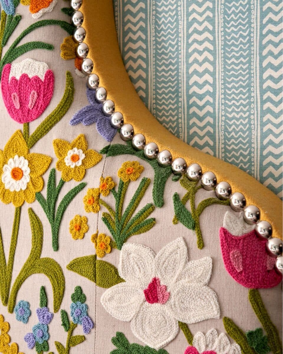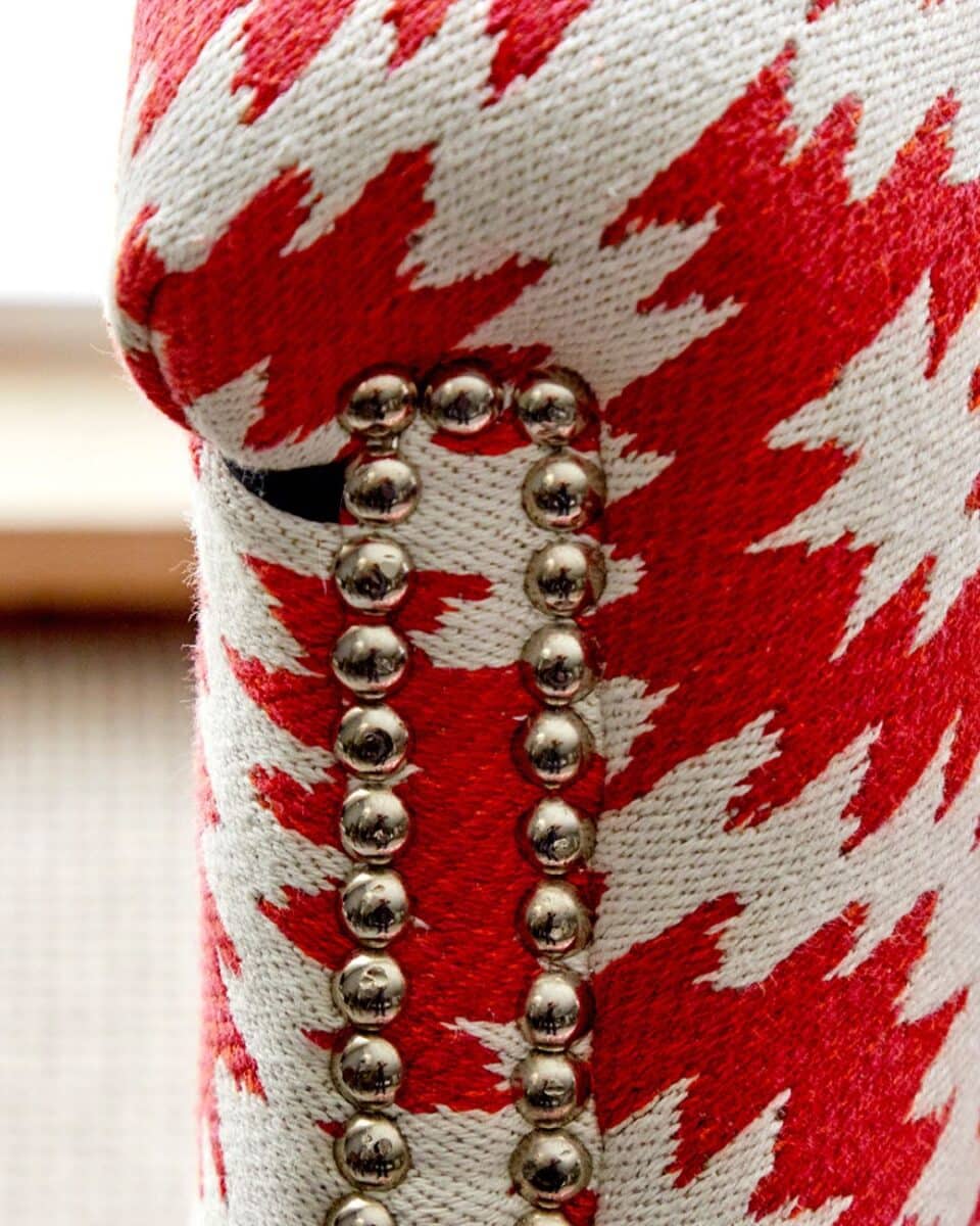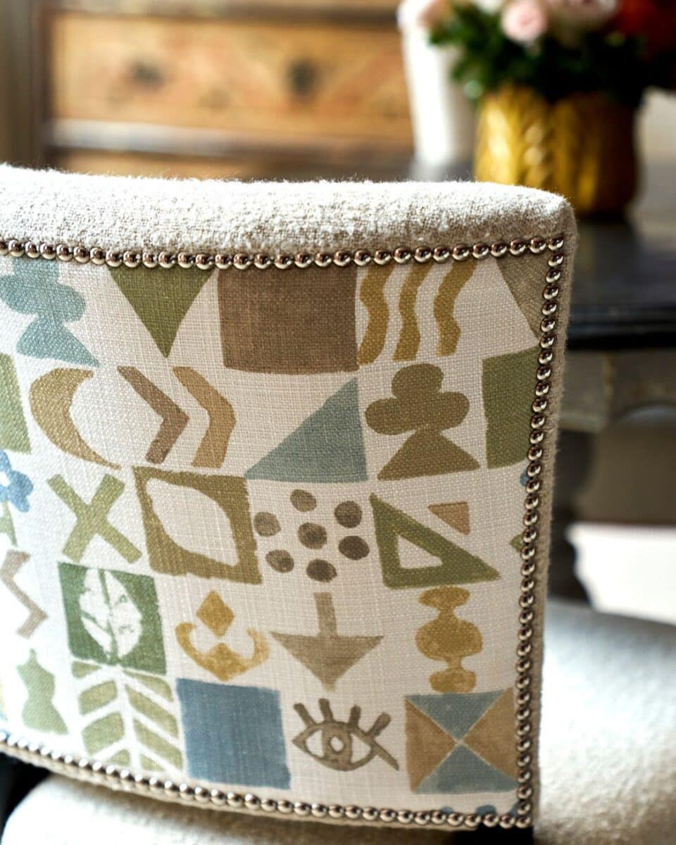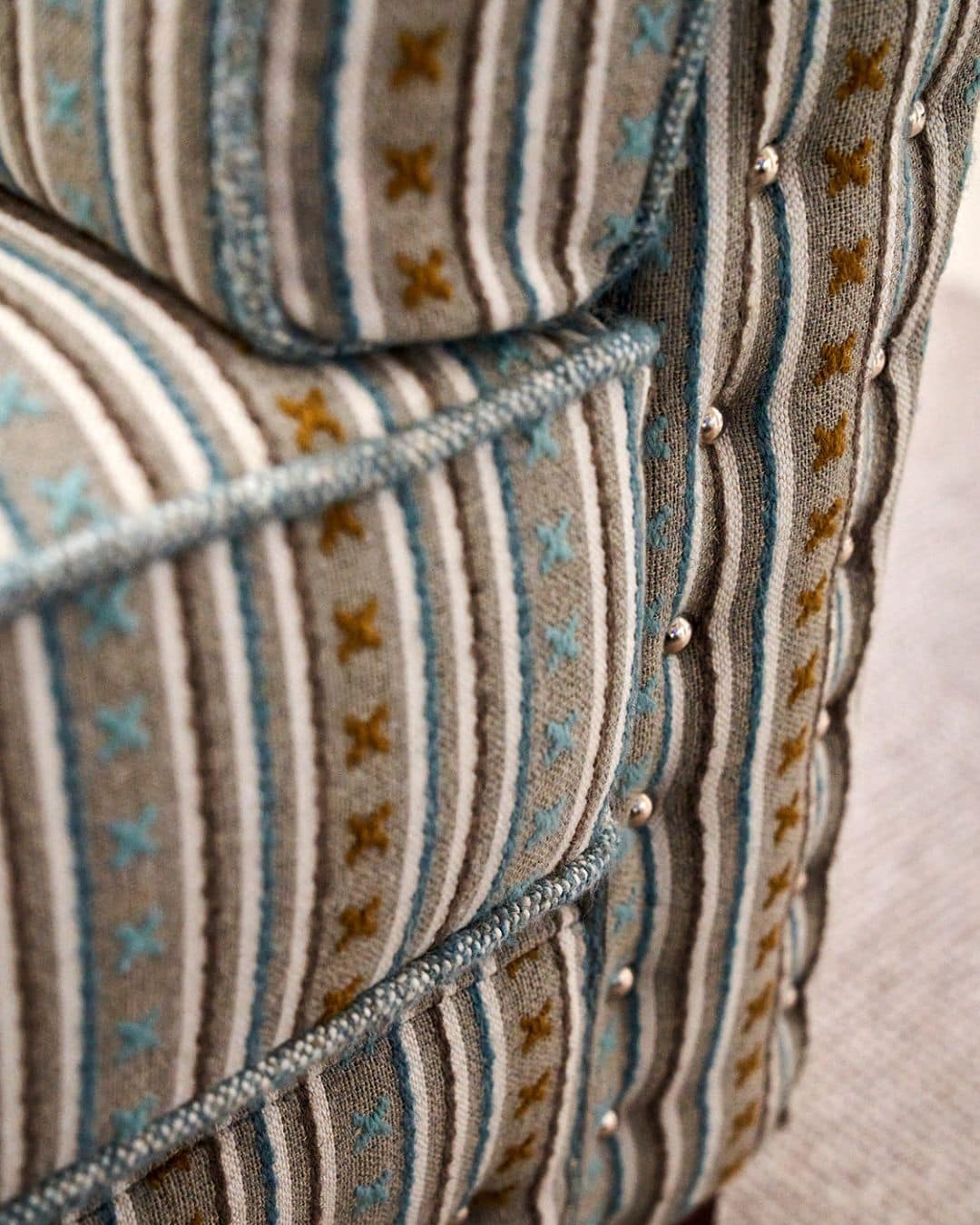 Studding can also change character depending on how it is applied. Closed studding, with small nails placed side by side, feels classic and tailored. Enlarging the studs and leaving space between them creates a lighter, more contemporary rhythm, particularly when tracing the outline of an oversized headboard or running neatly along the edge of a table. A double row of studs introduces a sense of drama, while also framing a piece beautifully and even separating two different fabrics in a way that feels almost artistic.