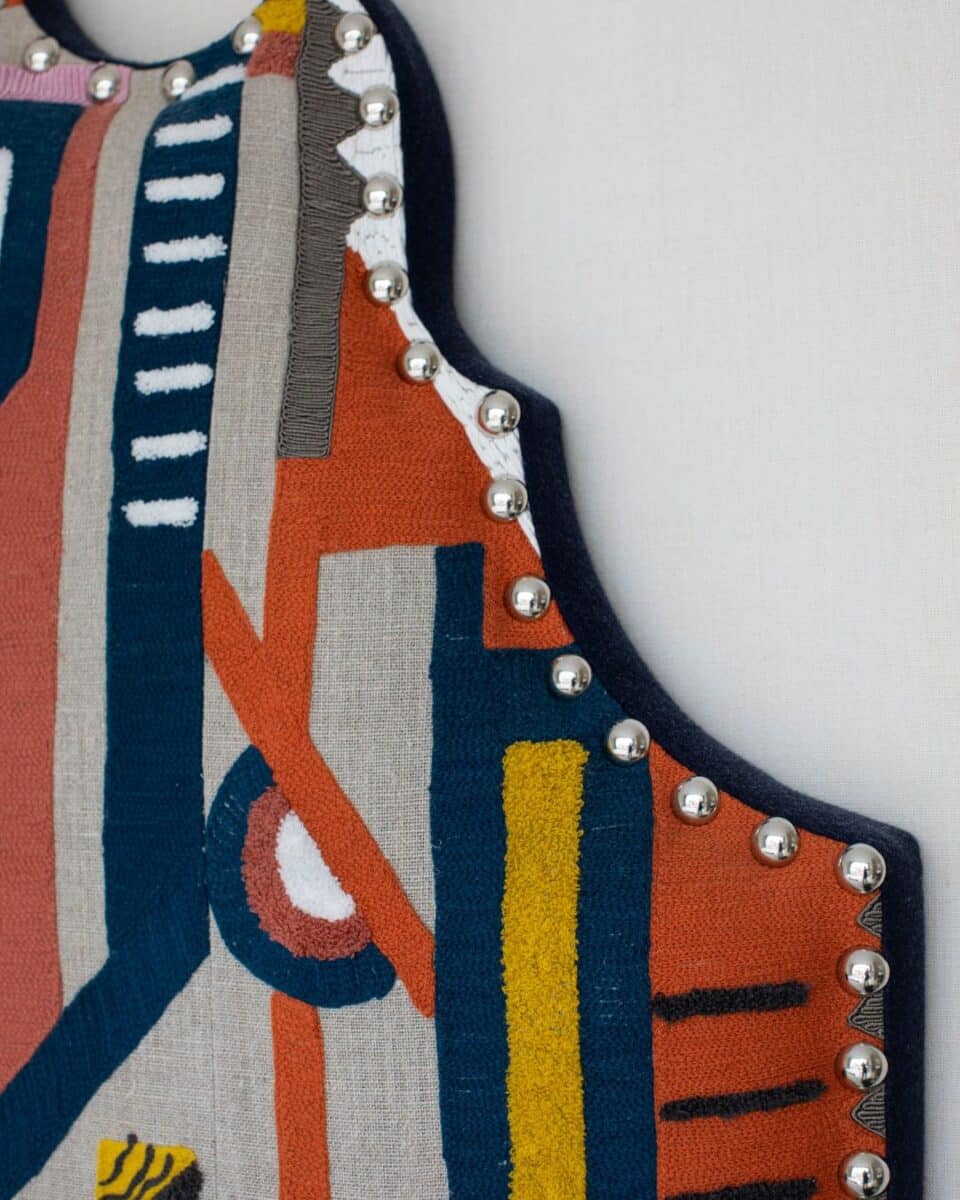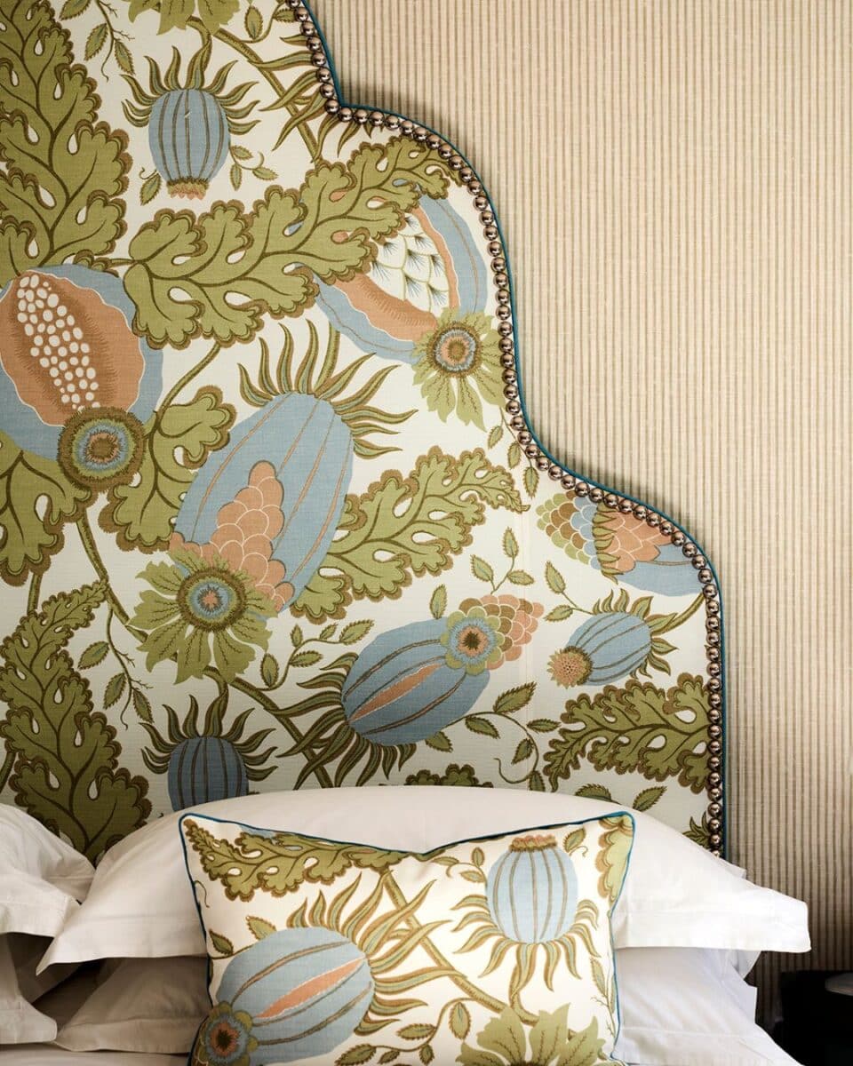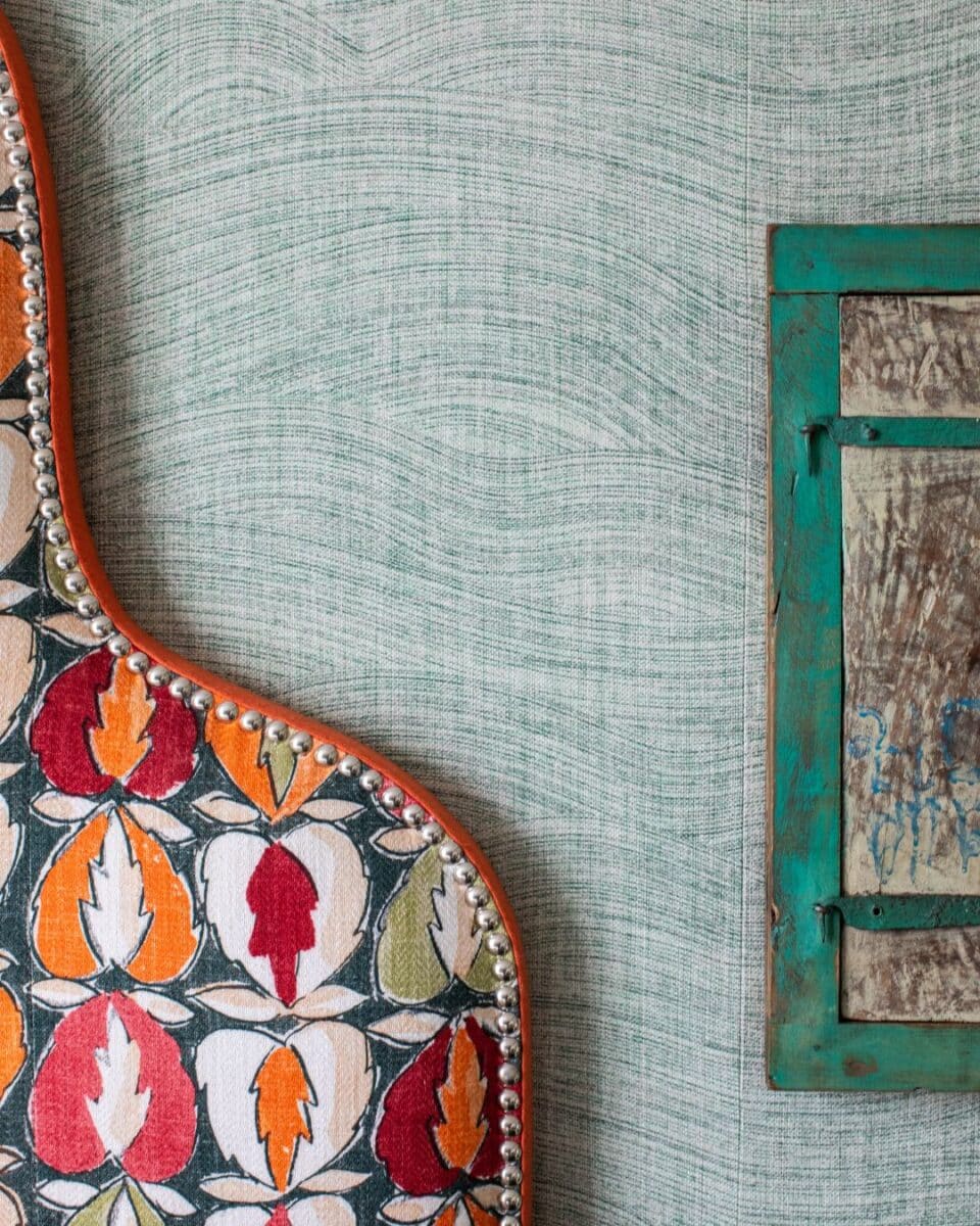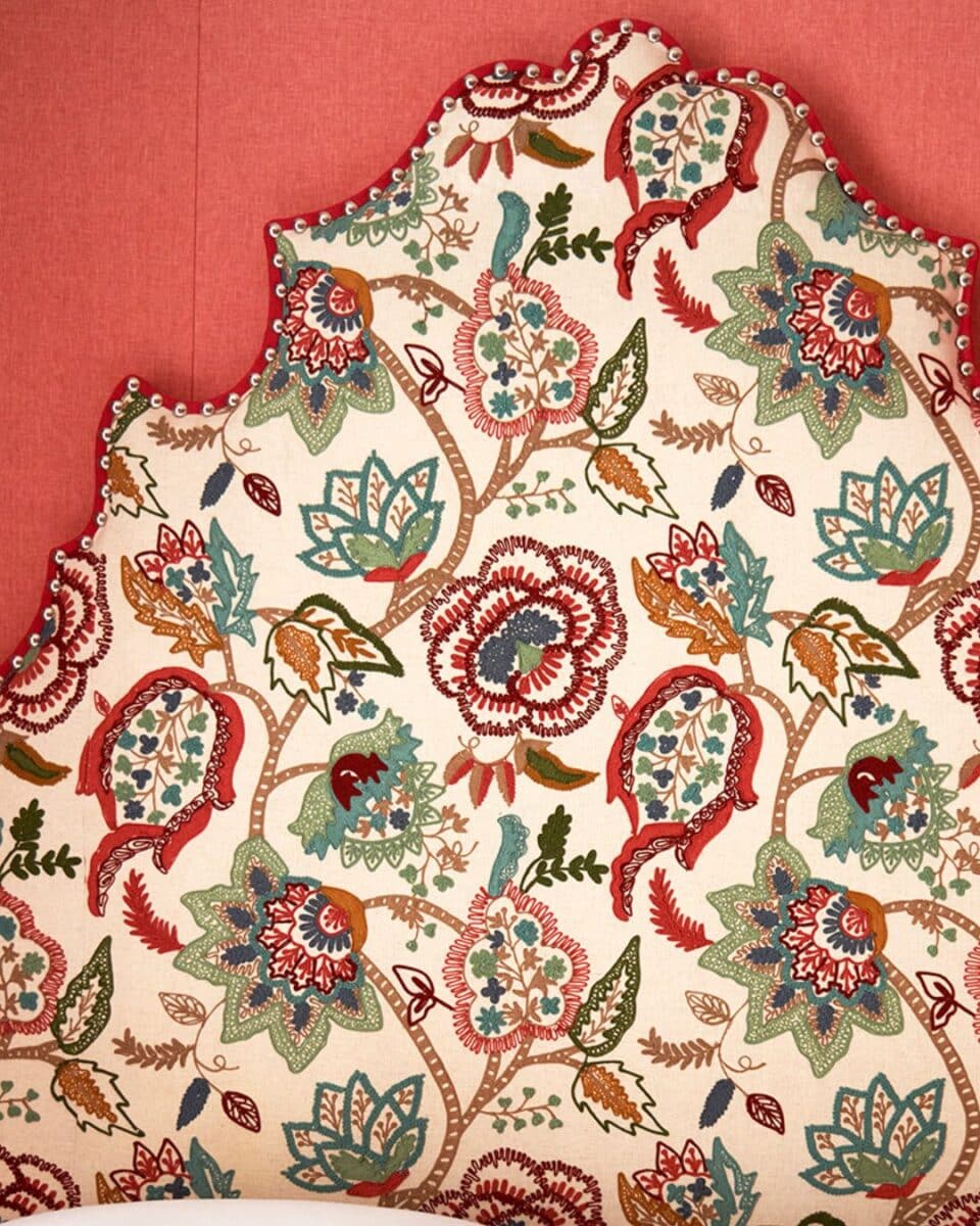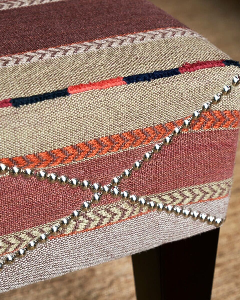 Studding can also change character depending on how it is applied. Closed studding, with small nails placed side by side, feels classic and tailored. Enlarging the studs and leaving space between them creates a lighter, more contemporary rhythm, particularly when tracing the outline of an oversized headboard or running neatly along the edge of a table. A double row of studs introduces a sense of drama, while also framing a piece beautifully and even separating two different fabrics in a way that feels almost artistic.