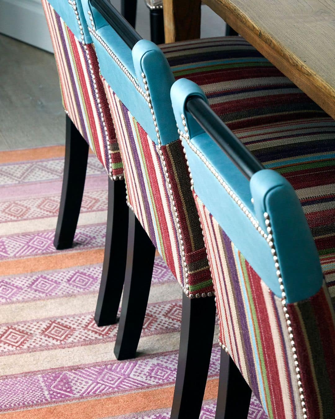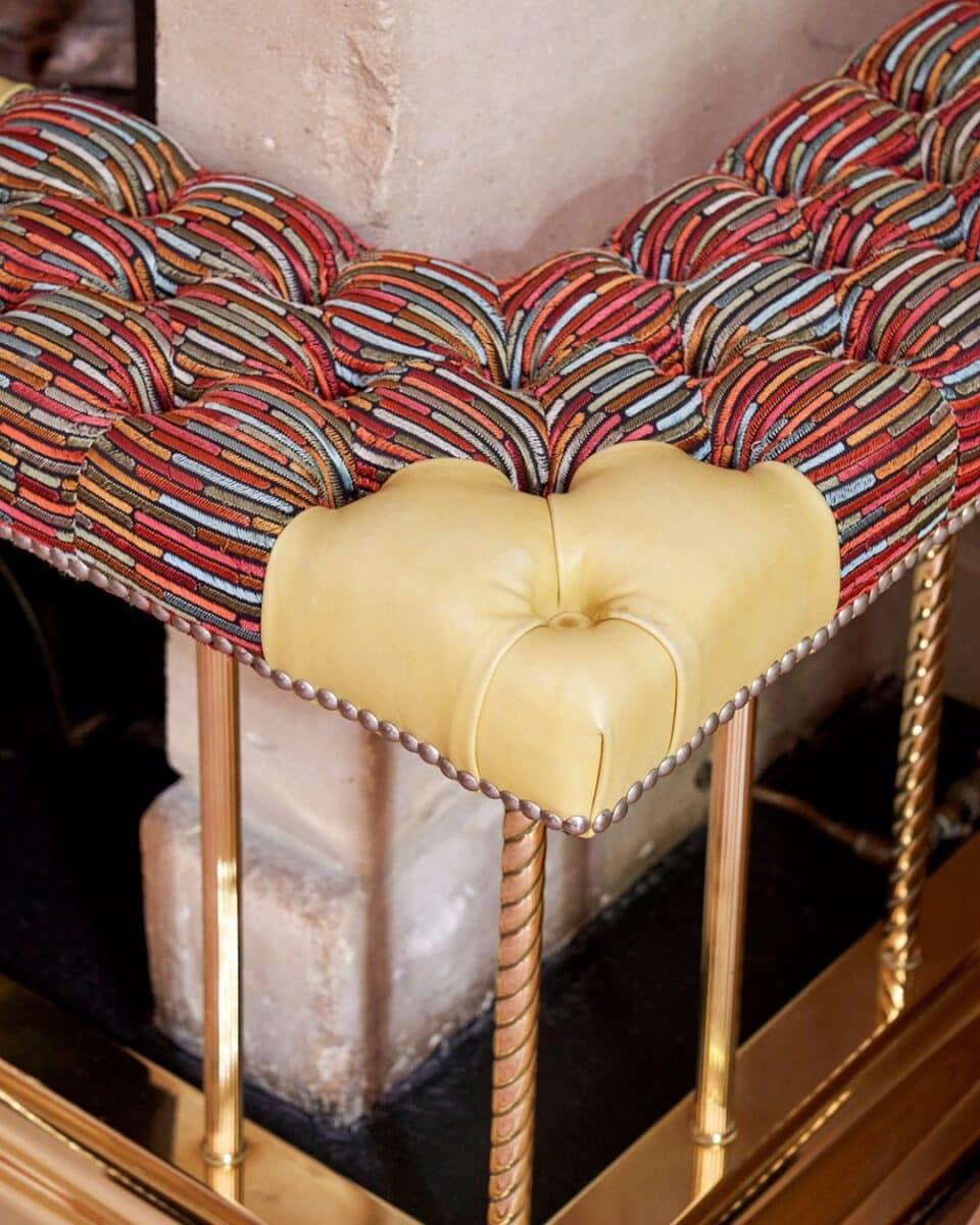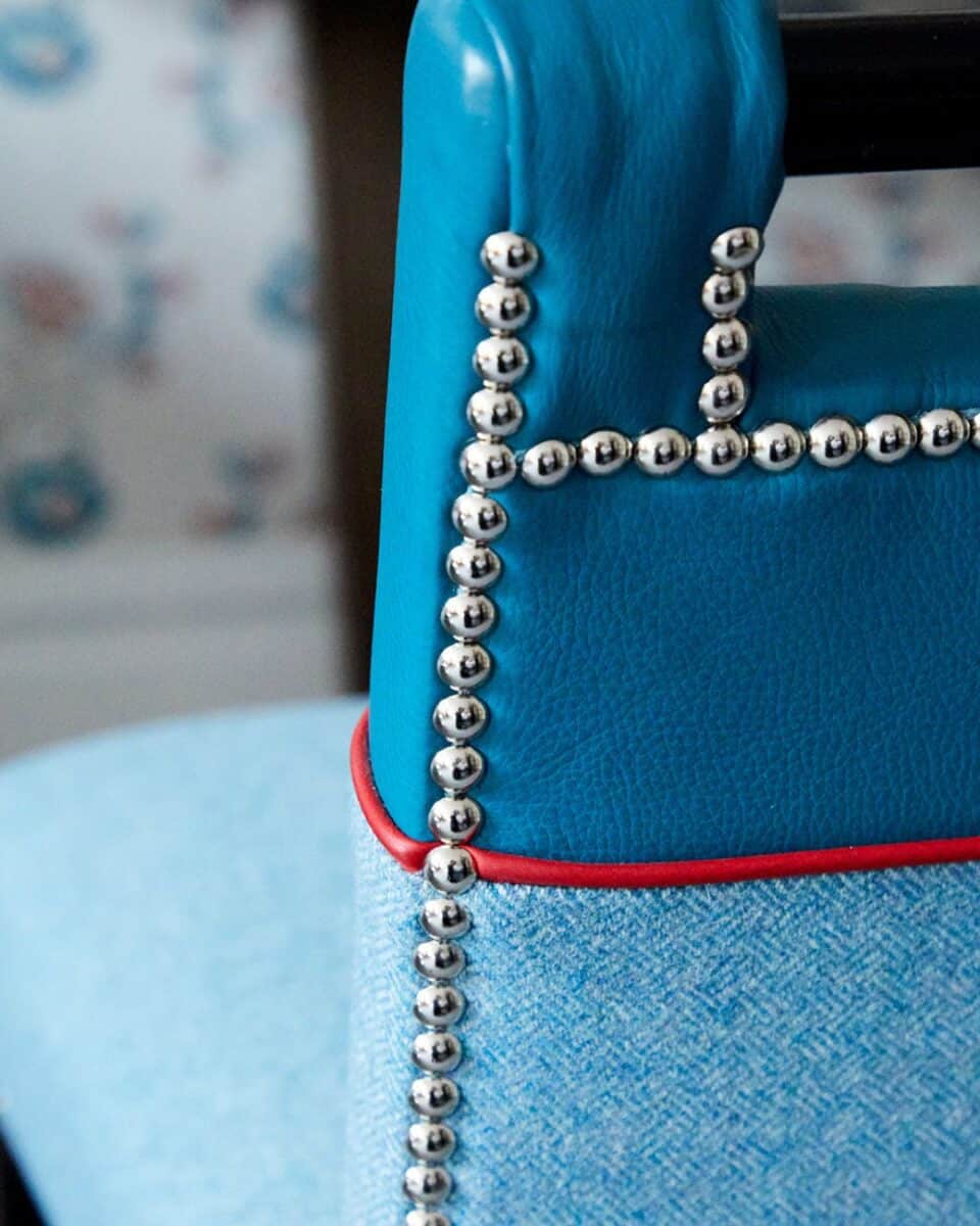 We also enjoy experimenting with scale and finish. Large, burnished brass studs feel bold and graphic, while smaller nickel or pewter versions add a refined shimmer. Against richly coloured fabrics or leather, the contrast becomes a focal point, creating an interplay of texture, light and detail. Even the smallest touches can have impact. A cluster of studs at the corner of a chair or a neat line along its legs adds subtle definition without overpowering the piece, allowing the shape and materials to take centre stage.