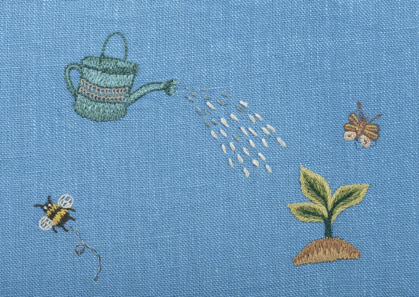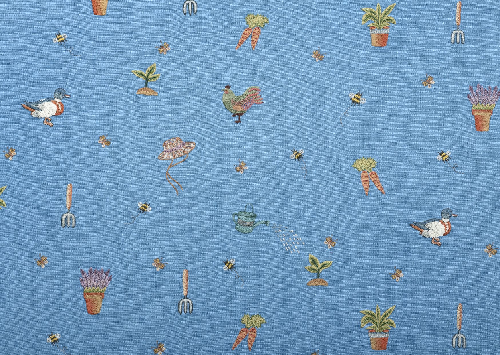 Another new fabric, designed for Chelsea Textiles, is the Garden Shed. This design tells a gentle story of country life through hand-embroidered motifs that depict gardening and simple pleasures spent outdoors.