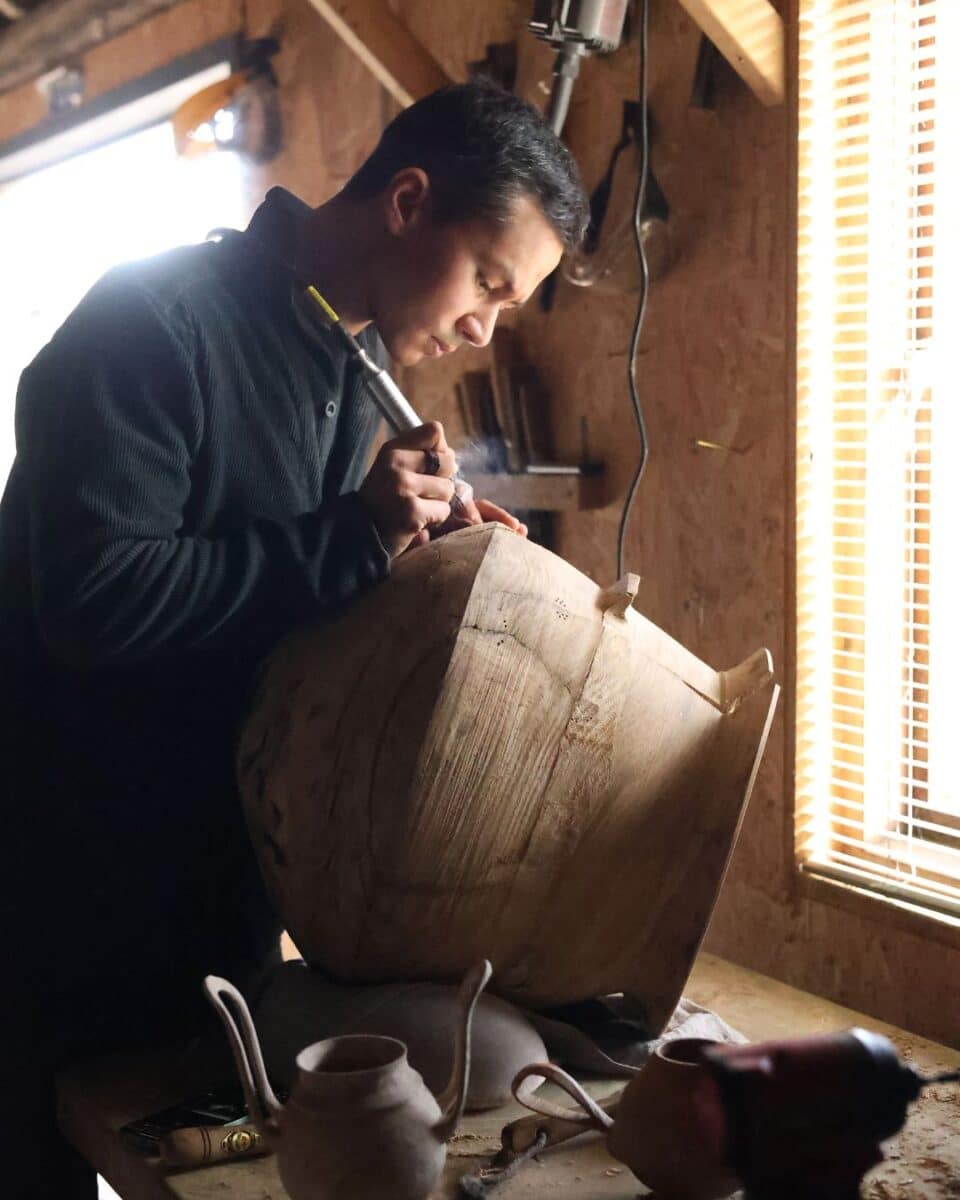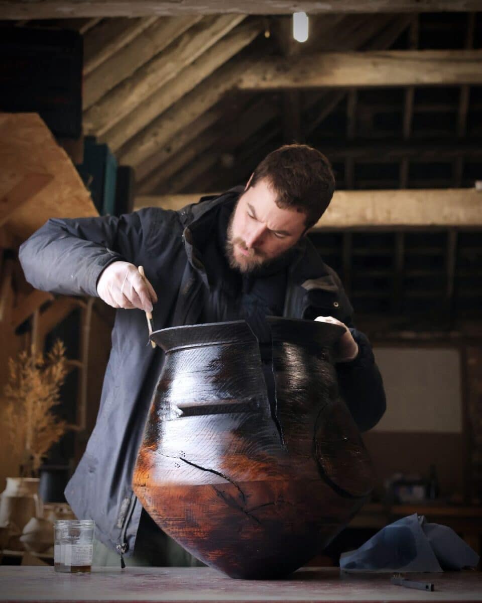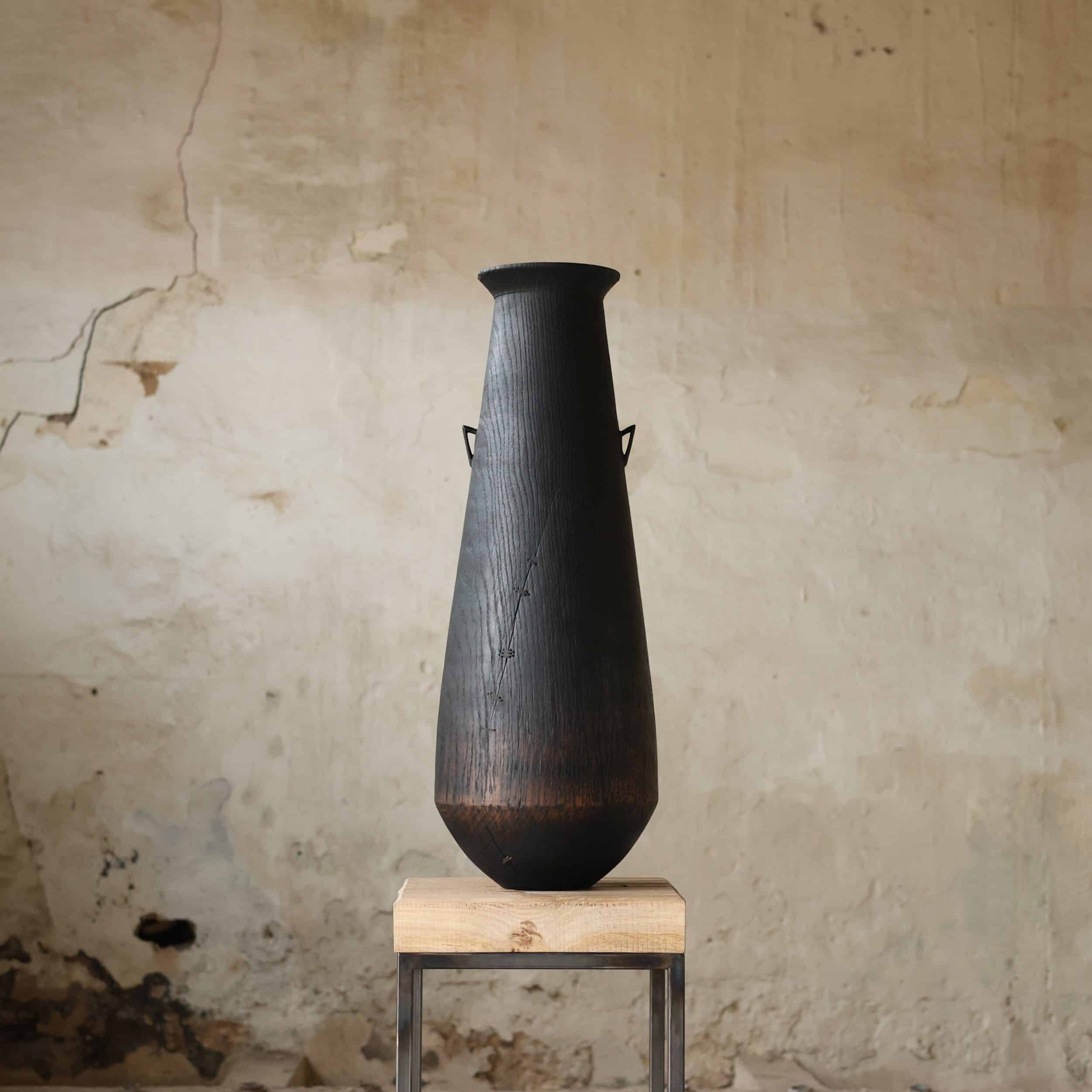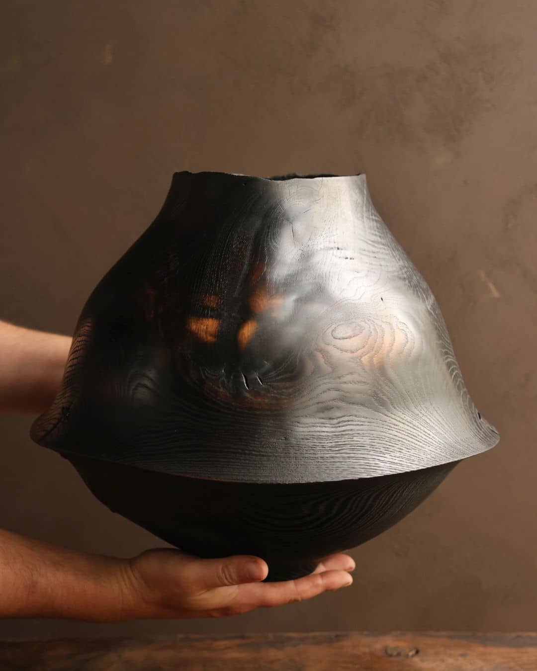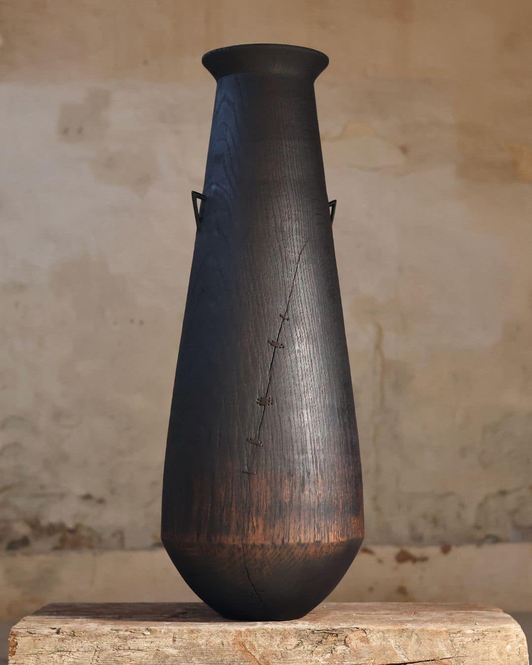 The second piece, Annulus II Vessel, is inspired by an exquisite Roman bowl. Named after the Latin word for a ring-shaped object, the vessel features a distinctive band that encircles its waist. Blackened by fire and finished with Danish oil, wax and delicate stitchwork, it celebrates the fusion of ancient influence and contemporary craftsmanship.