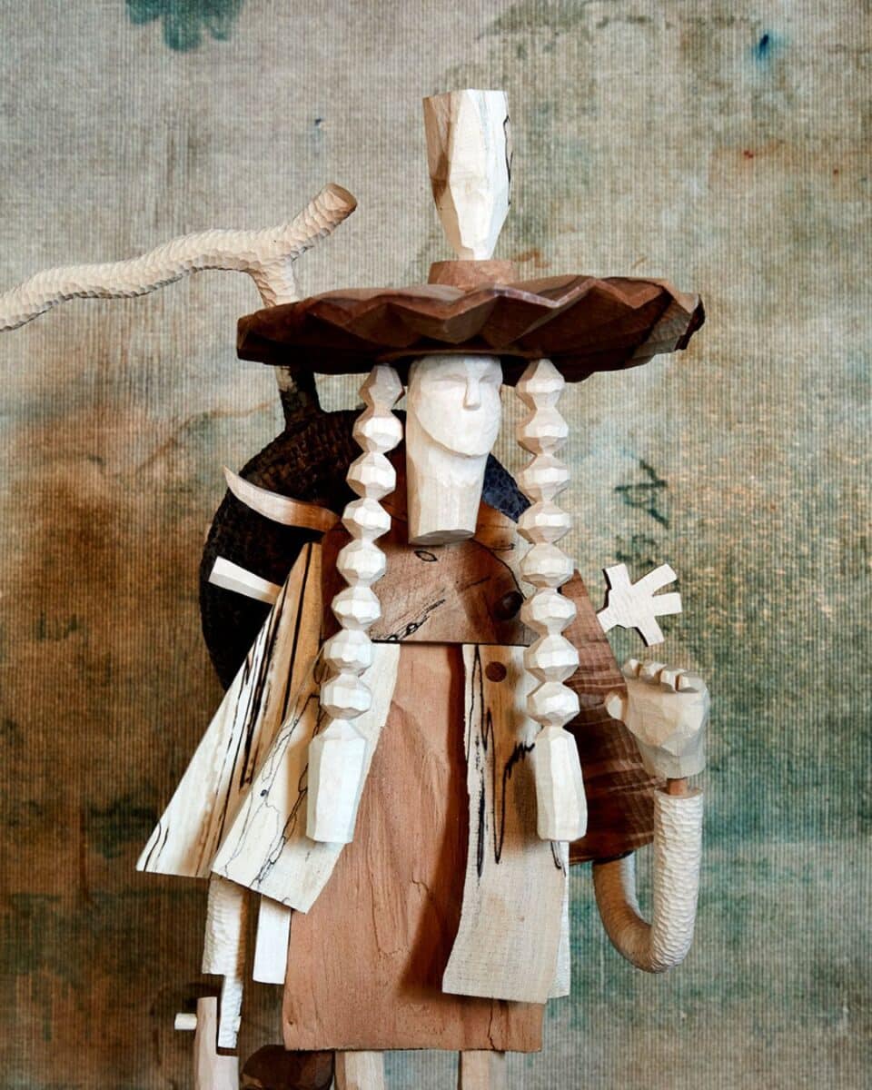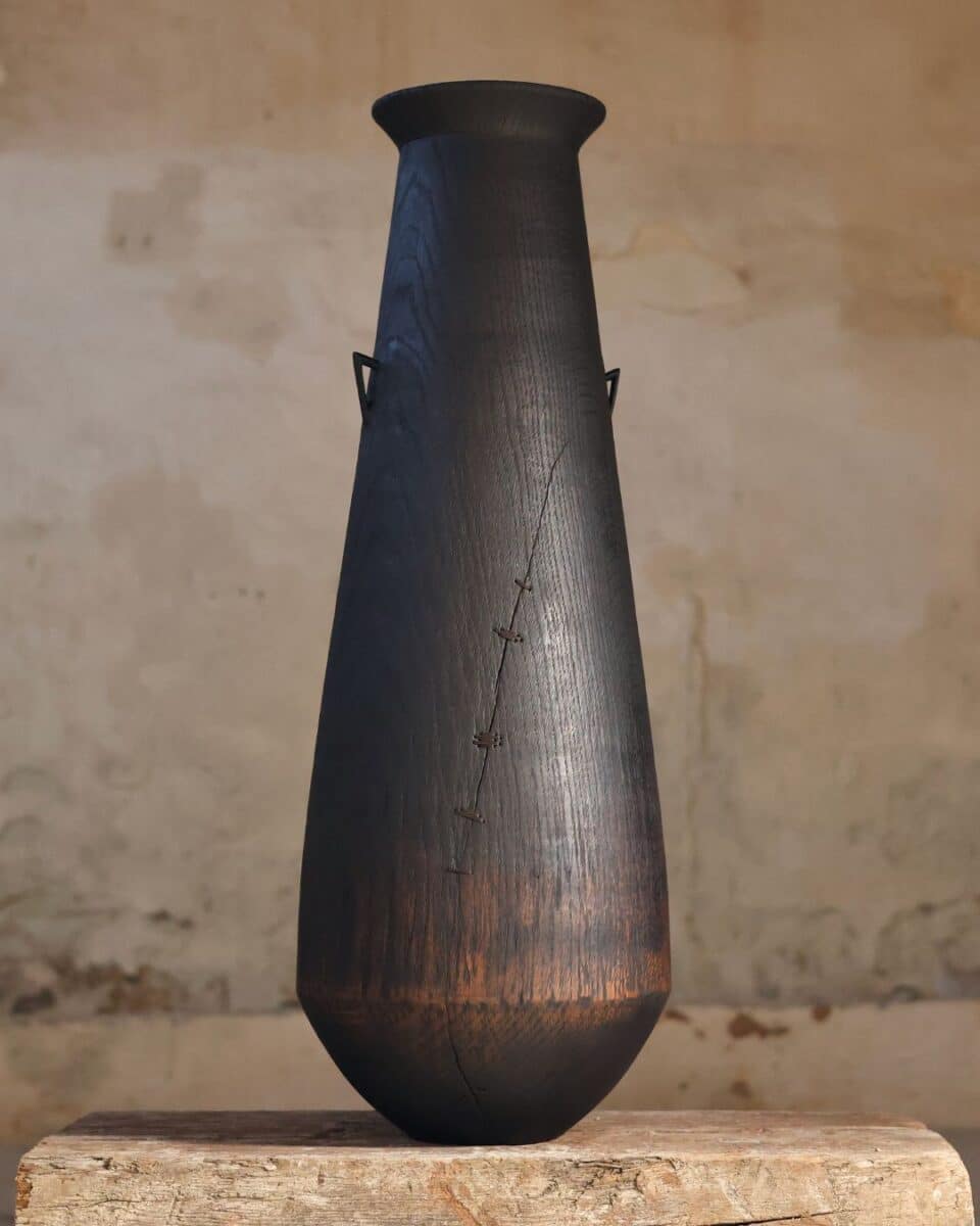 The first of the two pieces, Spire Vessel, is created from lightning-struck English oak sourced in Sussex and stitched with waxed cotton thread. It is a large, wood-turned vessel treated with fire and lime, then oiled and buffed to achieve a rich, leathery patina with deep earthen hues. With its hand-carved handles and bold, spire-like silhouette, the form feels both timeless and powerful.
