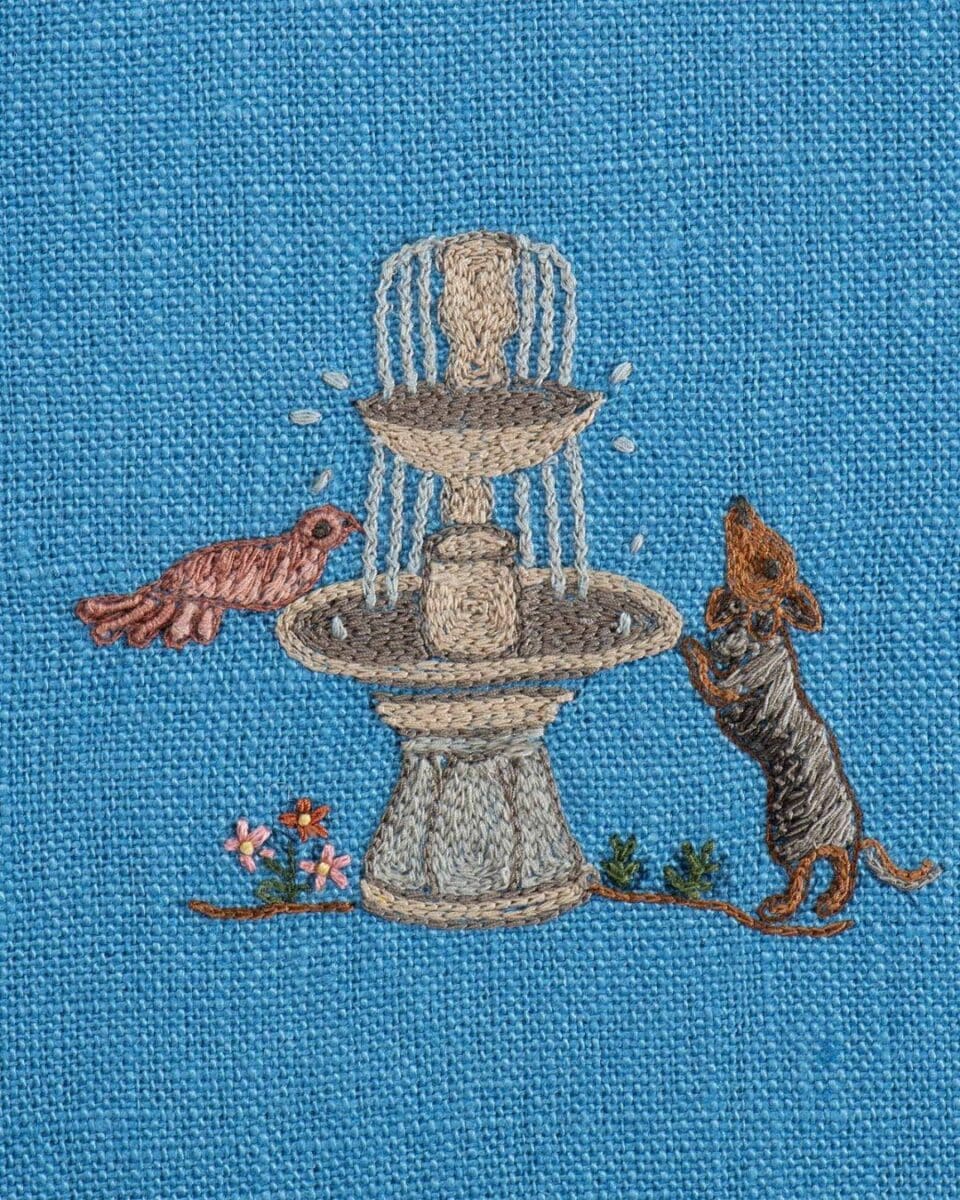 Toss a penny and make a wish. A playful pup and its feathered friend splash joyfully by the wishing well, each embroidered ripple capturing the timeless beauty of the English countryside.