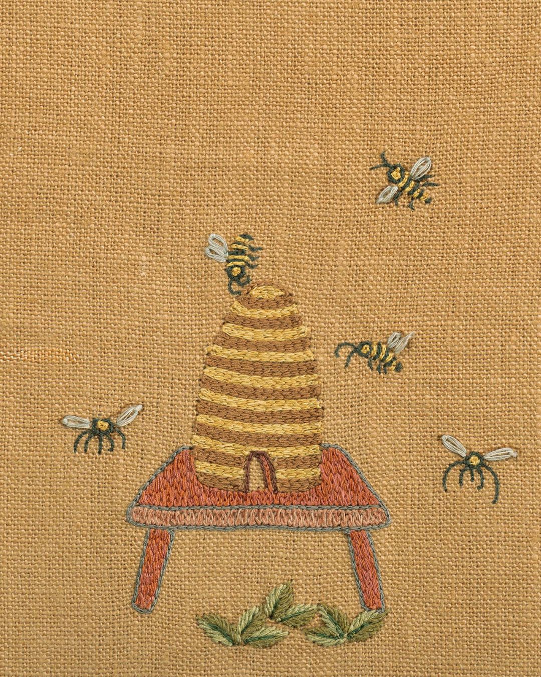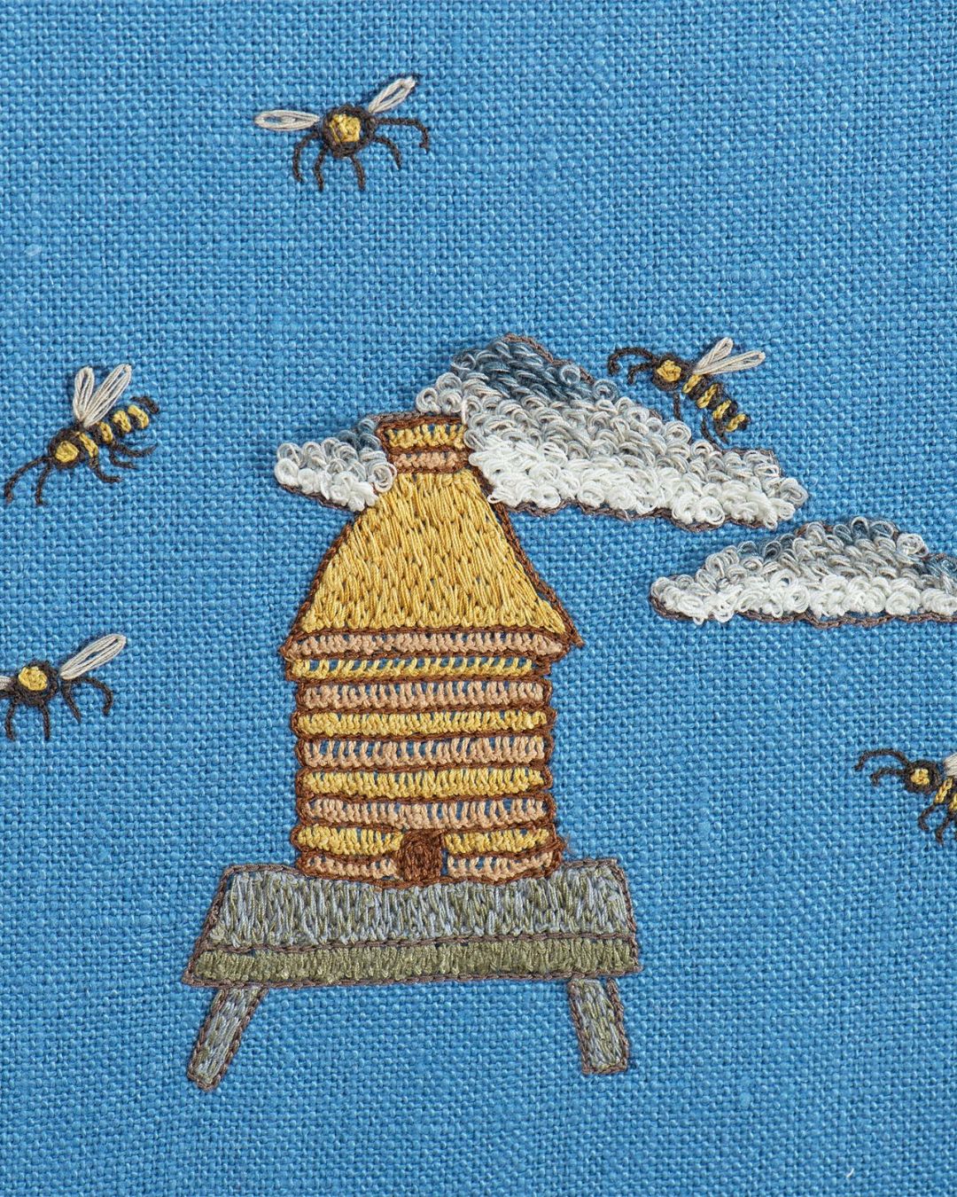A lively linen embroidered with bustling bees and their honey-laden hives. Each delicate stitch celebrates the vibrant life of nature’s hardest workers, their rhythm and energy woven into every thread. This fabric hums with character, craftsmanship and charm.