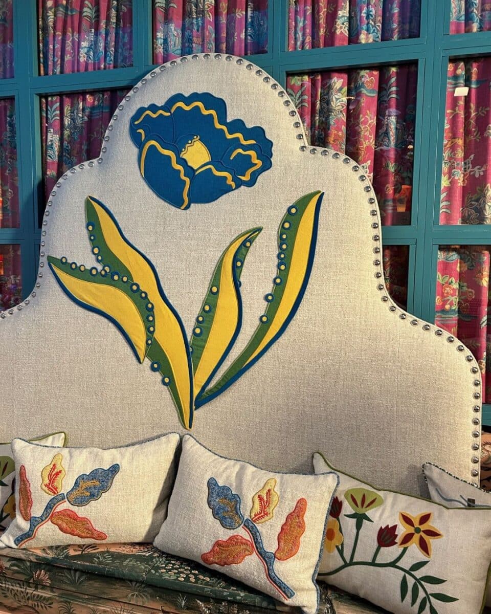 Our handmade cushions lined the banquette beneath the magical Martha Freud pots, each one a miniature work of art. The Flower Power Pink Cushion brings artistic flair with its detailed appliqué flower design in pink, blue and brown, finished with playful blue herringbone piping. Complementing this, our Rick Rack Cushions add a fun pop of pattern, while the Bolster Little Weed Cushions lend a cheerful touch. Together they create a vibrant mix full of personality and charm.