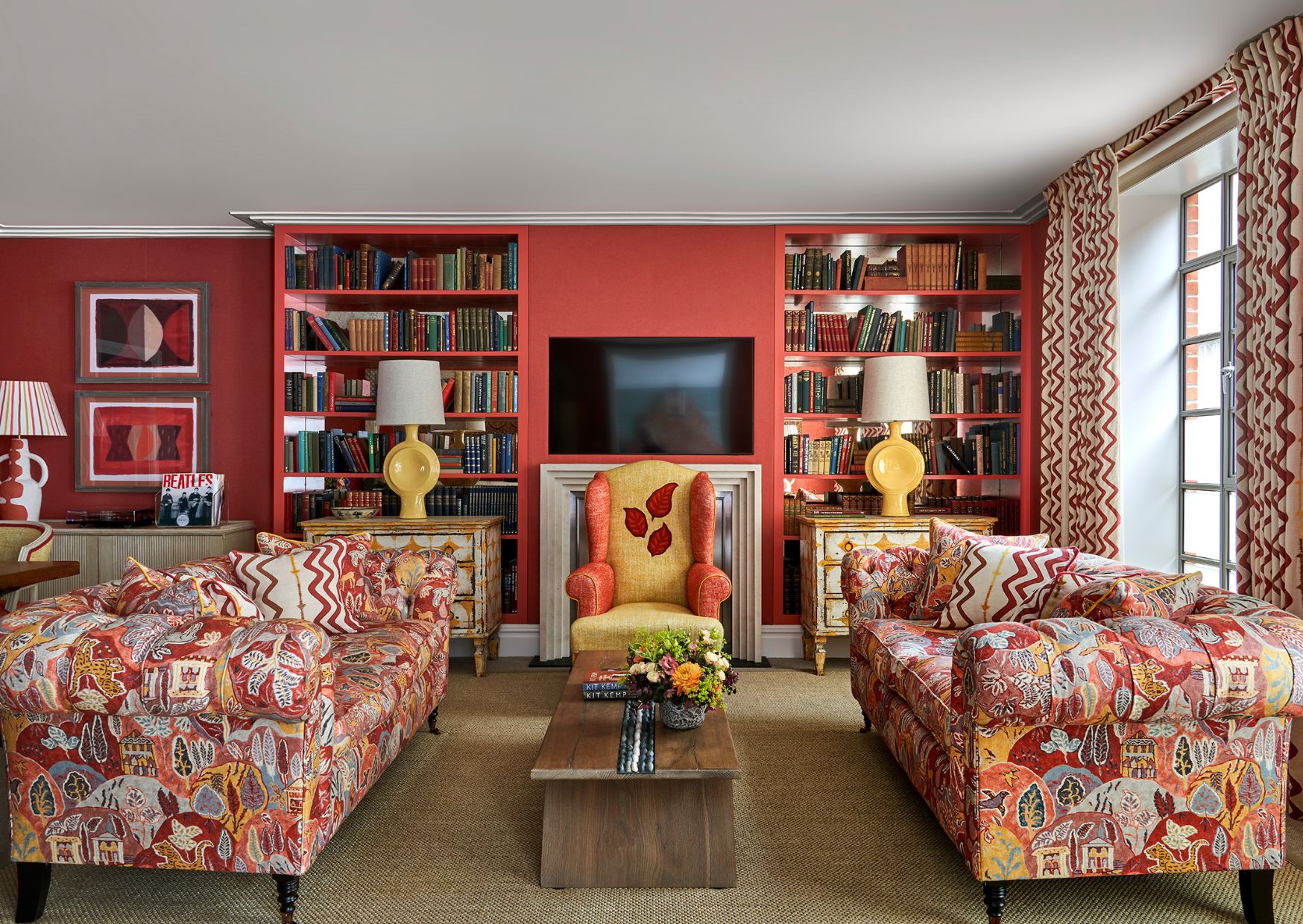Upon entering this suite, guests are greeted by soft red walls. In the seating area, two Chesterfield sofas upholstered in Panjim evoke the feel of a tapestry. Glowing reds and golds harmonise with carefully curated furniture and lighting, creating rhythm, cohesion and a lively, conversational space.