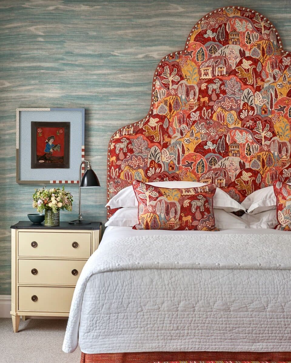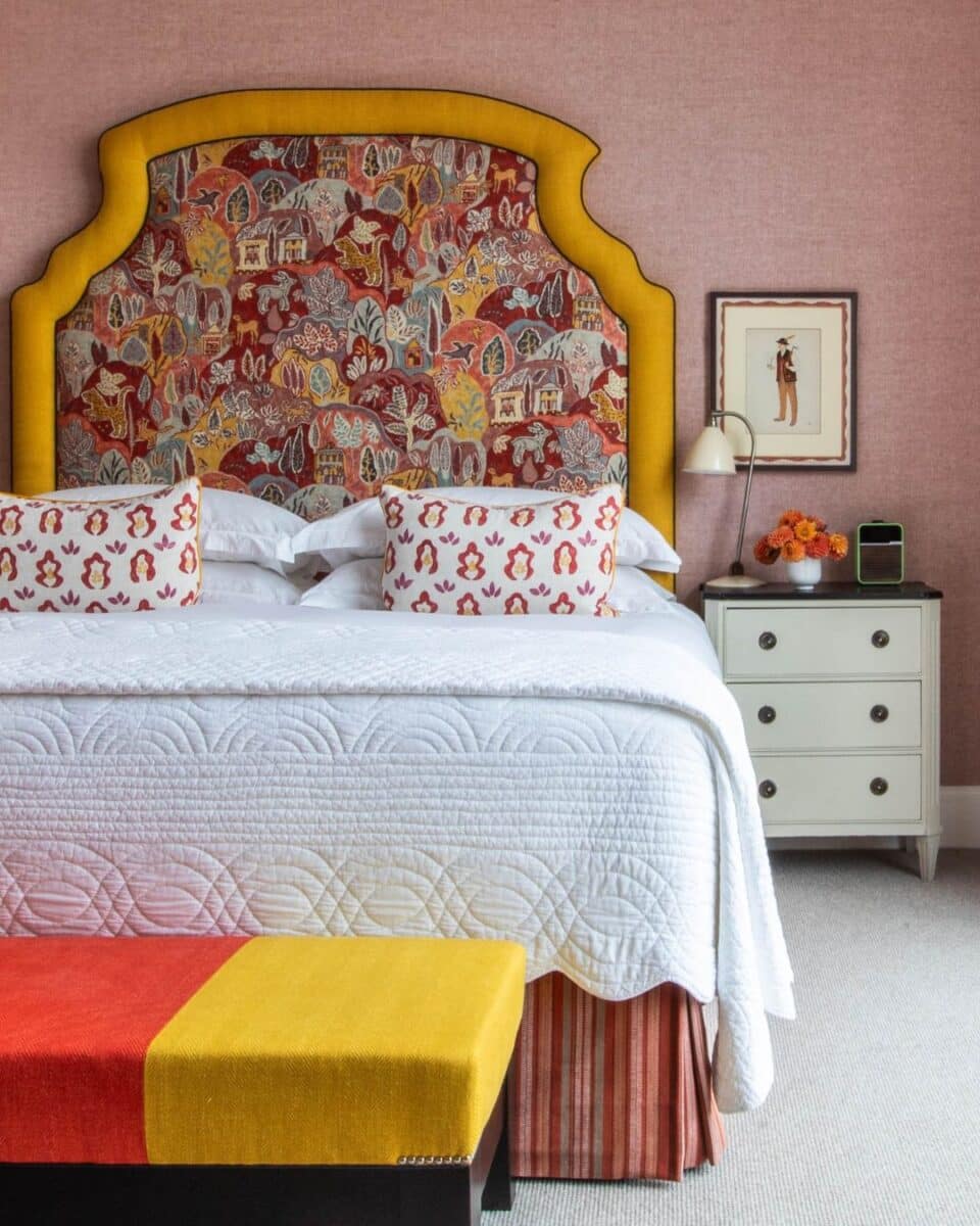 The fabric is also continued on the headboard, paired with our Puff fabric, tying the suite together beautifully.