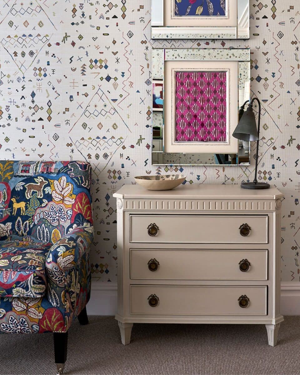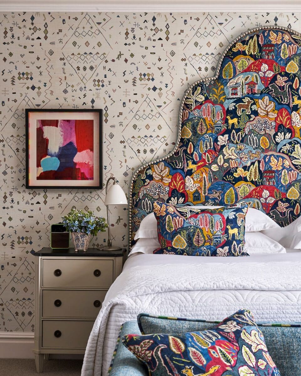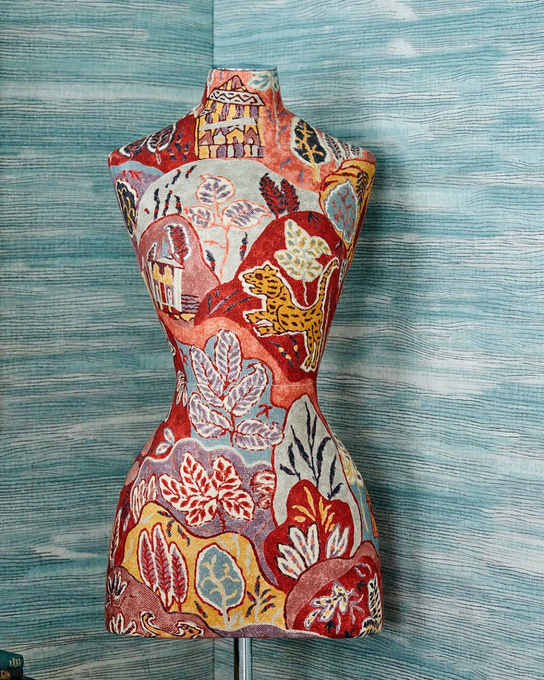 In this room, we opted for the multi-colourway with a blue-led palette softened by accents of pink, green, and yellow. Unlike the Crosby Street Hotel room, Panjim here sits against raffia wallpaper with graphic motifs, layering pattern rather than hiding it. A solid blue sofa anchors the room, providing a visual pause that balances the playful energy.
