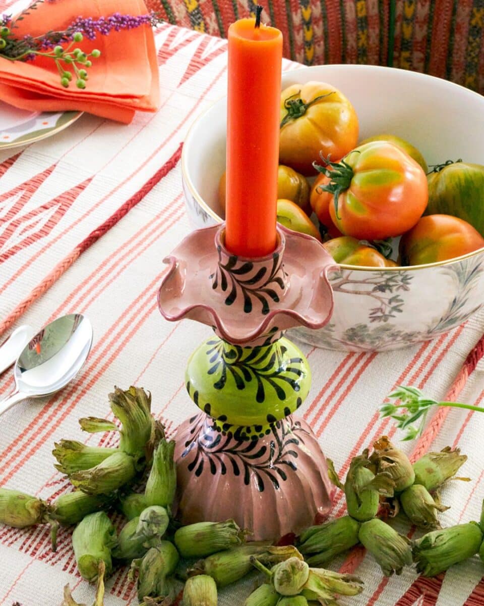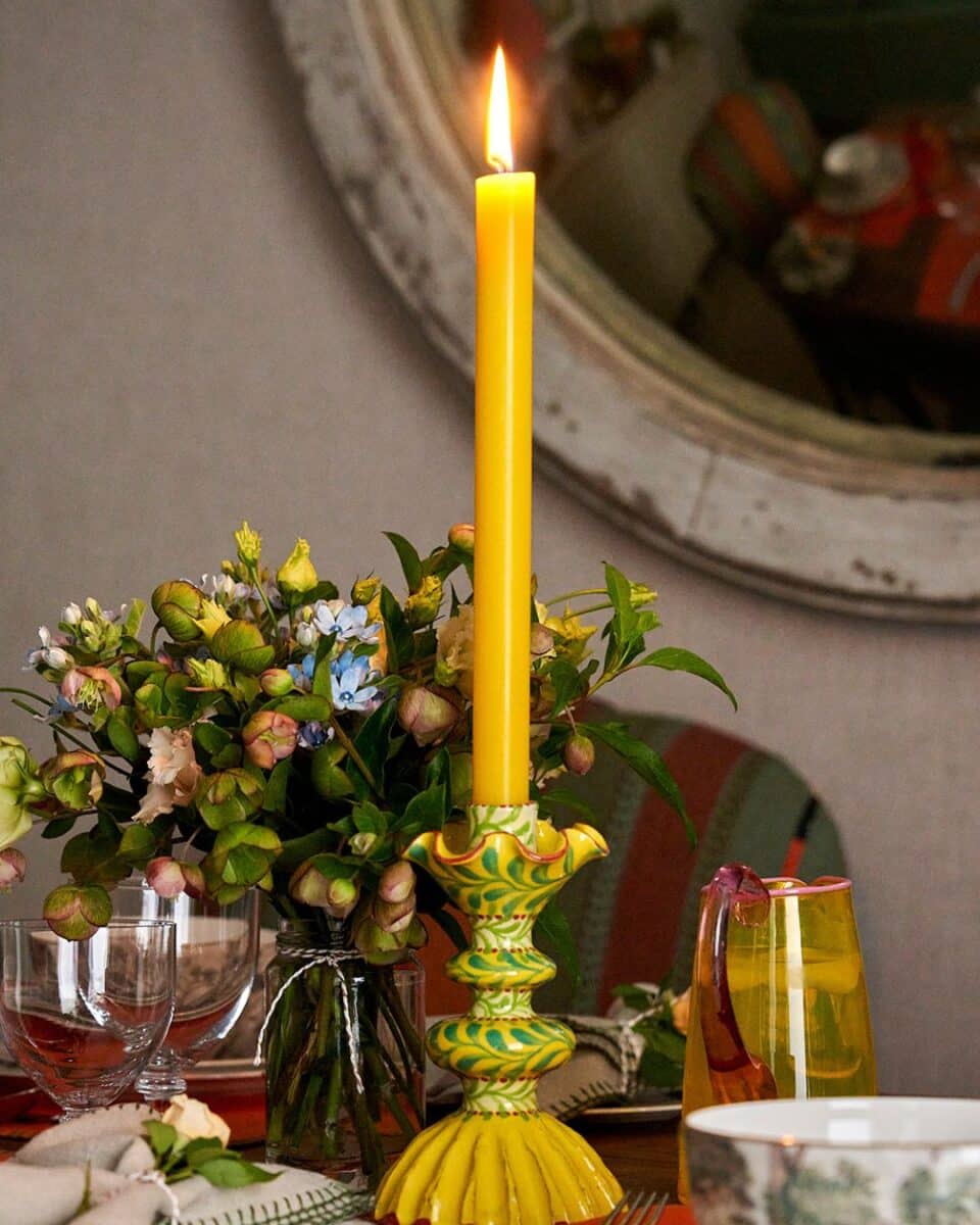 While classic ivory candles are timeless, colourful tapers can bring a playful twist to your table. Try rich orange candles, warm, glowing and full of seasonal spirit. Their soft amber light adds depth and vibrancy, echoing the tones of autumn leaves and pumpkin pie. Group them in varied heights and holders for a layered, painterly effect that feels both joyful and inviting. The glow feels even more magical when colour meets light.
