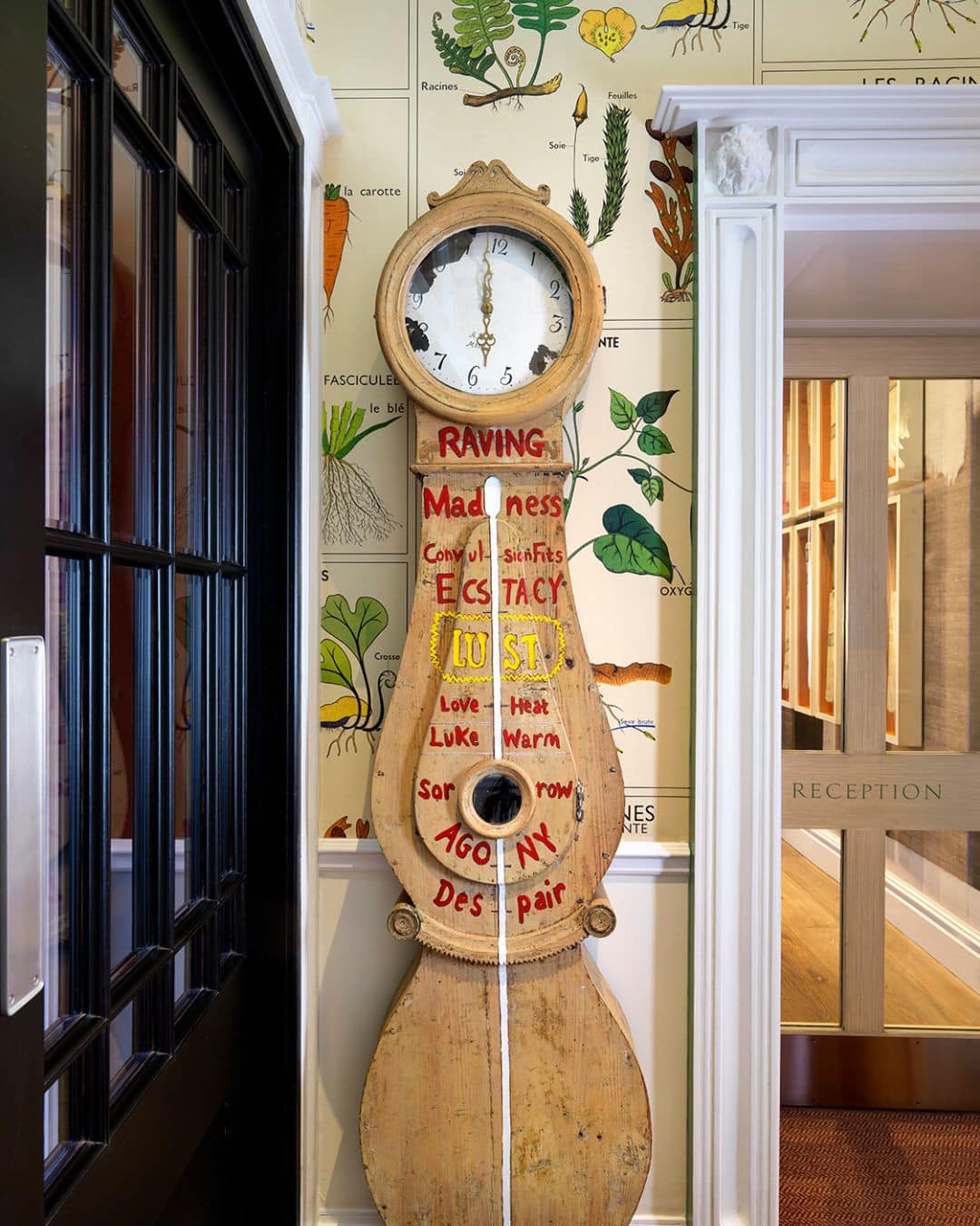 Nearby, a beautiful contemporary take on a grandfather clock stands proudly on a narrow wall. Areas like this can be tricky, large enough to feel empty if left alone yet too small for much else. Introducing a piece of functional yet playful art provides the perfect solution. This grandfather clock ticks away the time while bringing a touch of wit to the room.