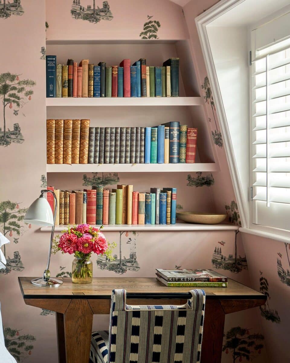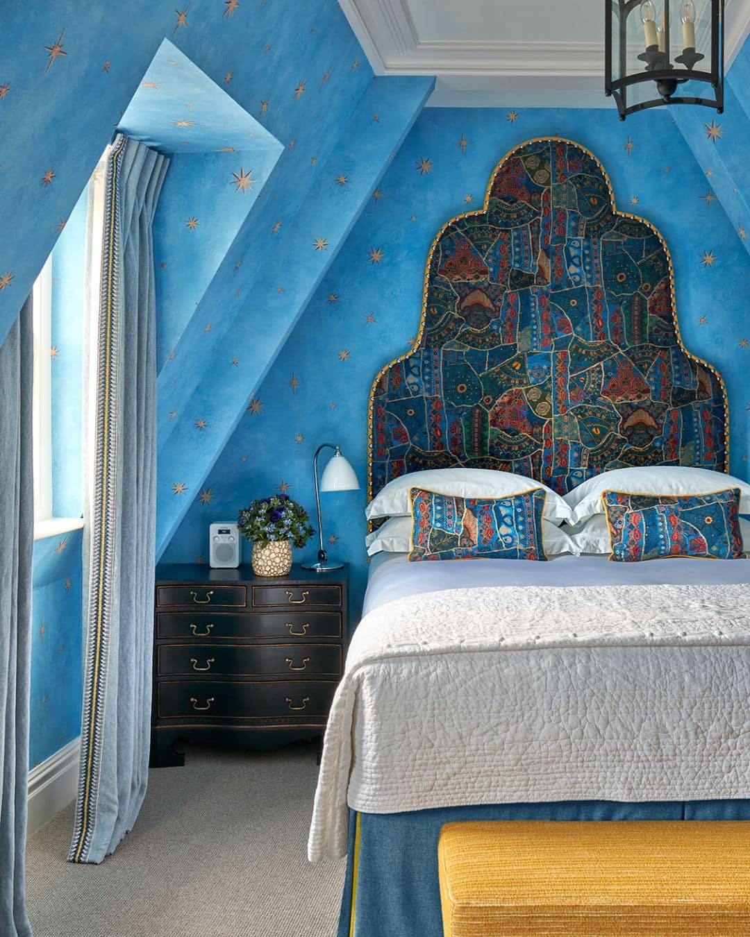 Upstairs, in one of the attic bedrooms, we celebrated the sloping eaves with a ruby headboard that follows the dramatic line. Instead of hiding the eaves, we allowed them to shine. The result feels both grand and cocooning, a little theatre of pattern and shape.