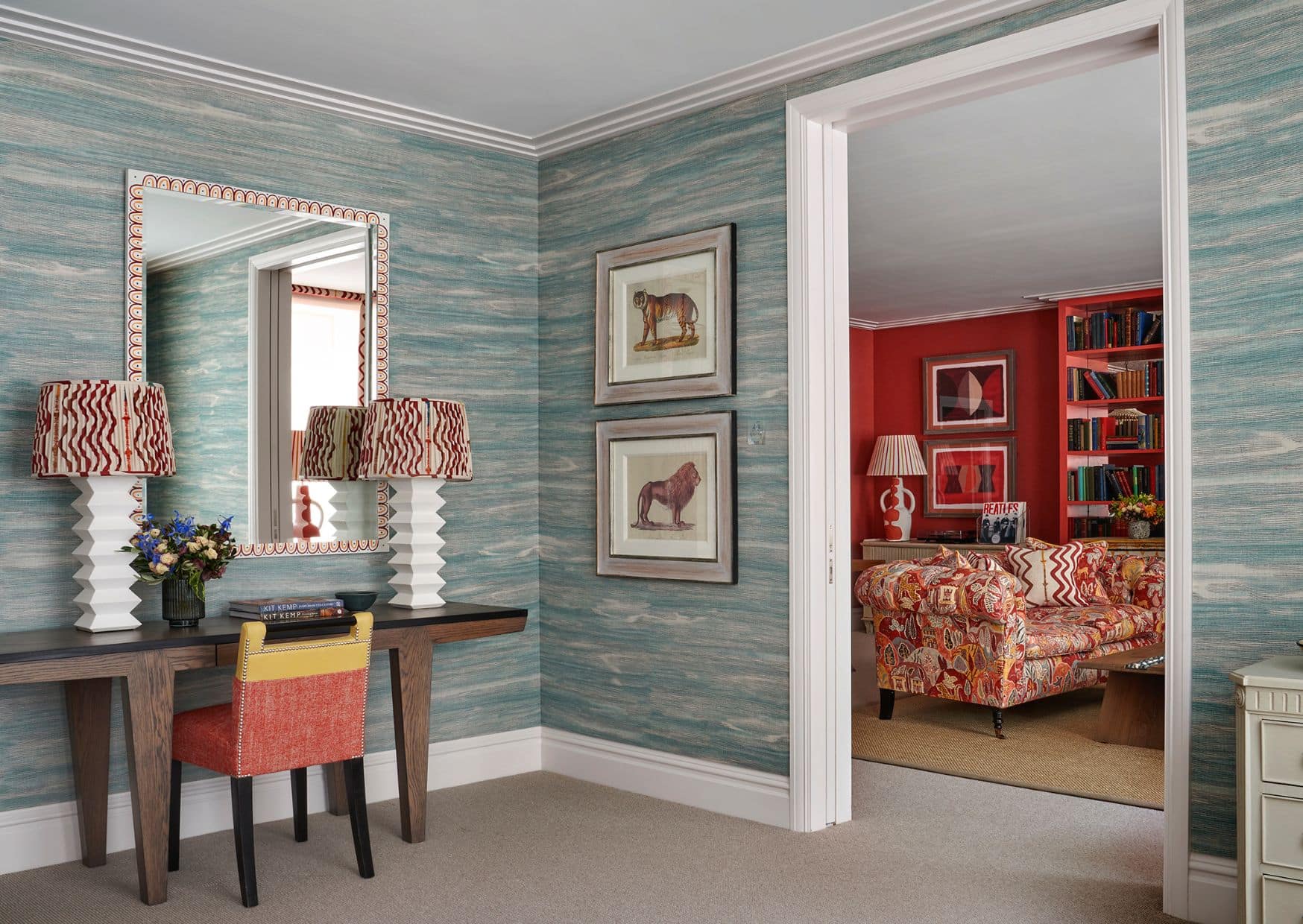 Above the desk, a hand painted mirror is paired with lampshades in our Rick Rack fabric, reinforcing a sense of craftsmanship and individuality.