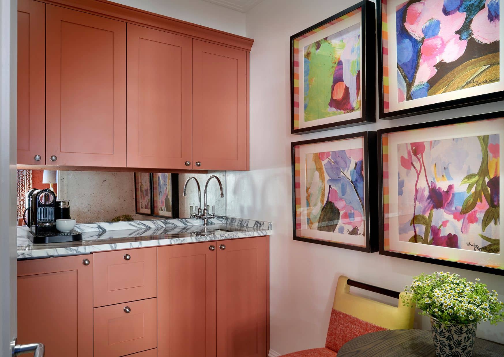The compact kitchenette has also been enhanced, with painted joinery adding a playful note. The scheme is further enriched by prints from artist Shilo Engelbrecht, whose contemporary abstract works in paint and collage help tie the space together.
