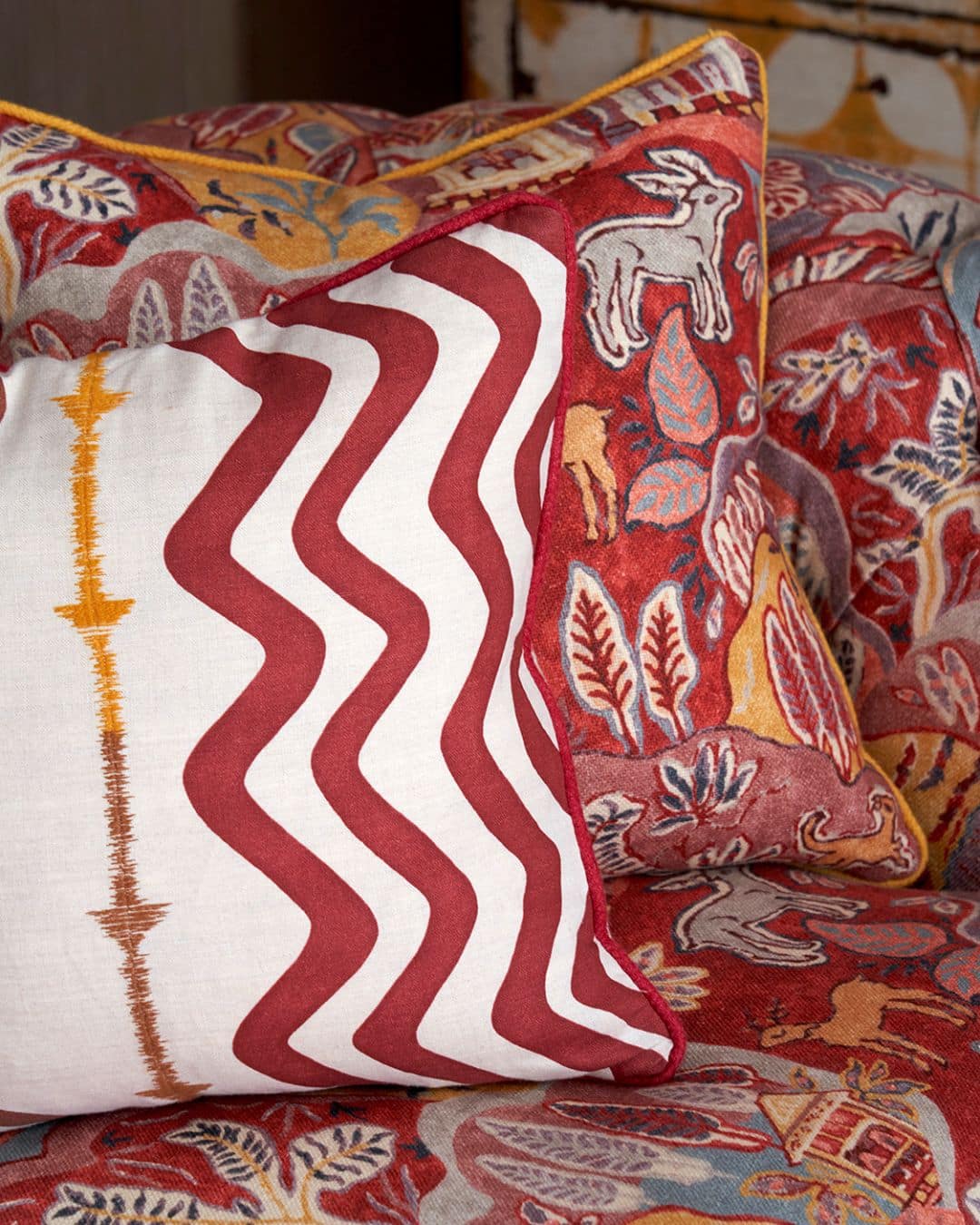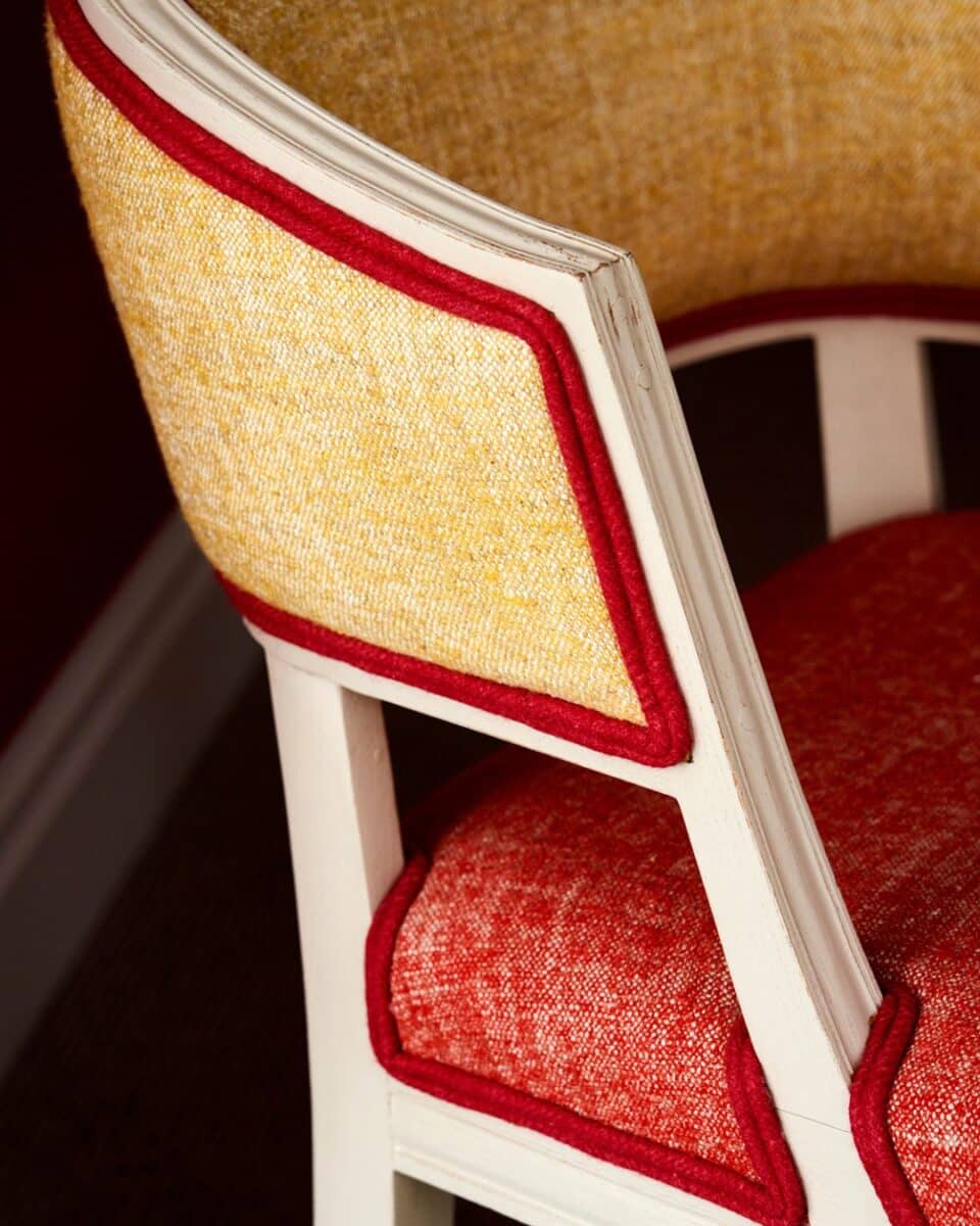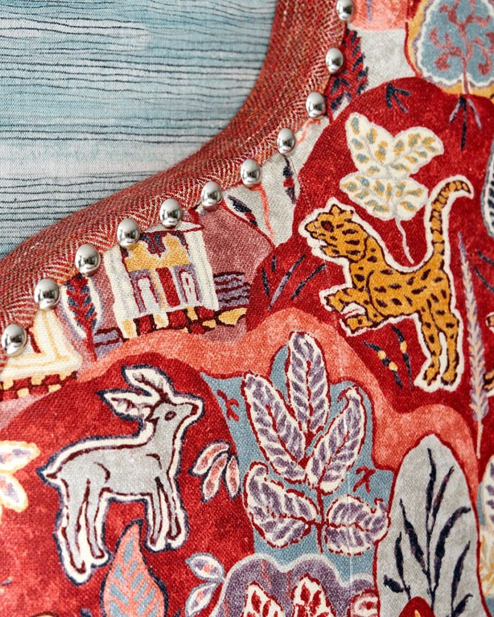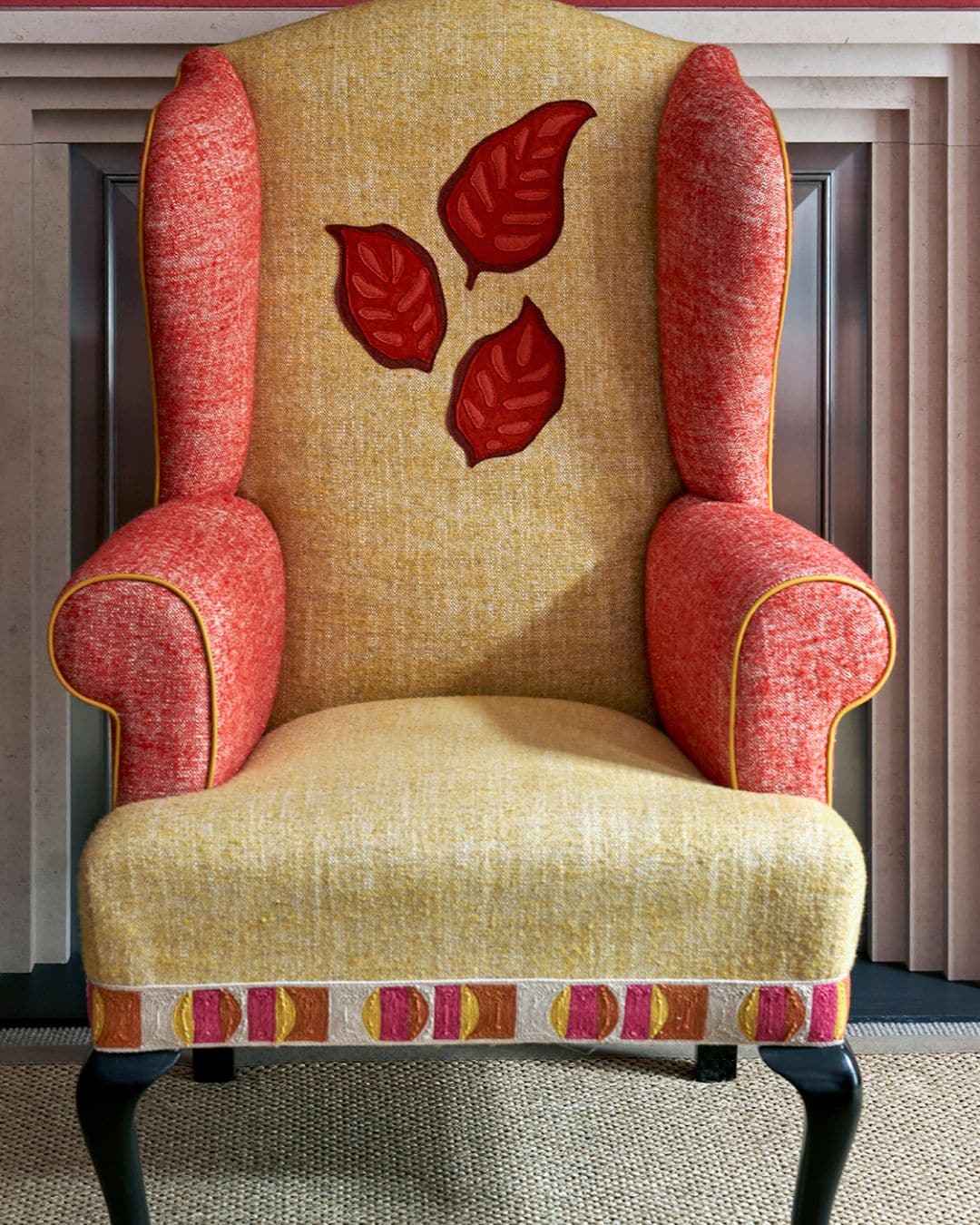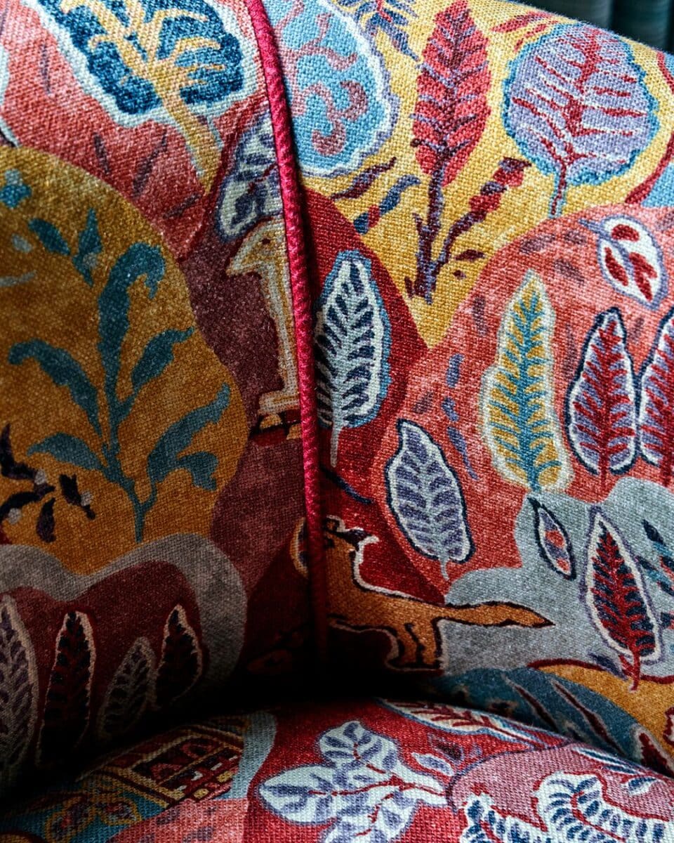 The sofas are upholstered in Panjim, a scenic printed fabric full of foliage and animals that introduces colour through accents of soft yellow, blue and purple. Its scale and pattern, combined with our classic deep buttoned Chesterfield sofas, create the feel of a cherished and unique piece. Our signature Kit’s Wing Chair, upholstered in bold yellows and oranges, adds contrast and helps ground the room. Leaf appliqué details gently reinforce the overall theme.