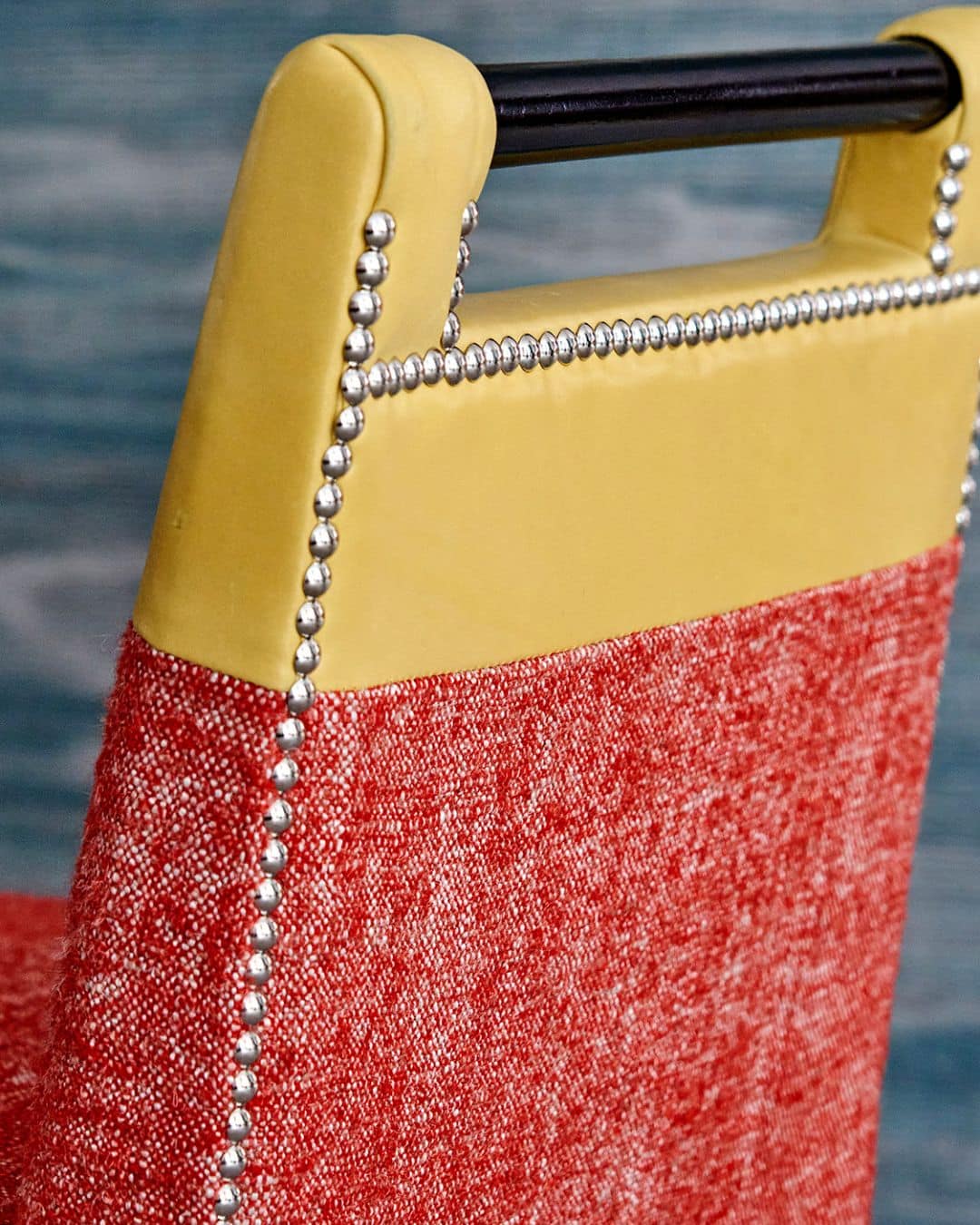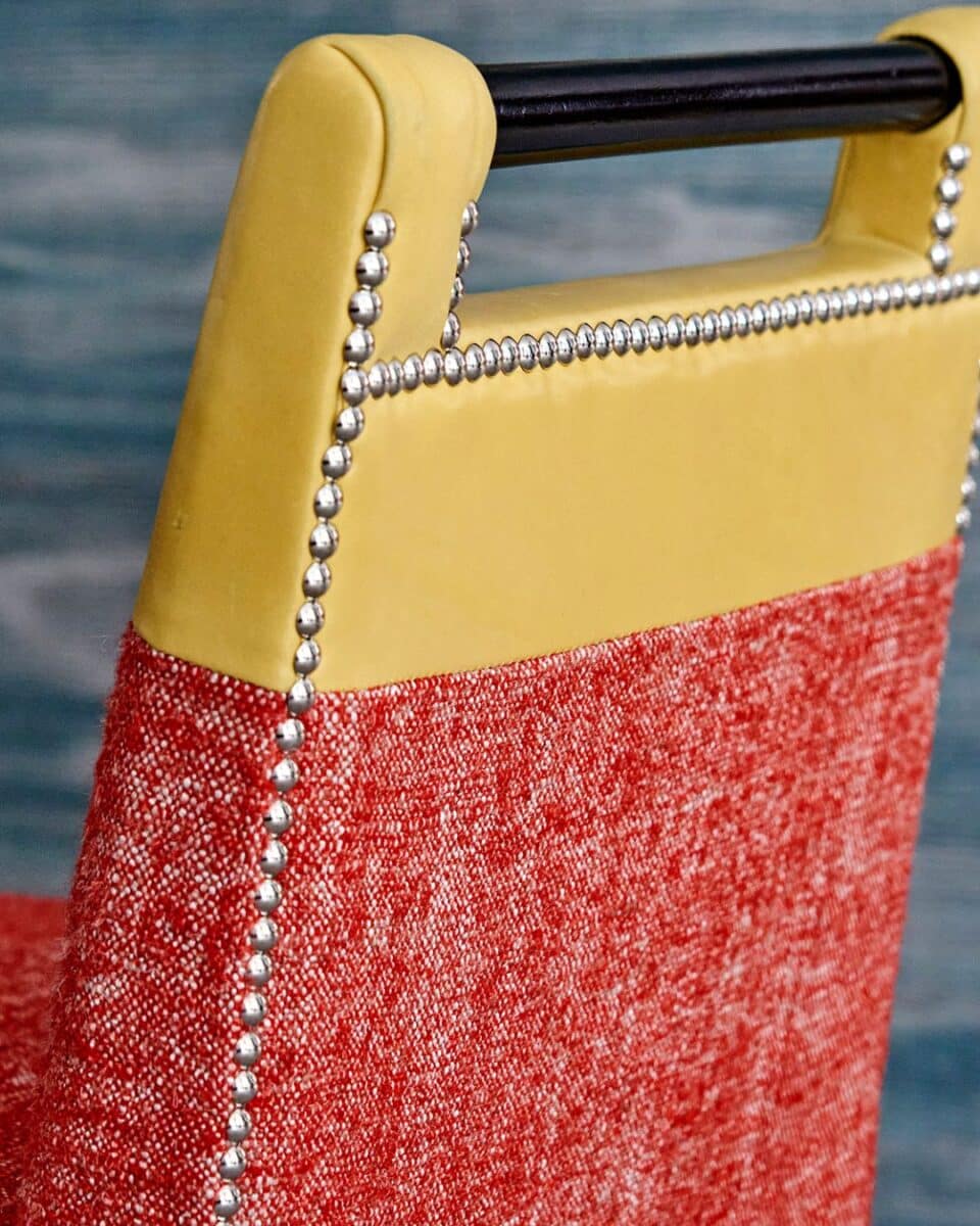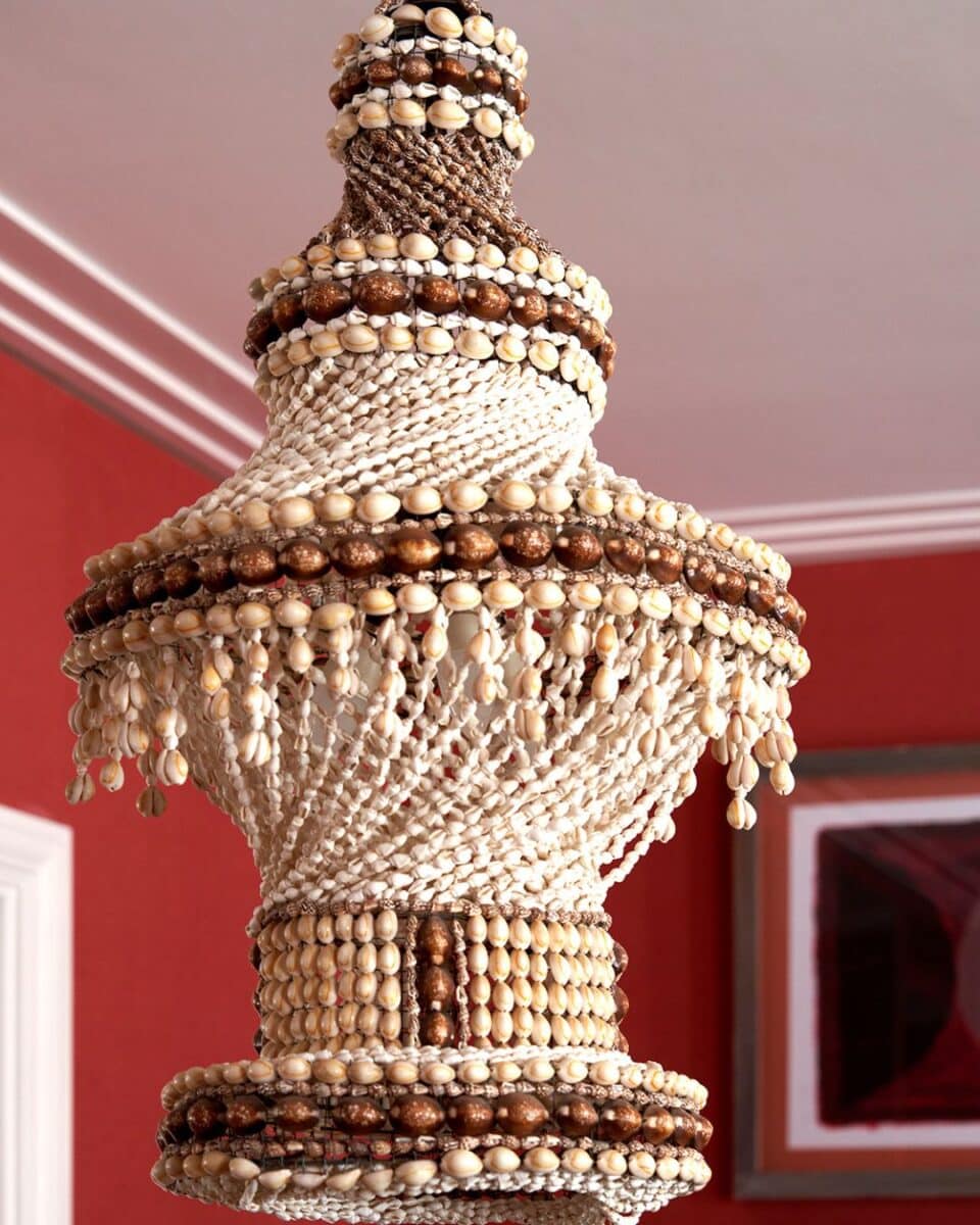 In the dining area, a combination of our Handle and Whitby chairs in orange and yellow brings energy and lightness. To ensure the space never feels cold or impersonal, we have layered in antique pieces. A solid wooden table acts as an anchor, while an antique mirror behind it reflects light and subtly expands the room. Above, a shell chandelier, a characterful found piece, adds texture and personality.