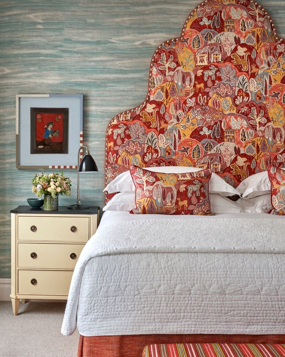 In the bedroom, we continue the narrative of the seating area by making this Clarence House fabric the star of the show. Upholstered on a Flora headboard with widespread nickel studding, it becomes the room’s focal point. For the walls, we used Puff, our fabric for Andrew Martin. Its varied blue tones add texture and depth while creating a calming, cloud like effect, somewhere between sky and sea. The curtains are finished with our Pop Art trim, giving them a playful edge and helping them stand out.