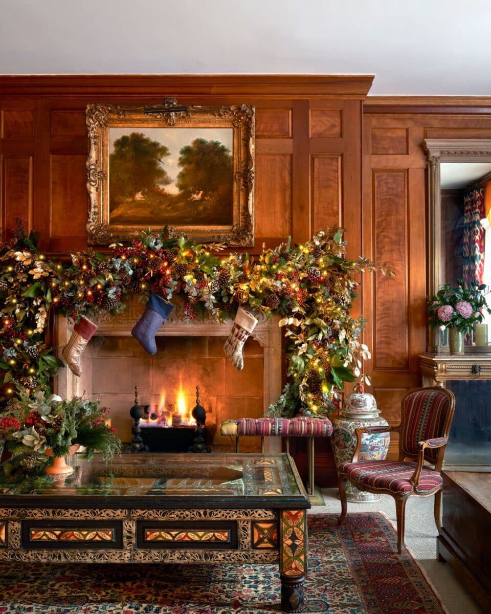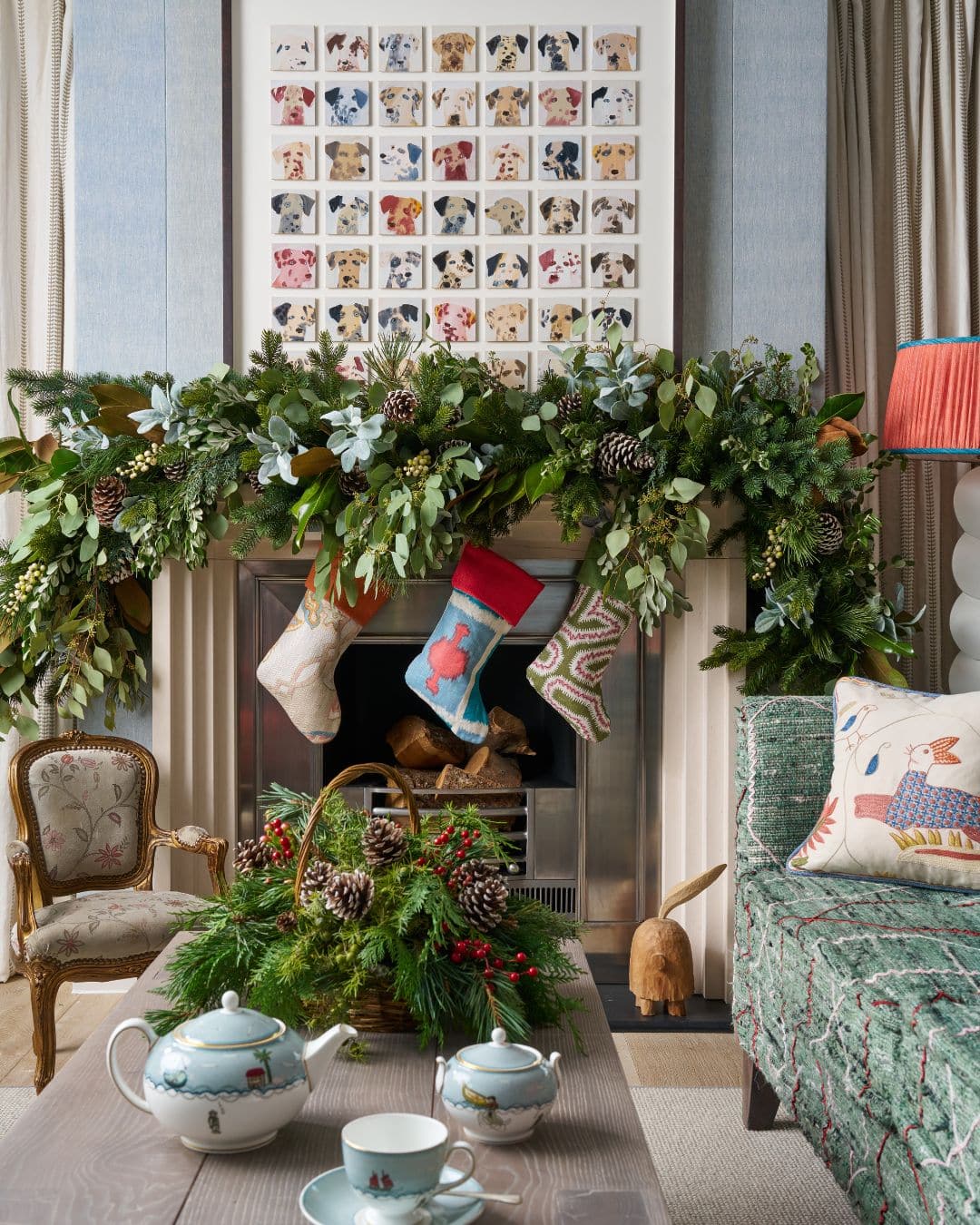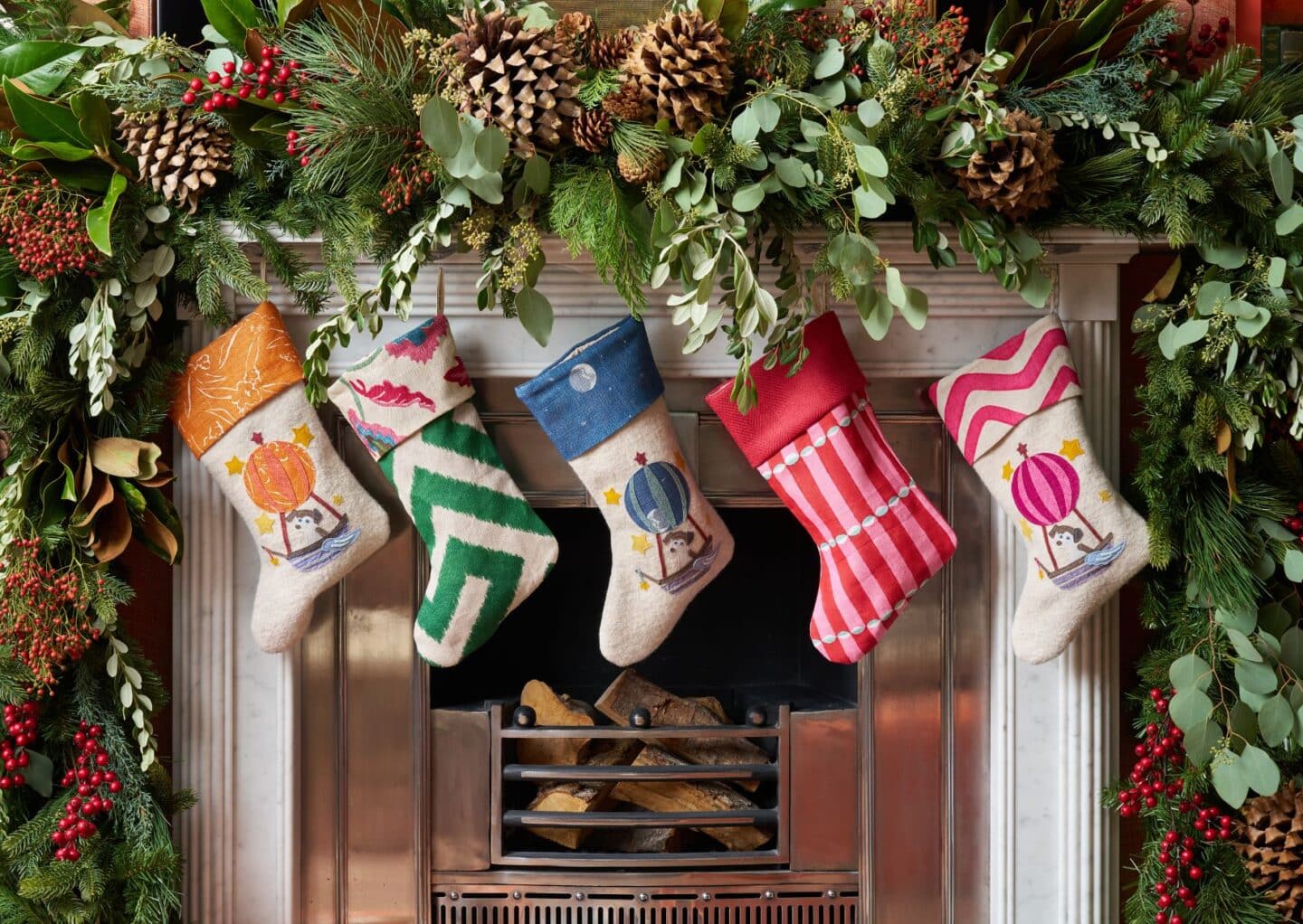 A decorated fireplace instantly brings festive flair to a home. The entryway for Father Christmas should be warm and welcoming, and pine garlands will not only make your home smell wonderfully festive but will transform any space into a Christmas haven. We love to hang our hand-embroidered, colourful stockings over mantelpieces for an added touch of magic and decoration.