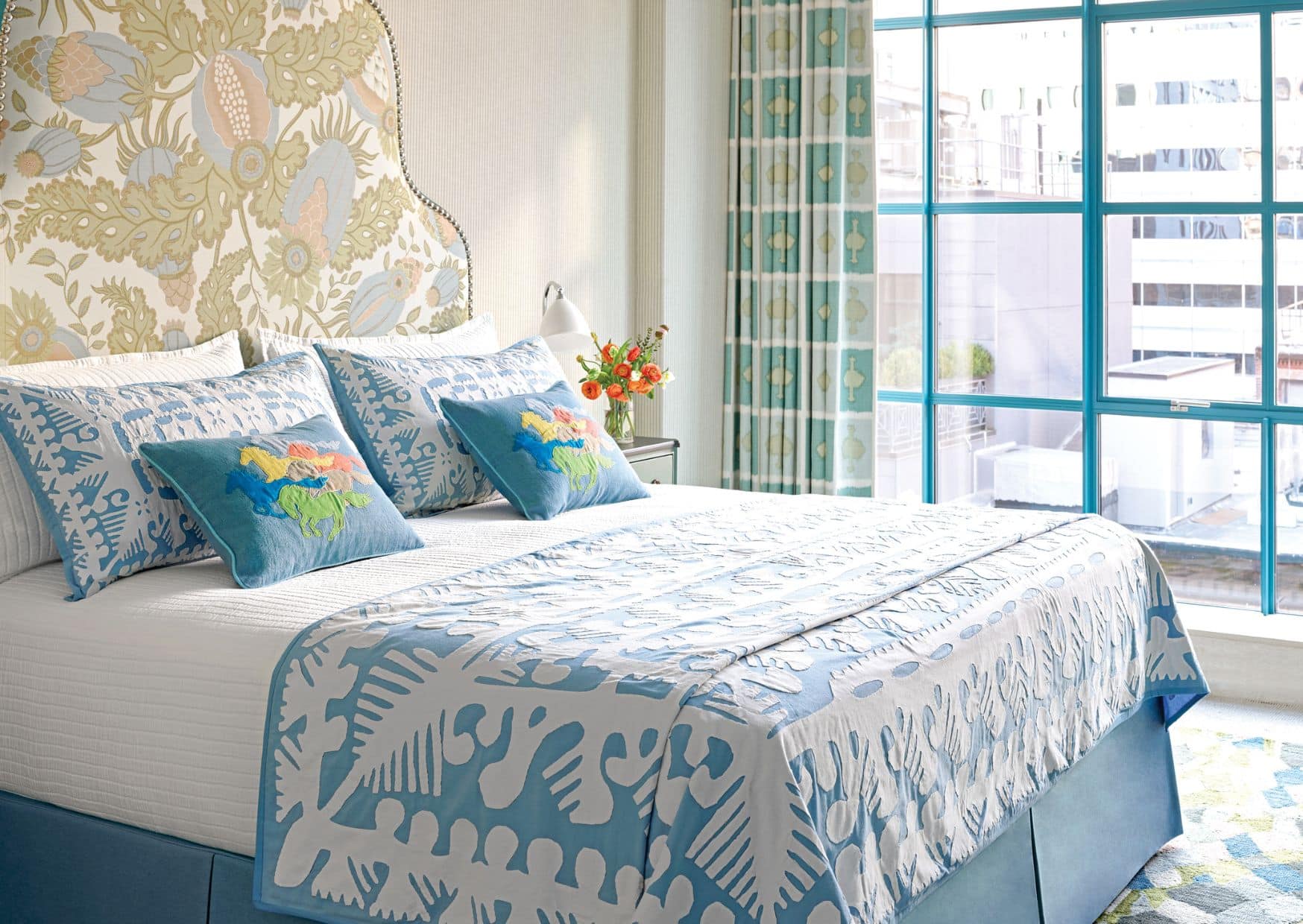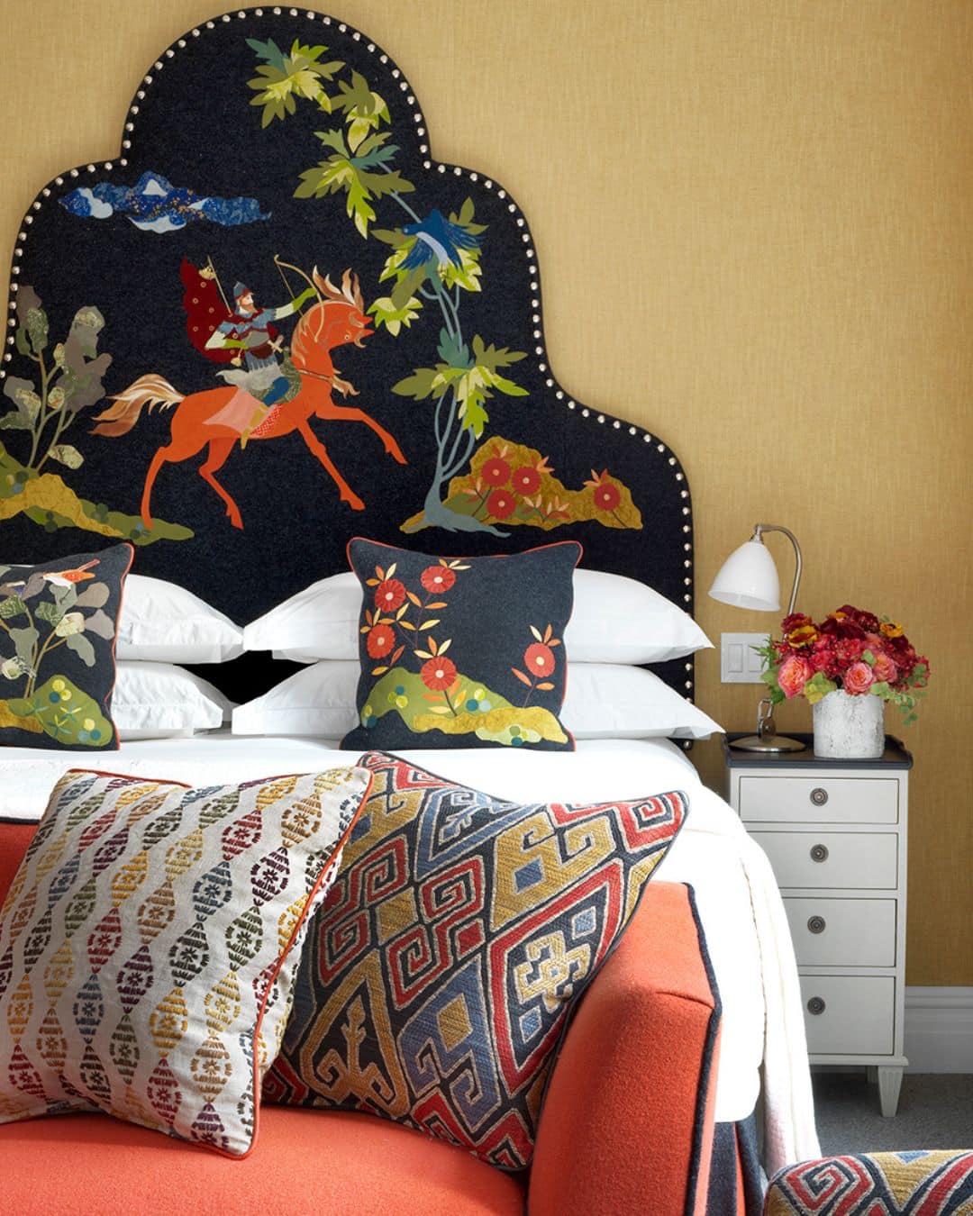 The same sense of life and movement appears in one of our most striking headboards at The Whitby Hotel. In room 1408, a horse emerges through the art of applique, inspired by an illustration discovered on the top of an old black lacquered box. The details were created using remnants of vintage kimono fabrics. Each stitch holds a whisper of a previous story, forming a layered tapestry of texture and character.