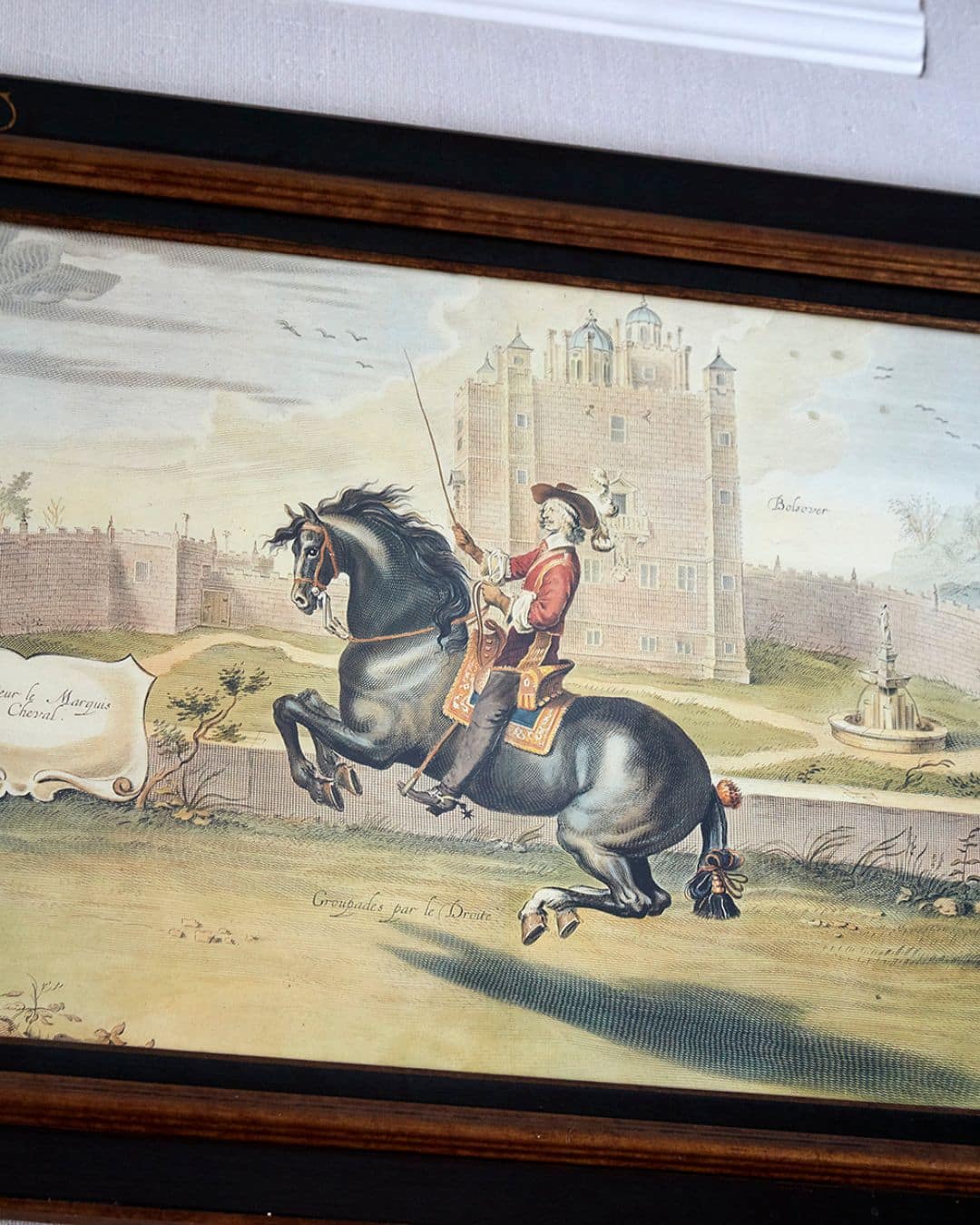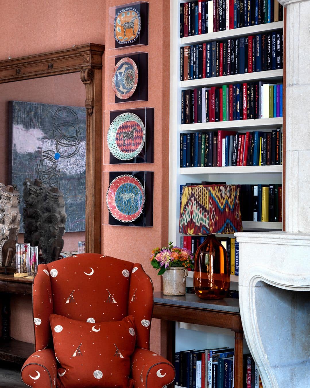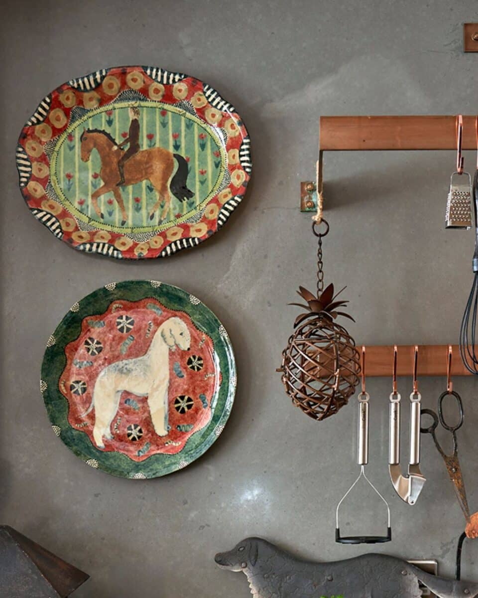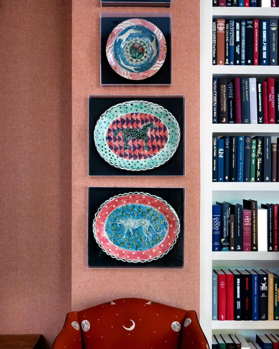 Another artist who celebrates horses with distinctive flair is Robina Jack. Her patterned ceramics and paintings on wood have long captured our admiration. In the Drawing Room at Ham Yard Hotel, a collection of her plates is framed in Perspex against black felt, their horses leaping forward in bold colour and joyful charm.
