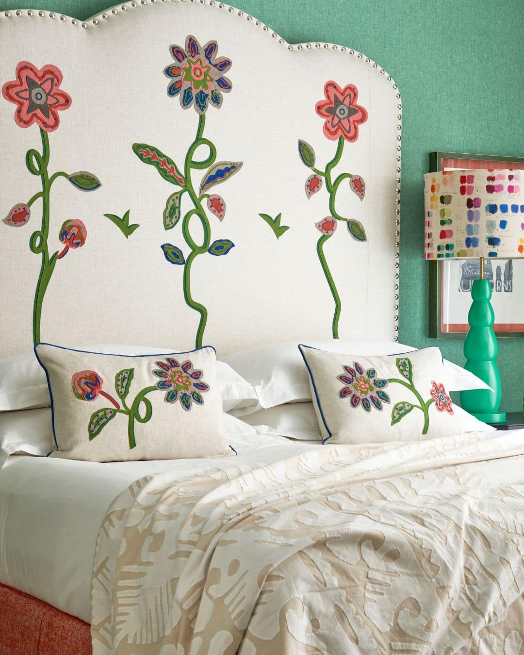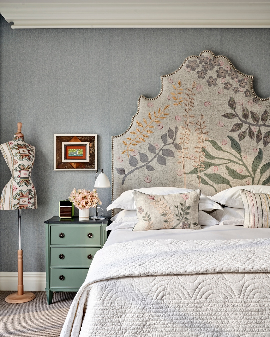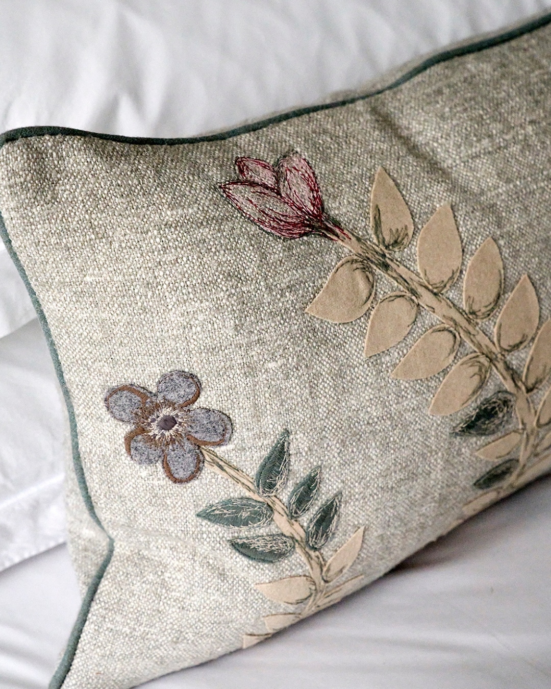 A distinctive headboard and decorative cushions are designed to welcome you and encourage relaxation. In this one-bedroom suite at Warren Street Hotel, we have used a bespoke headboard adorned with delicate leaf motifs. The placement and scale of the embroidery create a natural sense of movement, making the headboard the focal point of the room. Decorative cushions echo the same organic theme, adding texture and artistry that enhance comfort while reflecting the serene, nature-inspired atmosphere of the suite.