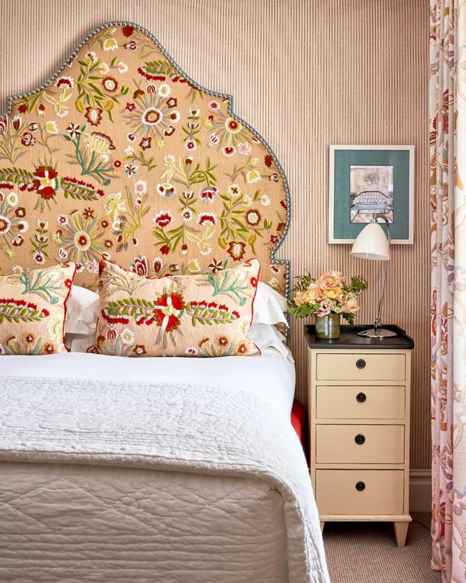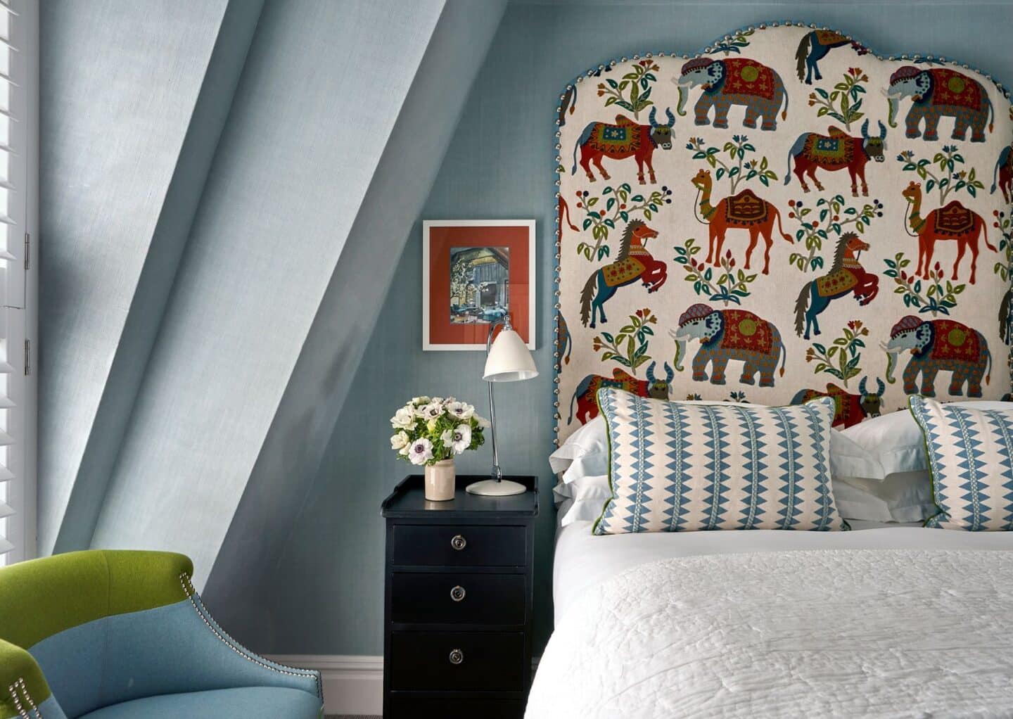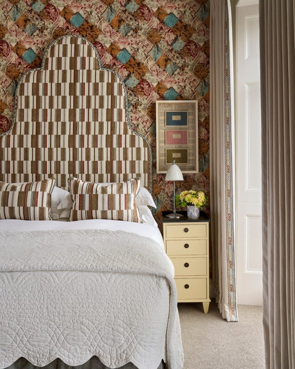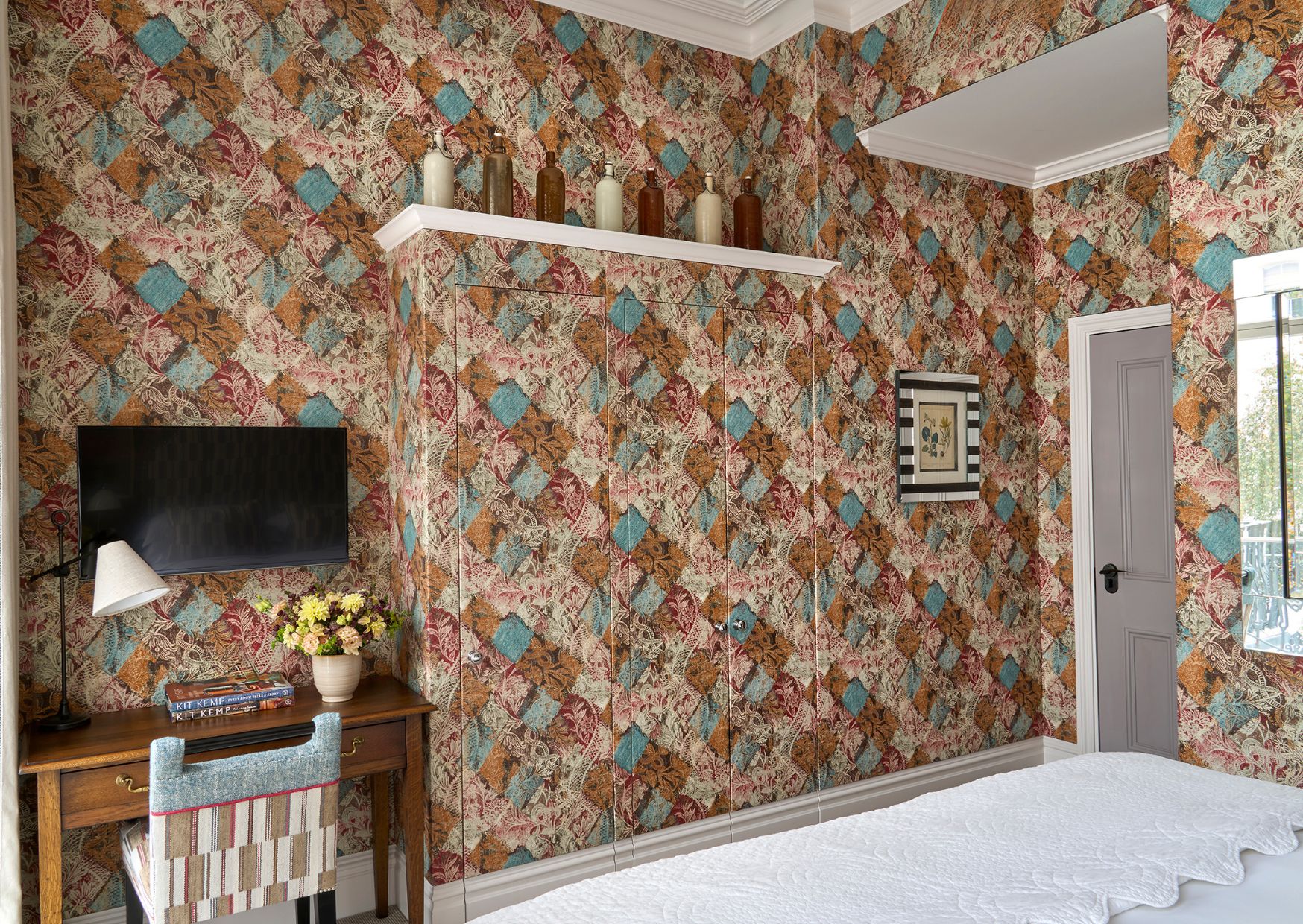 Softness is essential. Fabric lined walls introduce a quiet whisper, gently absorbing sound while adding warmth and comfort. In compact bedrooms, pattern should be embraced rather than avoided. Florals and geometrics envelop the space like a jewel box, creating richness and depth. These motifs add movement and rhythm, drawing the eye around the room and giving it life. When layered thoughtfully, pattern transforms a small bedroom into something immersive, expressive and undeniably luxurious.
