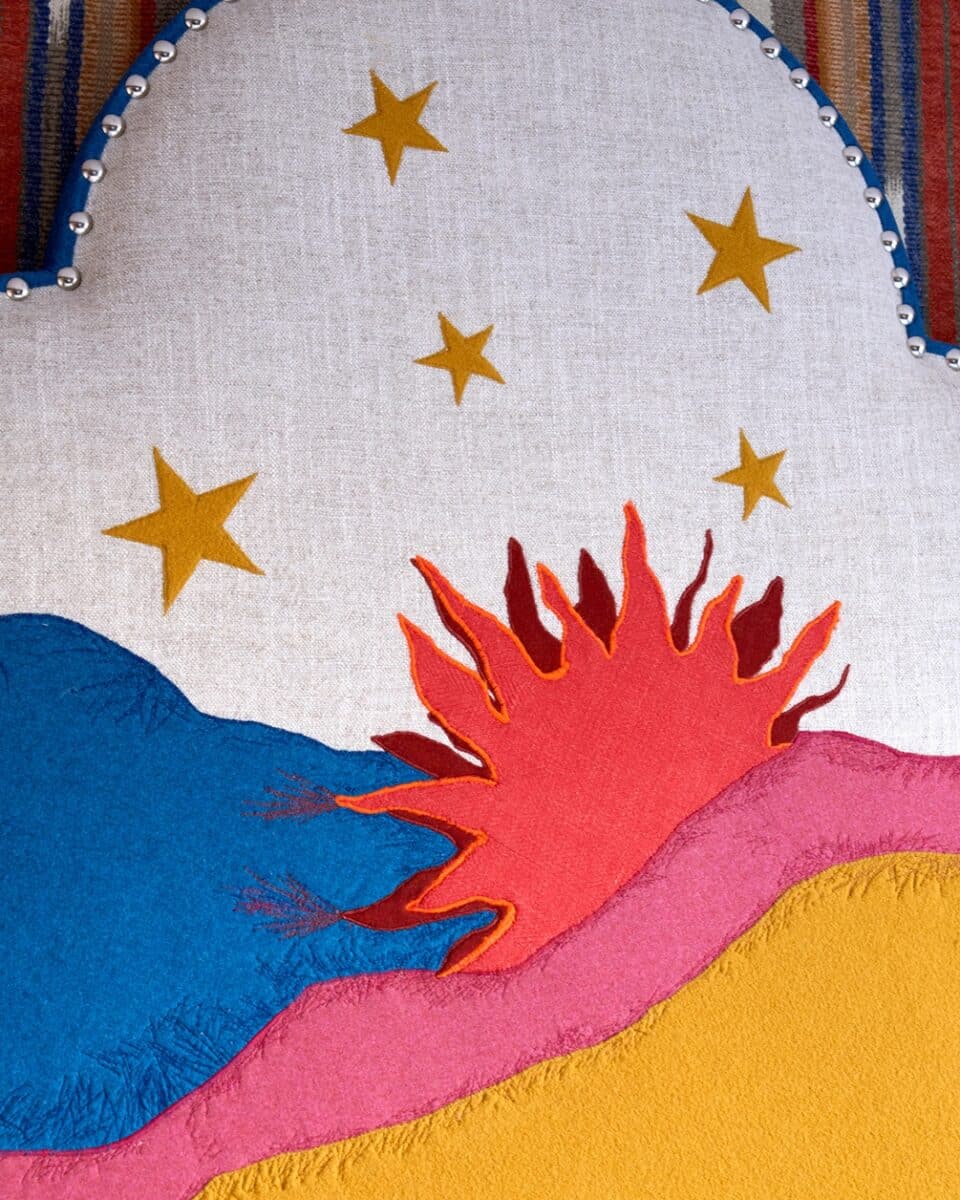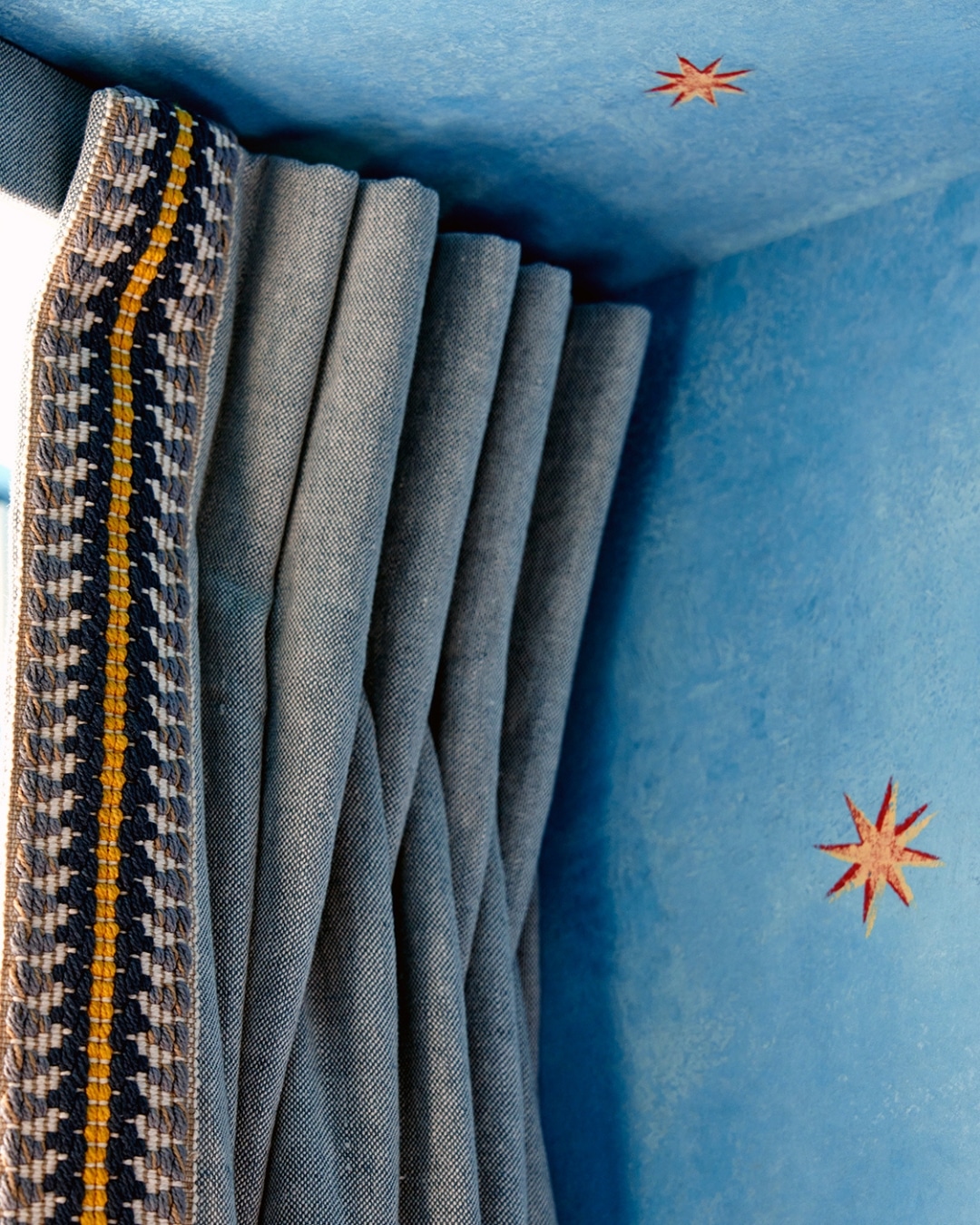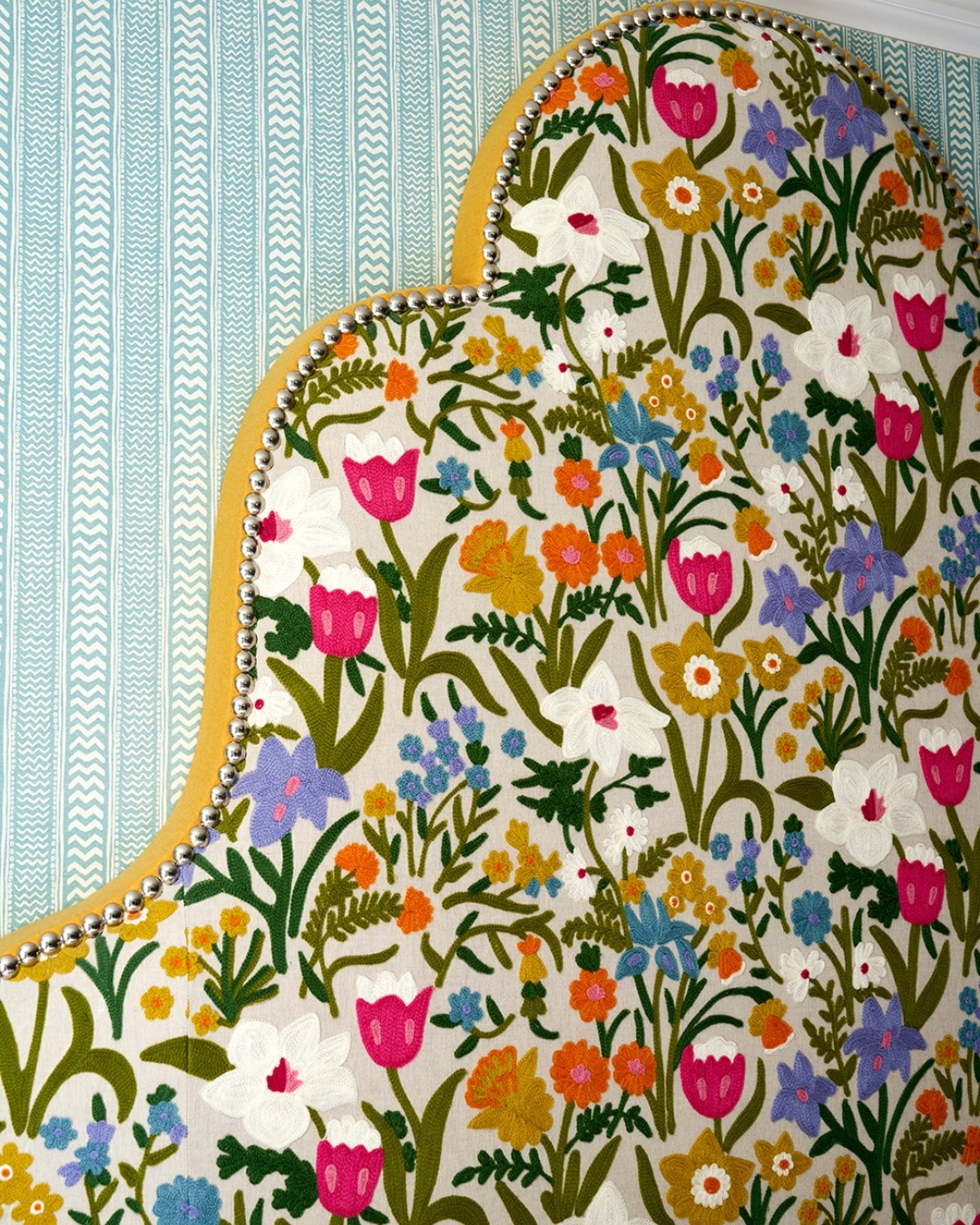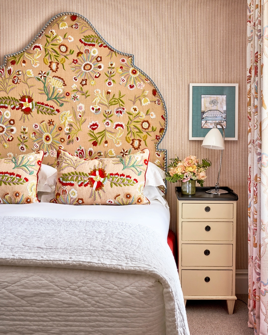 An upholstered headboard in embroidered fabrics and layered appliqué further softens the architecture, adding depth, tactility and warmth. Natural fibres such as linen, wool and cotton breathe, age gracefully and invite touch and comfort.