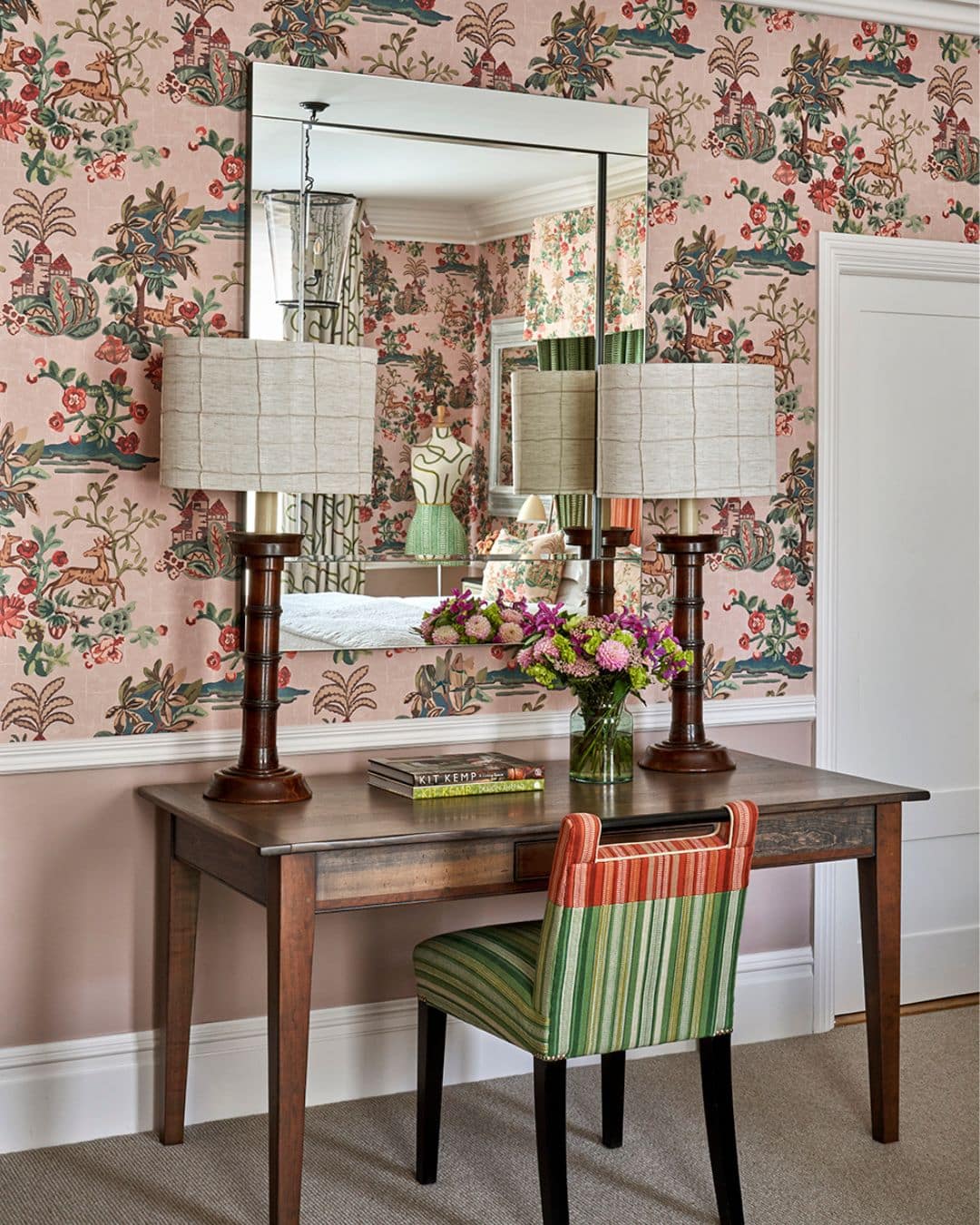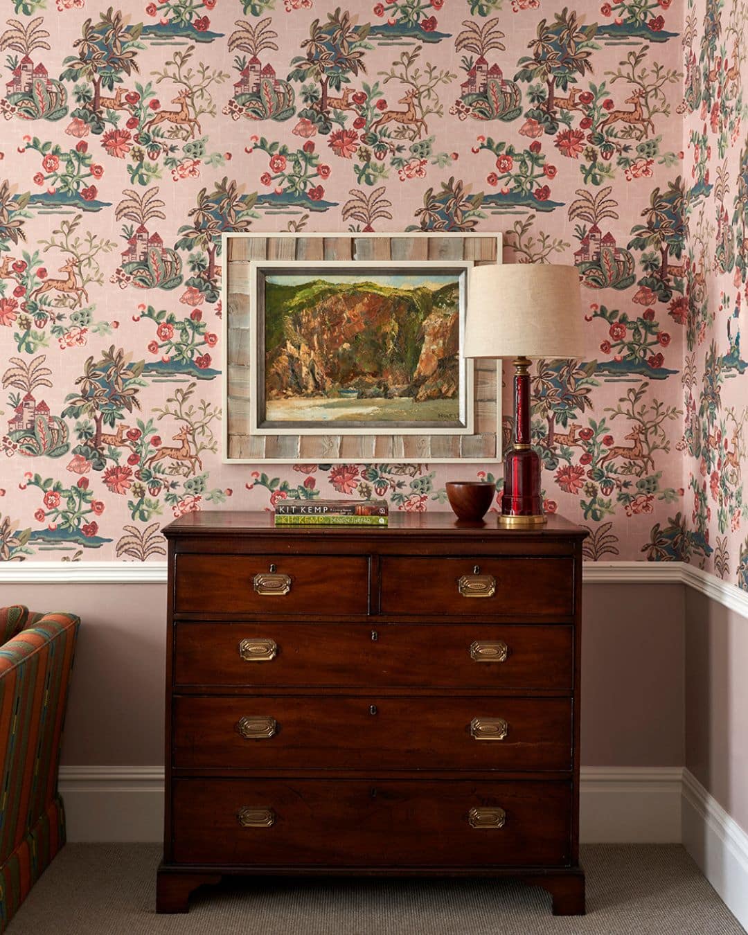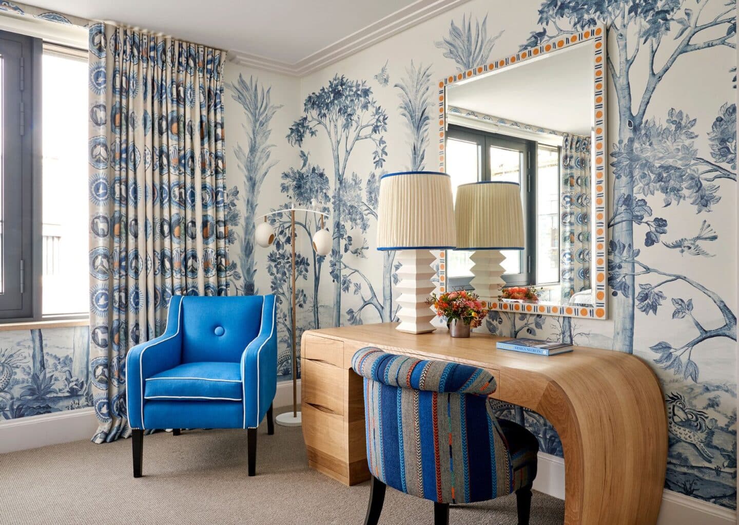 In this room, we used our Lantern Parade wallpaper alongside a bespoke painted lamp that mirrored the design. Painted geometric shapes in the same colour palette created contrast while keeping the look contemporary, instantly making the room feel intentional and carefully considered.