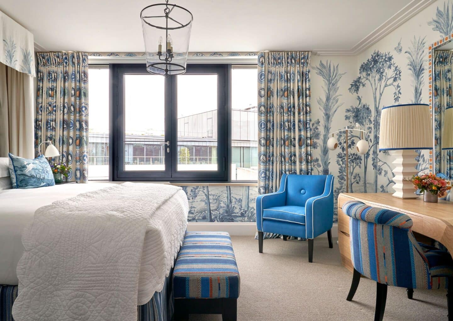 In this room at Covent Garden Hotel, where the desk and lamps already draw attention, we chose a natural colour but added texture to the fabric. This creates visual interest without overwhelming the space.
