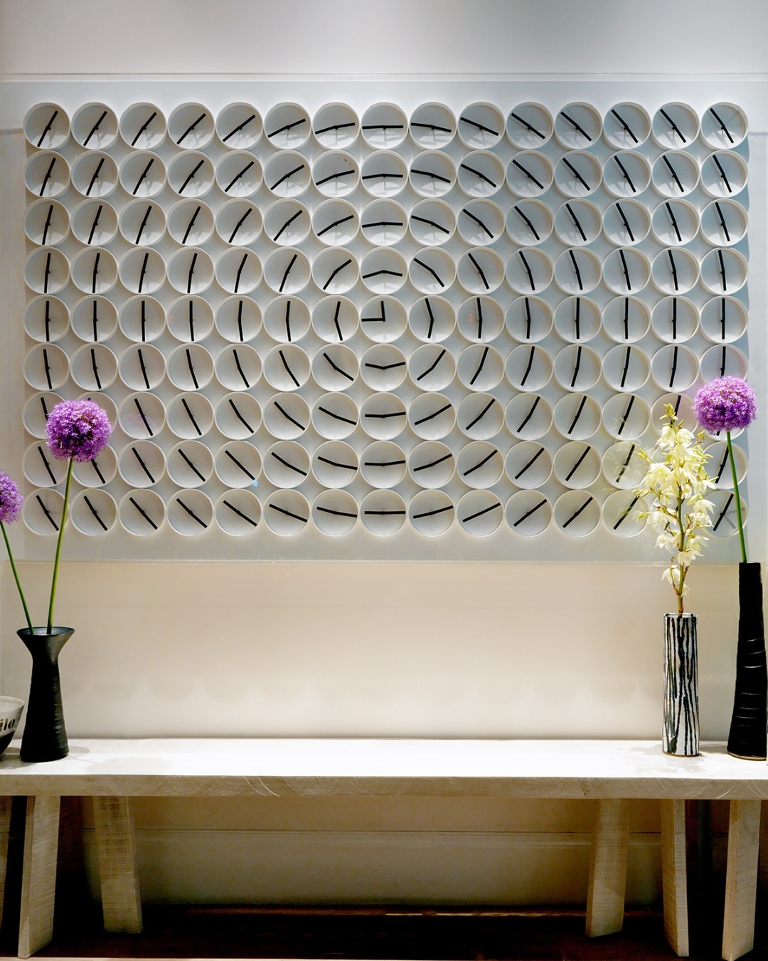 Established in 2009, Per and Bastian, both born in 1982, met as postgraduate students at HDK Göteborg. What began as a shared curiosity has evolved into a dynamic and ambitious practice that brings together creative expression, thoughtful design and innovative technology. The duo is best known for their celebrated A Million Times series, kinetic sculptures that transform clocks into choreographed performances. Individually programmed, each clock rotates in formation to create hypnotic patterns of movement. Once every minute, the hands align to form a precise digital display, playfully marking the passage of time.