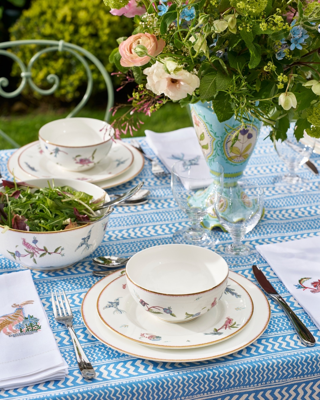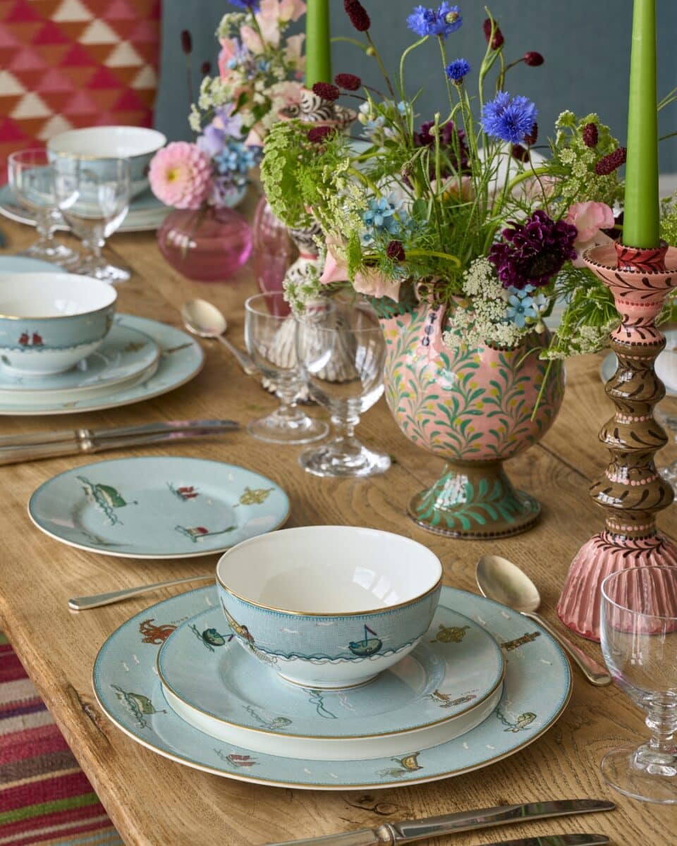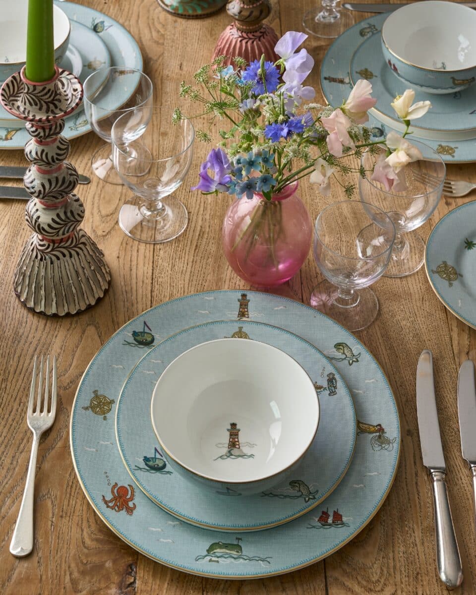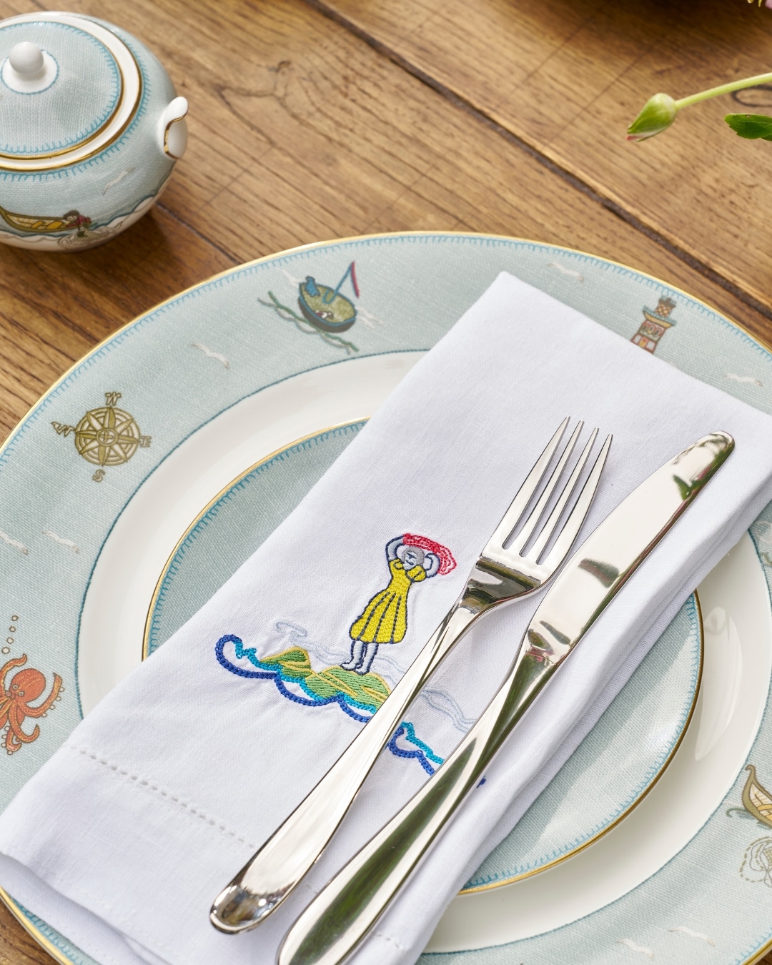 Our Sailor’s Farewell dining collection, made with Wedgwood, tells the story of a sailor’s loved one waving goodbye as they set off on an adventure across the high seas. China that tells a story draws us into the imagination even as we dine, helping to spark conversation around the table.