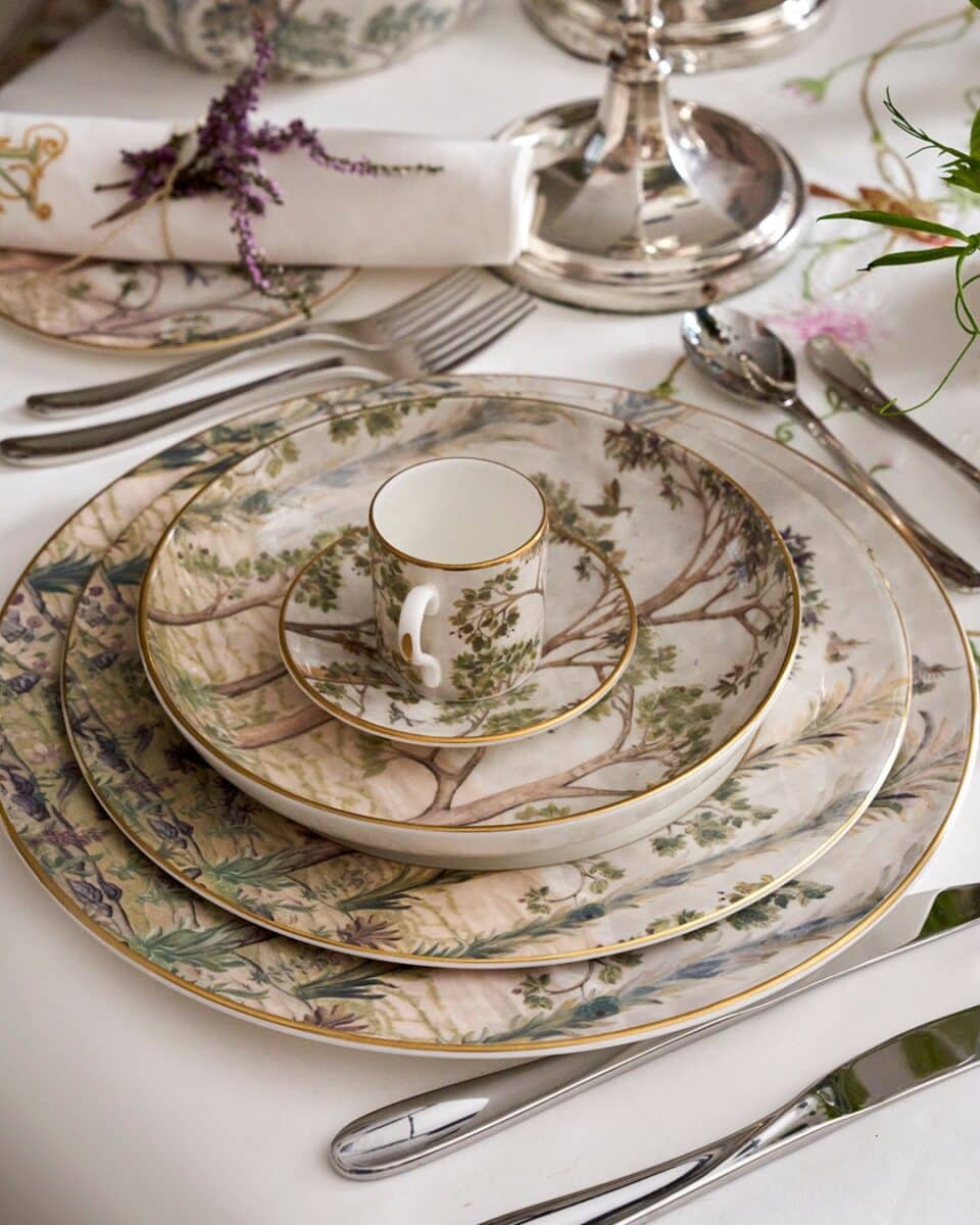 Our Tall Trees collection, made with Spode, is inspired by walks in the countryside, with swaying treetops and rolling hills fading into the distance. Each piece is hand painted with 24-carat gold banding, giving it a regal finishing touch. There is something truly inspiring about seeing such extraordinary craftsmanship still alive in Britain, especially in a world where so much is rushed, outsourced and made without soul.