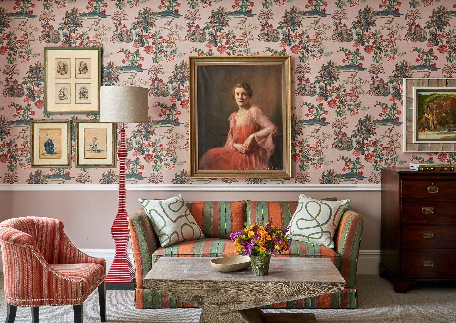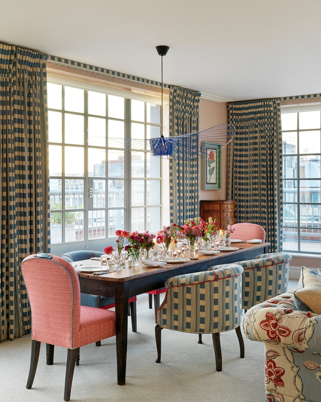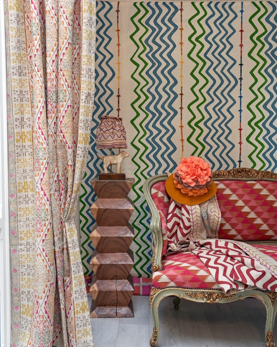 Likewise, Busy Lizzie in hot pink brings the uplifting, rosy glow we gravitate towards at this time of year. Its lively geometric pattern has an energy that is perfect for upholstery and instantly brightens a room.
