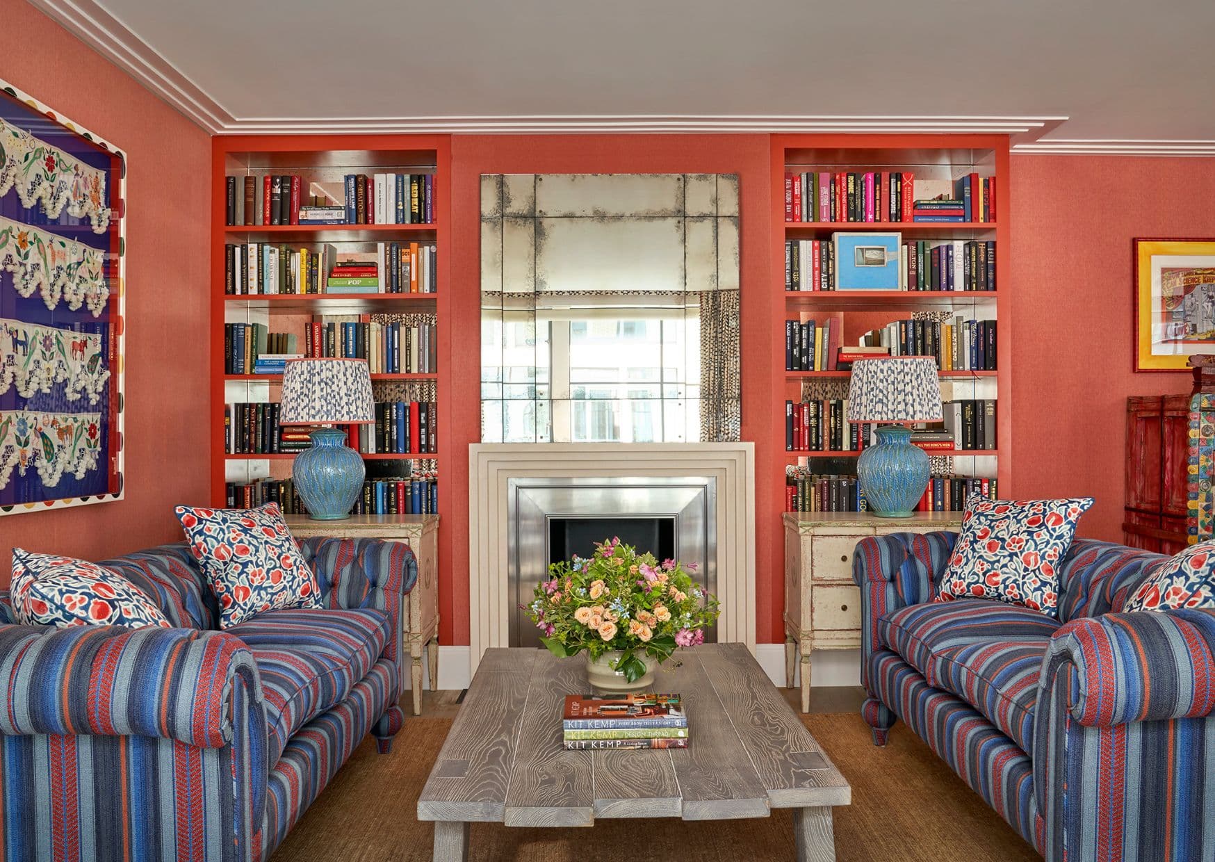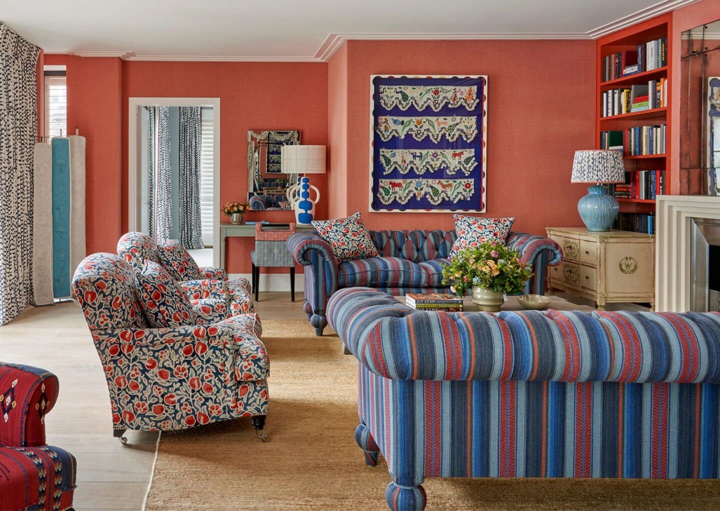 With its deep buttoning, generous rolled arms and timeless proportions, the Chesterfield sofa is one of our signature pieces across many rooms. Its distinctive leg detail is an important part of its character and by wrapping the fabric all the way down to the floor we soften and unify the silhouette. In this residence, the striped fabric enhances the tailored quality of the design, creating a seamless and considered look that feels both elegant and inviting.