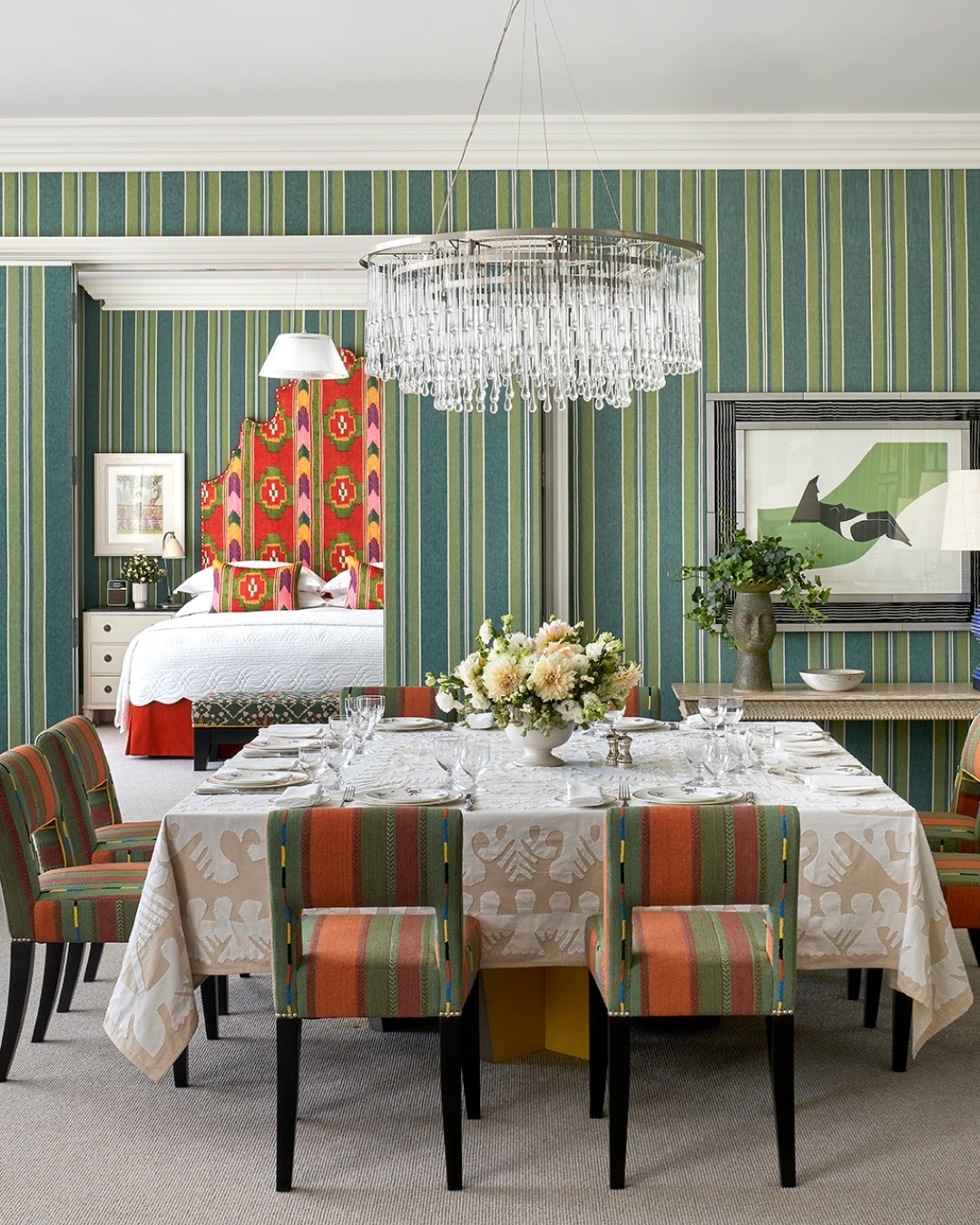 Whether it is a striped fabric that evokes a tailored look or a pattern that begins to tell a story as you enter, dressing walls with fabric provides the canvas on which to create an entire atmosphere.