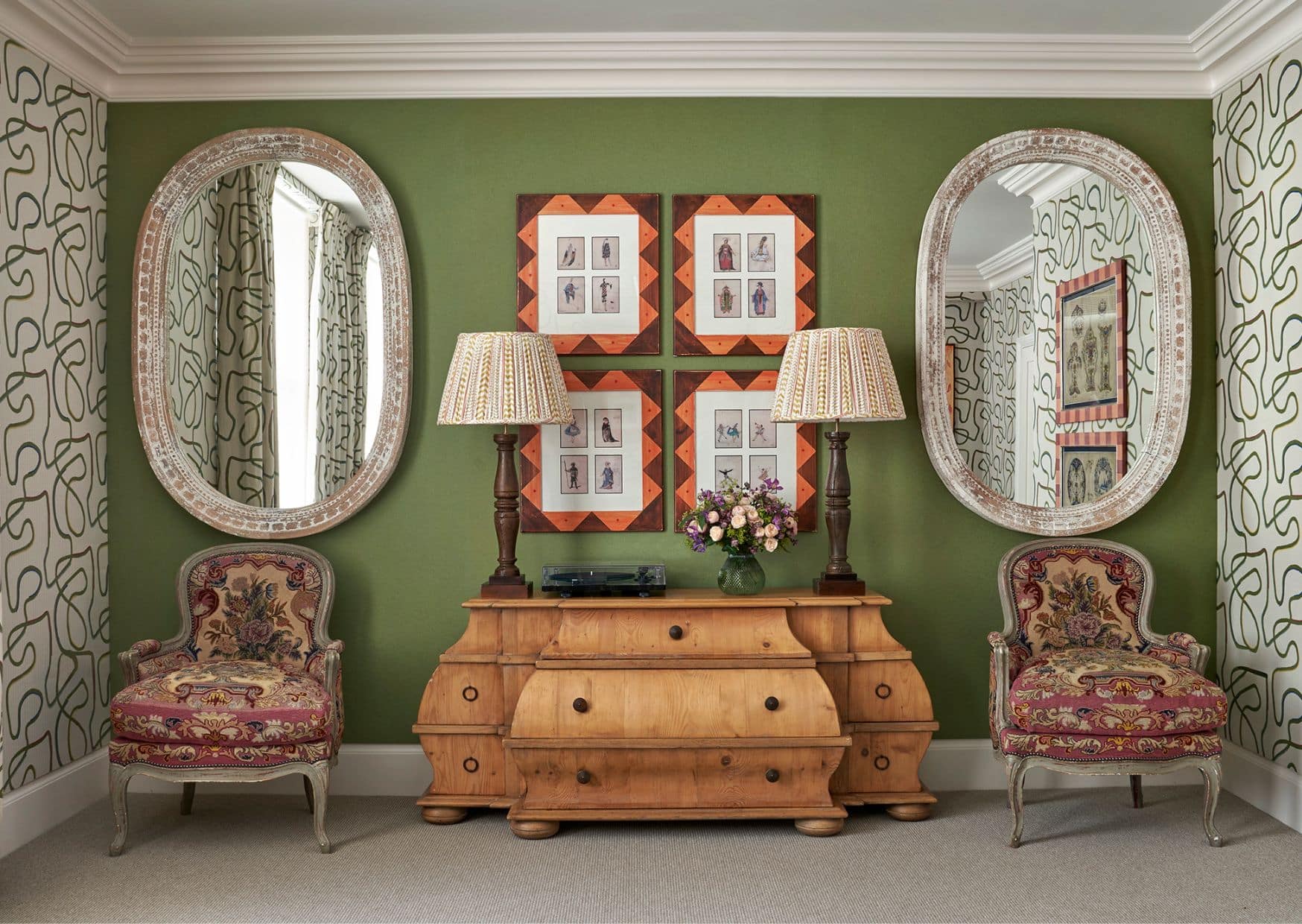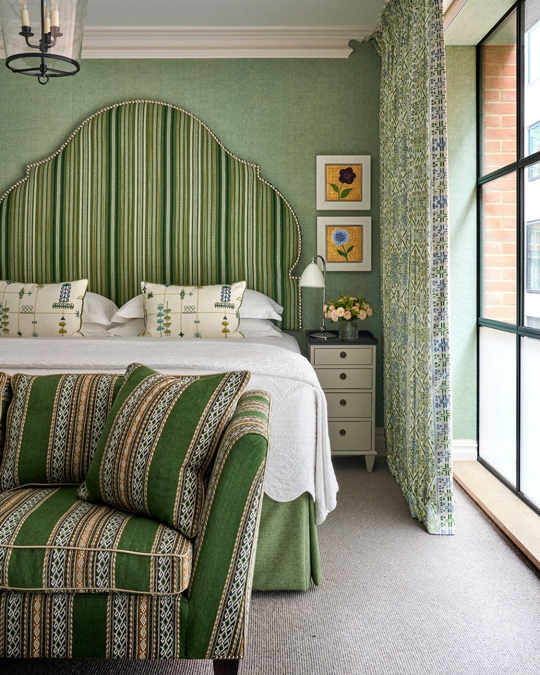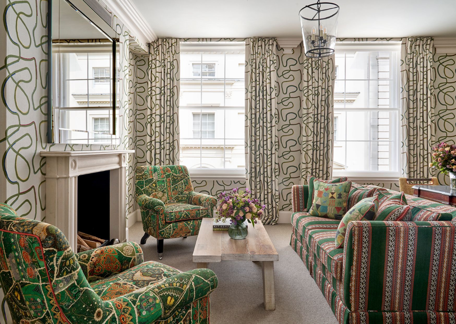We often look to the natural world for inspiration when layering our schemes. Botanical prints, embroidered foliage and painterly patterns can introduce a sense of movement and charm. A beautifully upholstered armchair in a leafy fabric, or a cushion trimmed with lively green piping, can quietly echo the colours of the outdoors while adding depth and personality to a room. At Knightsbridge Hotel, one of the suites embraces this idea beautifully, with green flowing from the walls through to the curtains.