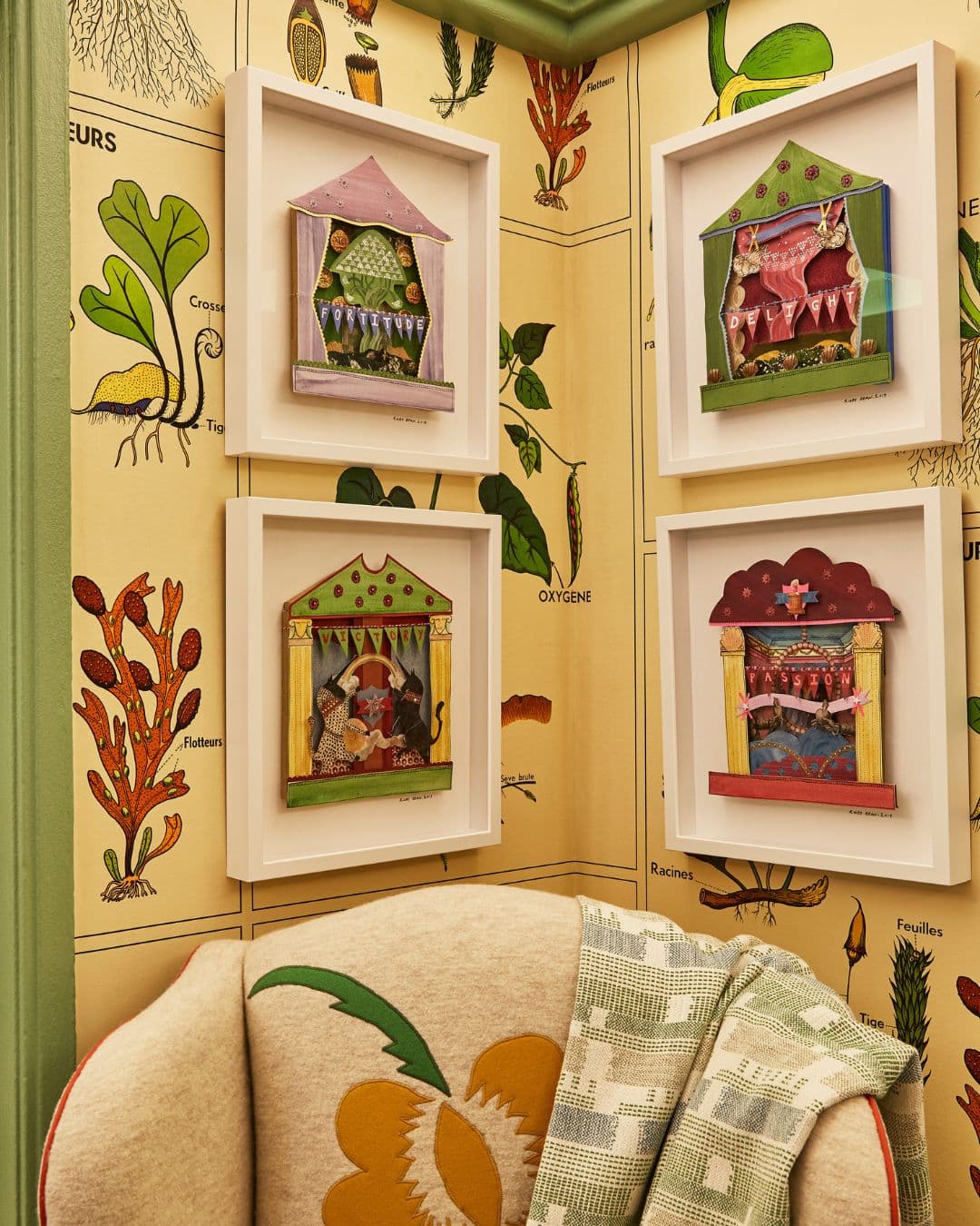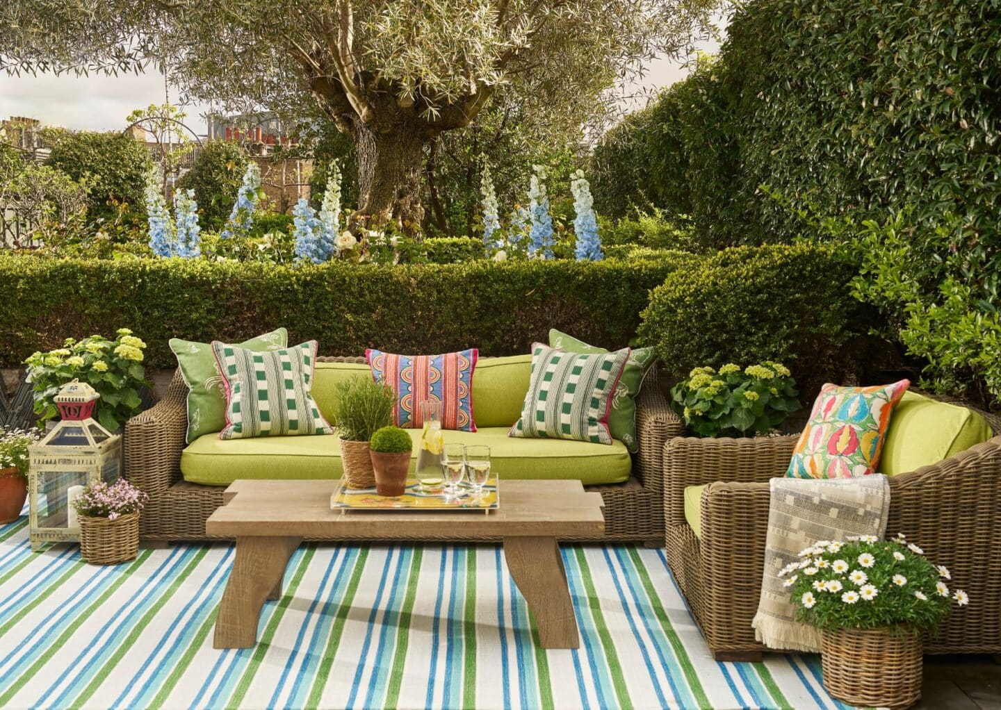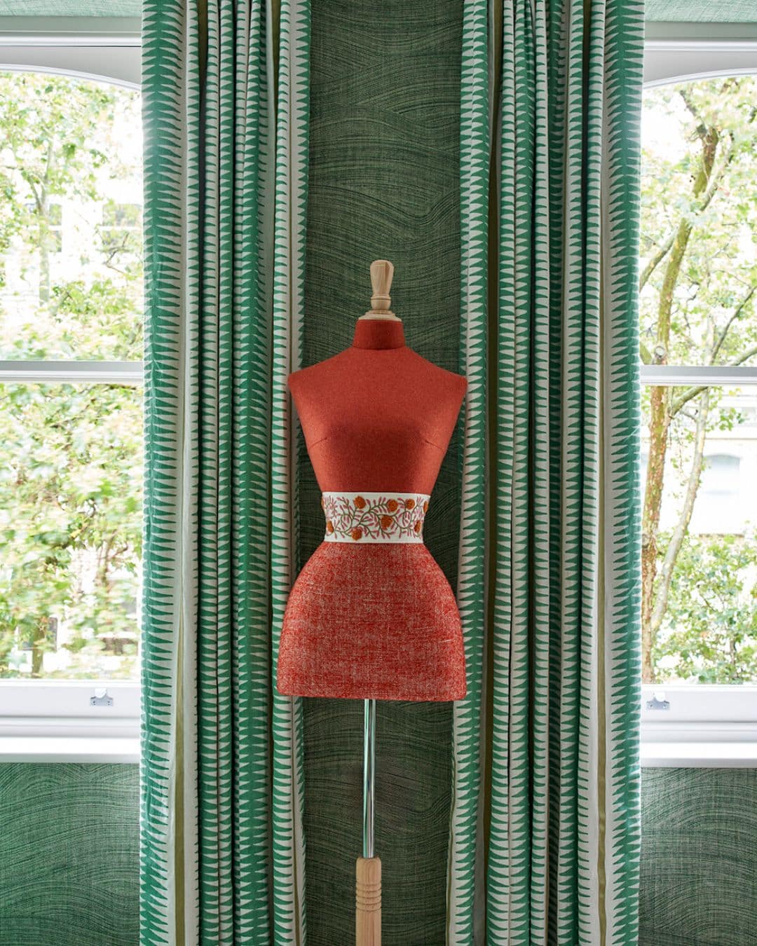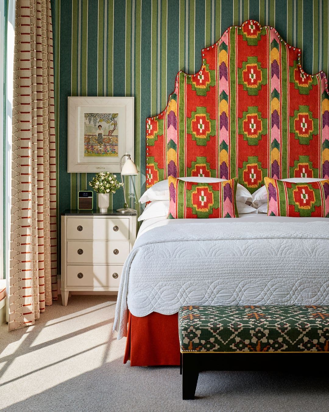 We often look to the natural world for inspiration when layering our schemes. Botanical prints, embroidered foliage and painterly patterns can introduce a sense of movement and charm. A beautifully upholstered armchair in a leafy fabric, or a cushion trimmed with lively green piping, can quietly echo the colours of the outdoors while adding depth and personality to a room. At Knightsbridge Hotel, one of the suites embraces this idea beautifully, with green flowing from the walls through to the curtains.