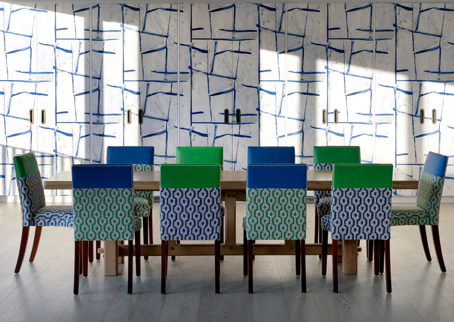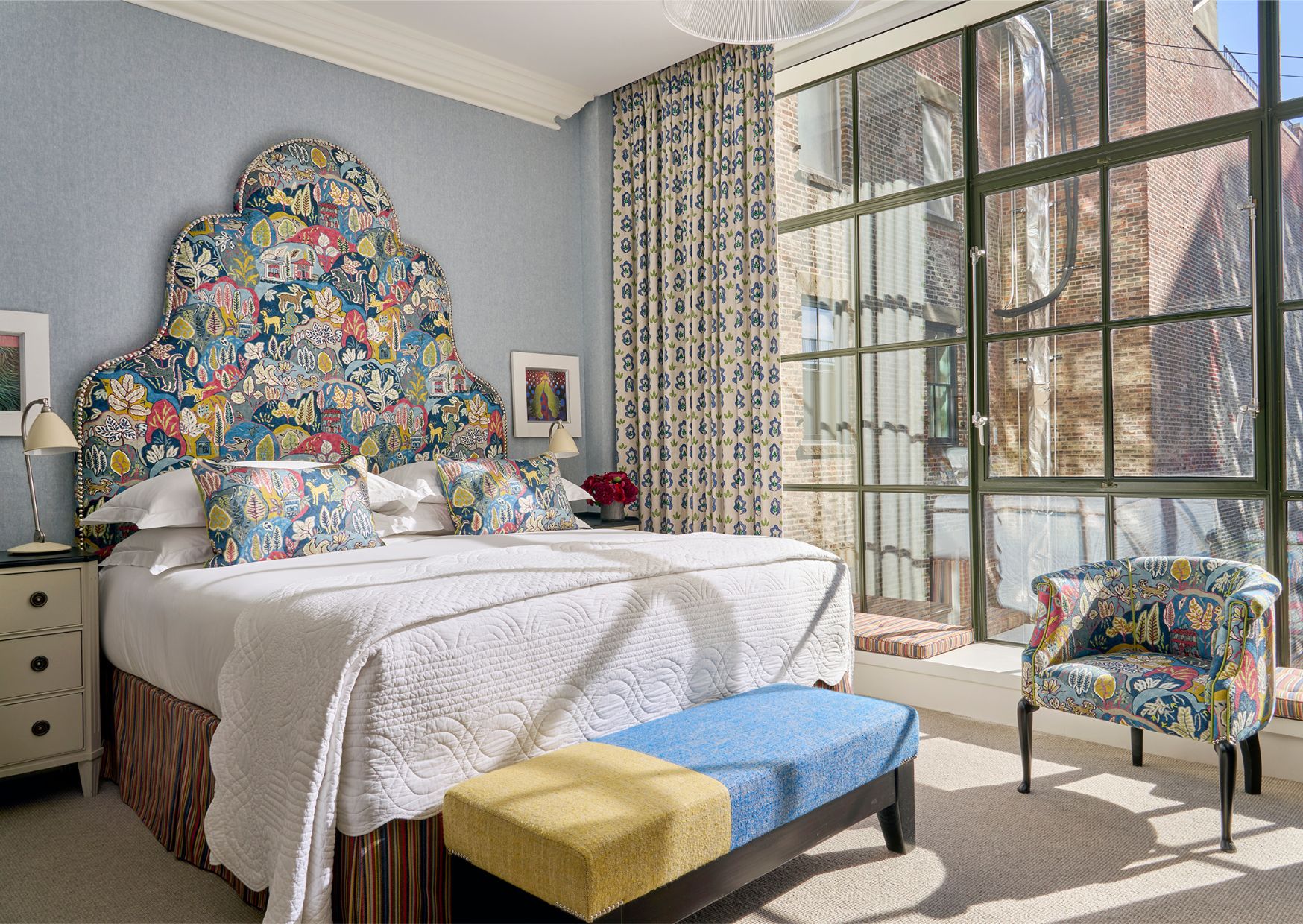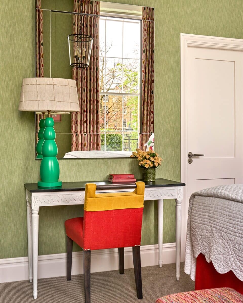 In many of our bedrooms, the handle chair follows a two-thirds to one-third proportion, with the lower section wrapped in pattern and the upper portion balanced by leather or a contrasting accent colour. This proportion helps to ground the chair visually, while allowing the upper section to lift and frame the silhouette. The contrast creates interest, but more importantly, it enables the chair to connect with multiple elements in the room, echoing both the bolder patterns and the quieter plains.