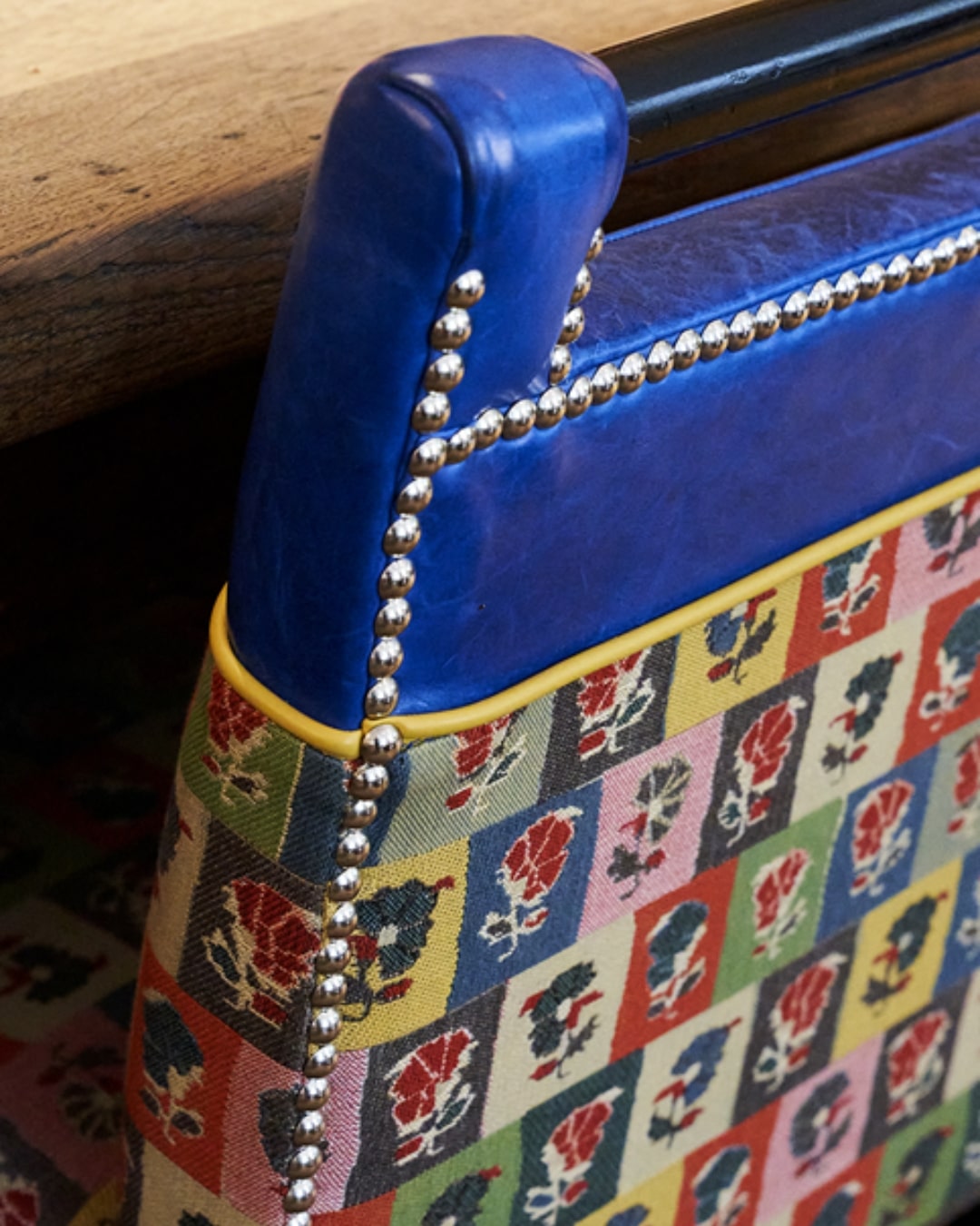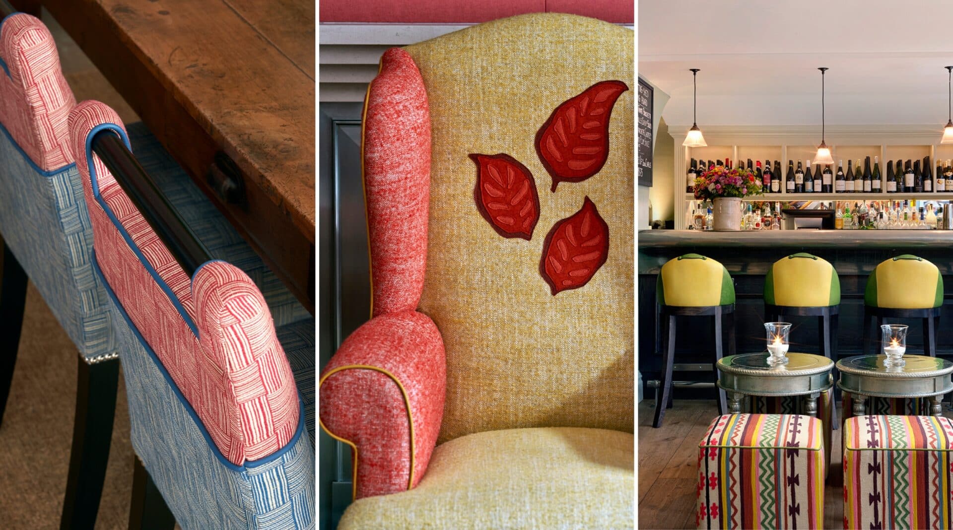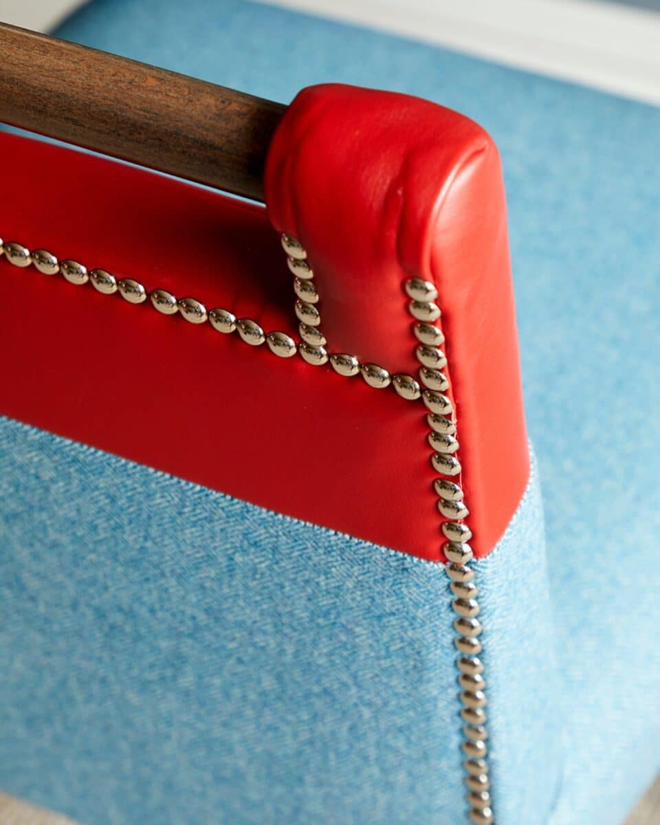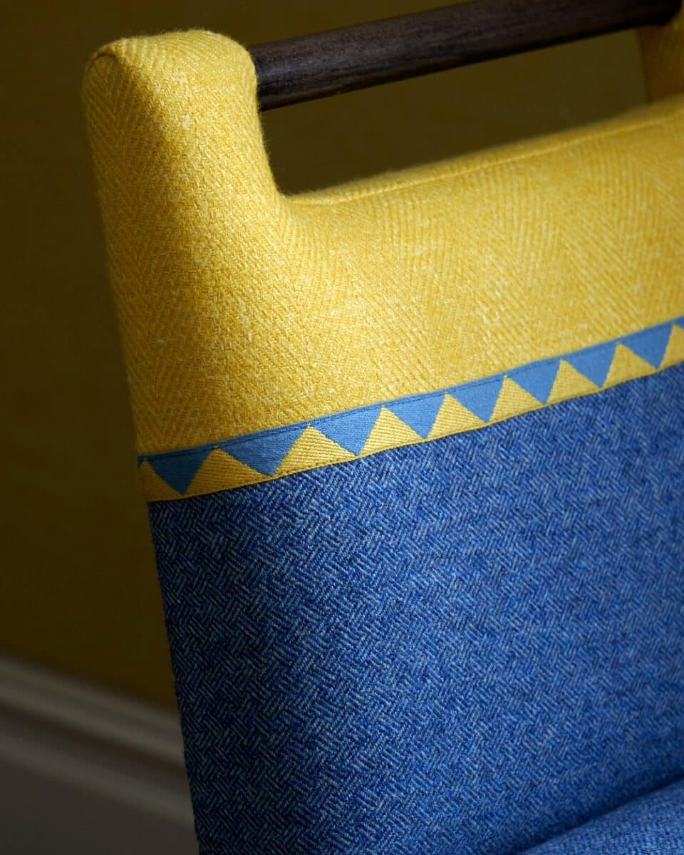 One of the most recognisable examples of split upholstery at Firmdale Hotels is the Handle Chair. Throughout our hotels, you will often find two-tone chairs upholstered in a lively patterned fabric, paired with a bold plain or leather.