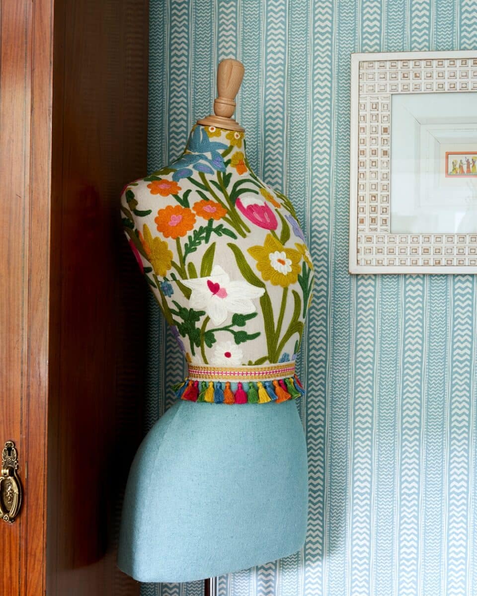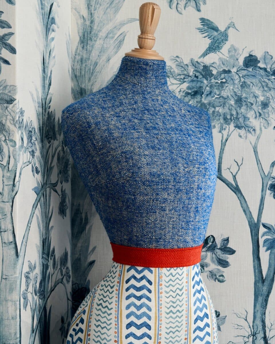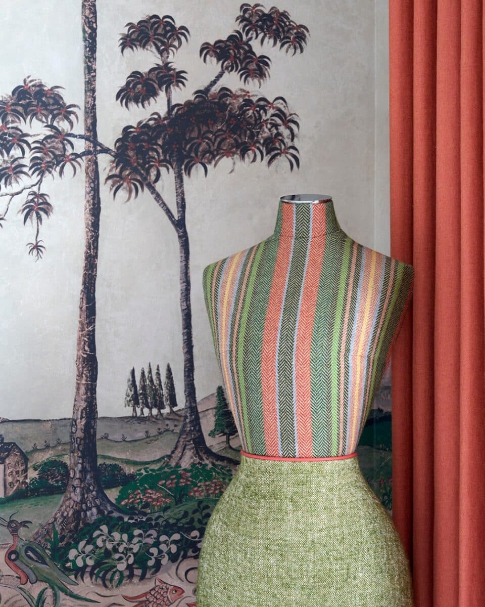 Another opportunity to experiment with fabric blocking is through our mannequins. Often divided between a patterned or striped textile on one half and a complementary plain on the other, these pieces introduce a sense of character and playfulness into the room. A trim or fringed belt defines the meeting point, completing a cohesive look while adding movement and colour.
