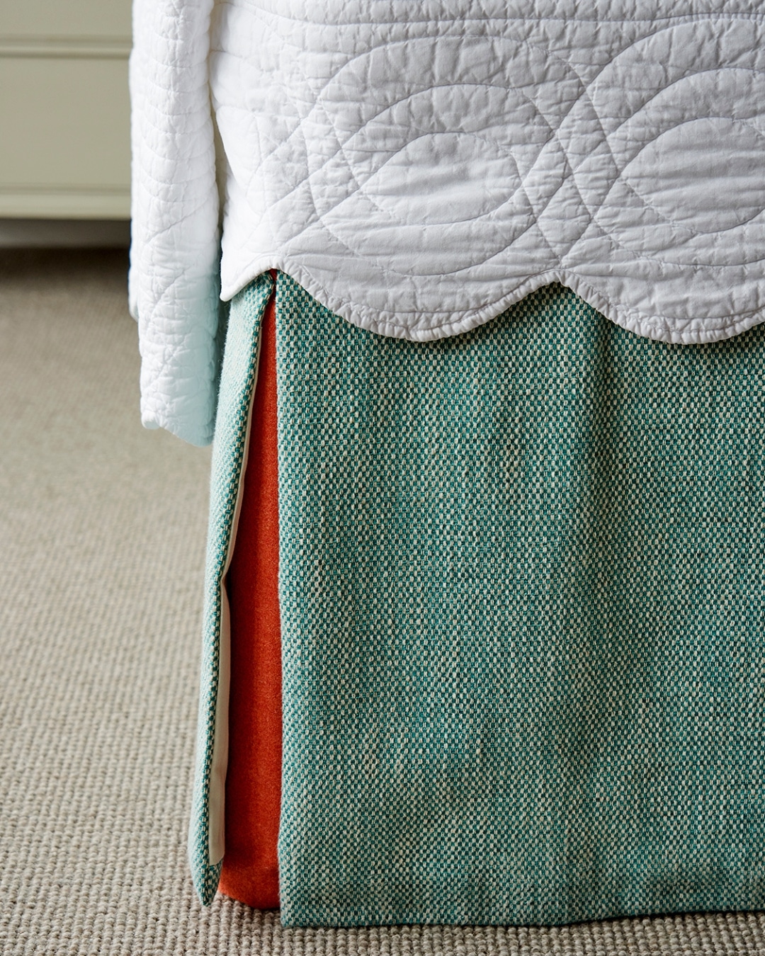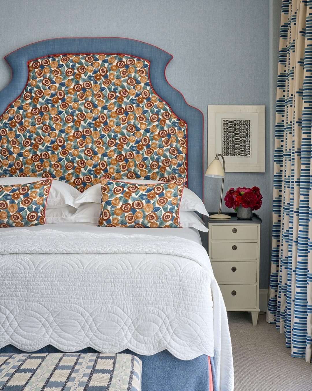 The bed valance is another area where a seemingly small detail can have a significant impact. A kick pleat in a contrasting fabric introduces a subtle yet striking pop of colour, drawing the eye down from the headboard, anchoring the bed and bringing balance to the overall scheme. Without this contrast, the valance can recede into the carpet, causing the visual weight of the room to sit too heavily at the top. It is a quiet adjustment, but one that transforms how the space is experienced.