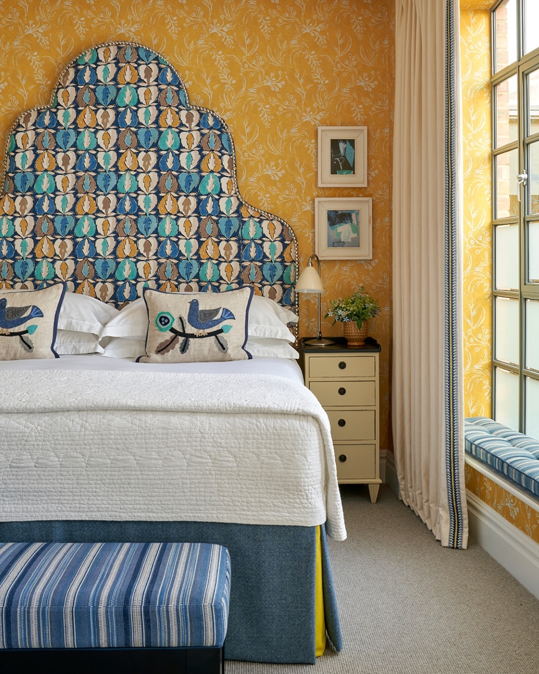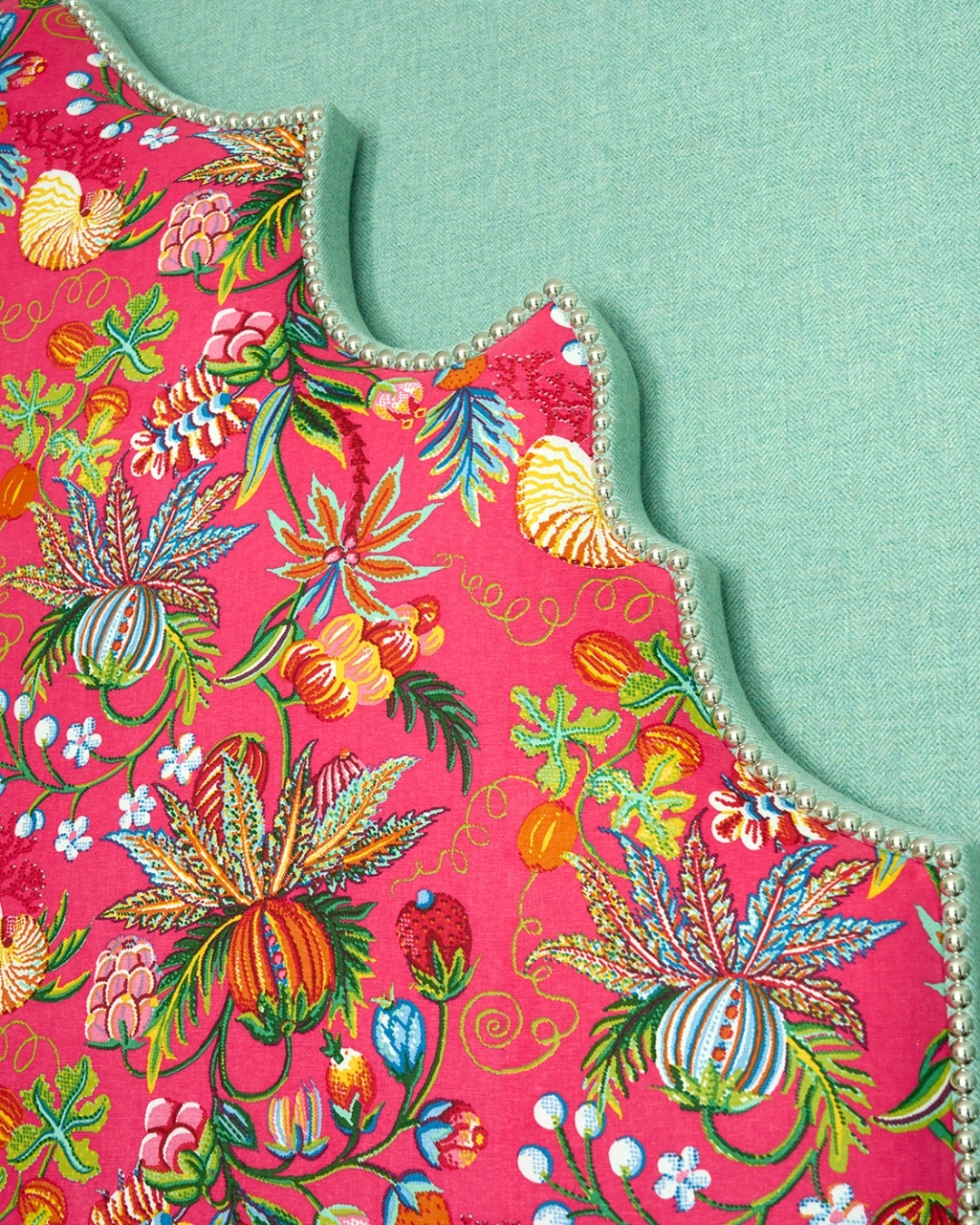 We also like to explore the relationship between plain and patterned fabrics through the edges of the headboard. Using a colour drawn from the main fabric along the depth helps to frame the headboard against the wall. A thicker border, such as on our Ellie headboard, adds further dimension and gives the piece a stronger architectural presence.