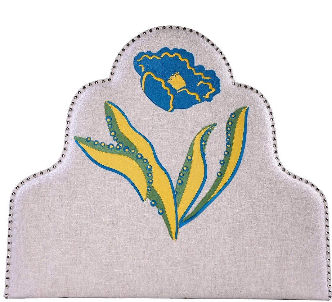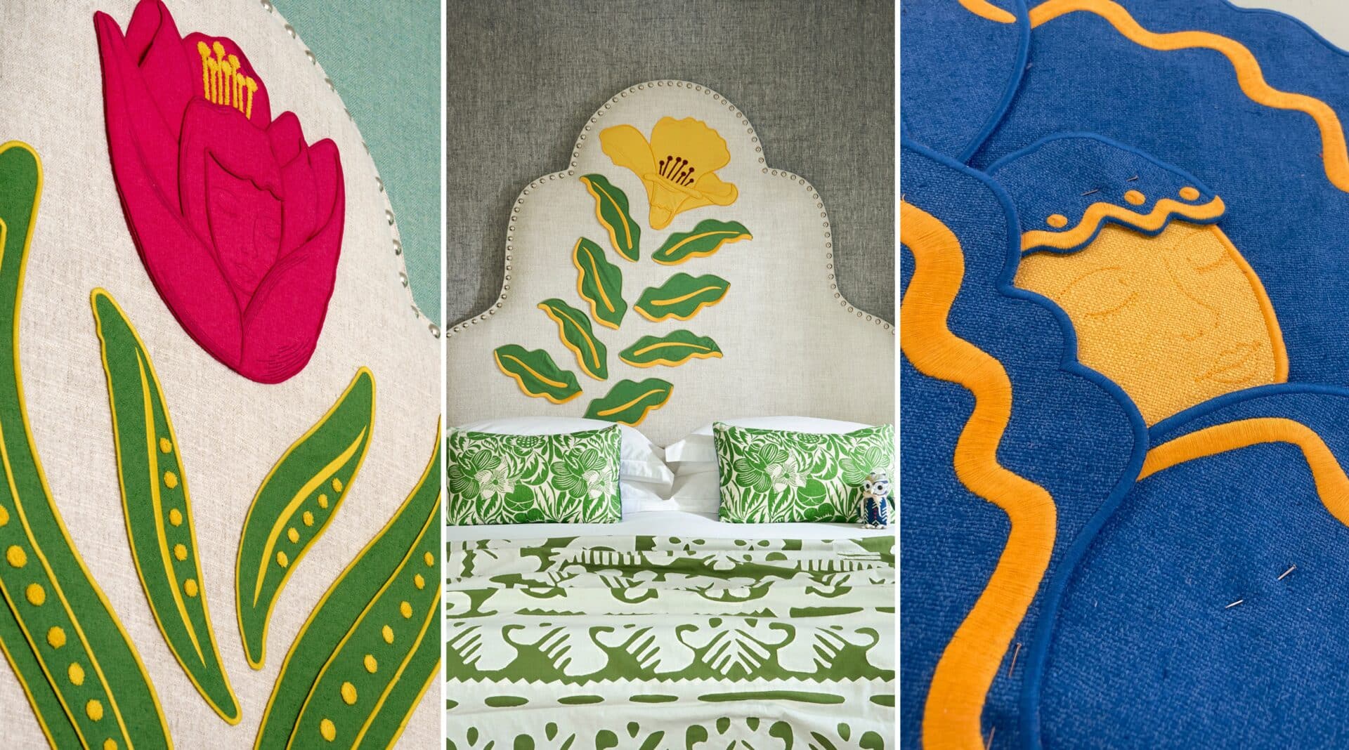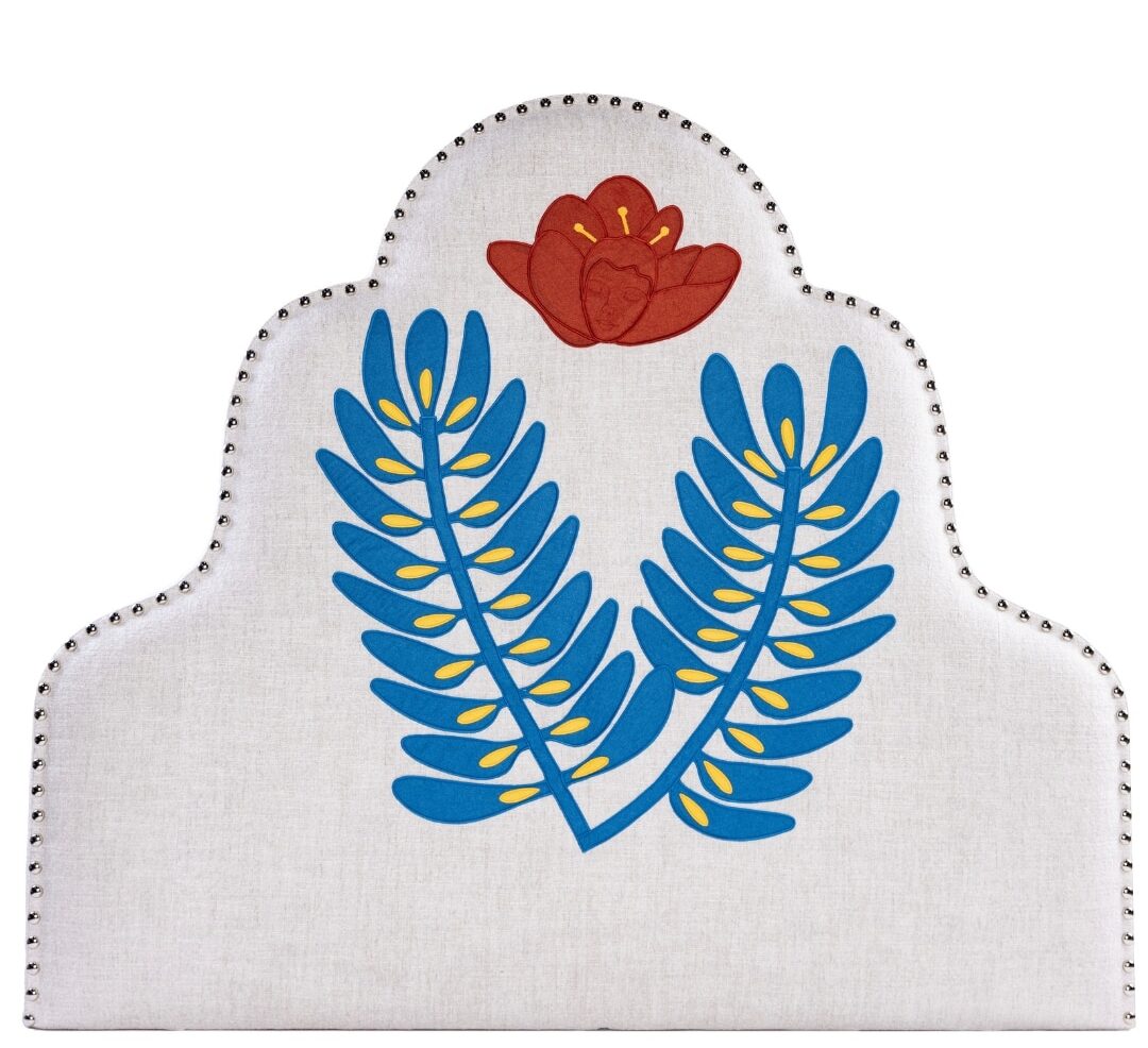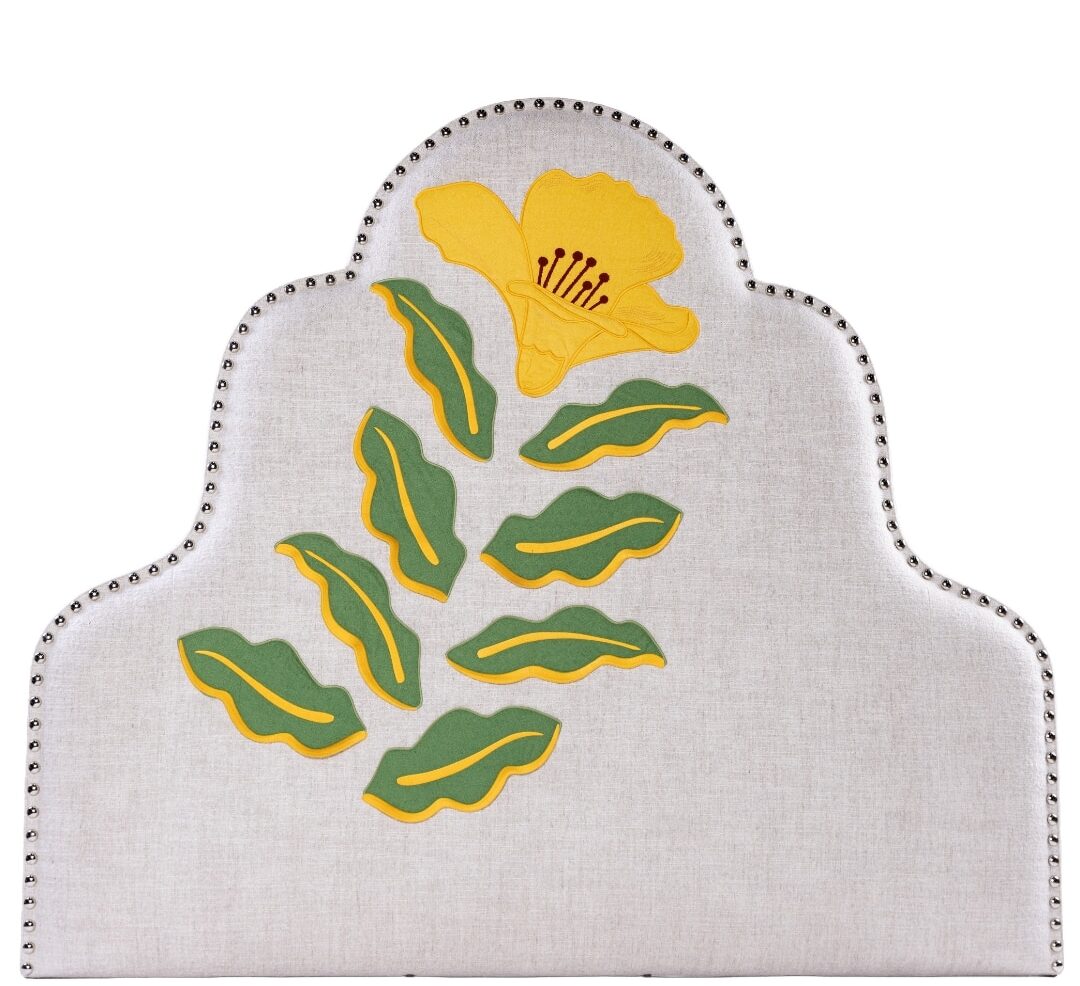 The headboards are defined by their hand-appliquéd floral motifs, paired with embellished leaves set against a backdrop of natural weave. This layering technique gives each design a tactile, sculptural quality, adding a sense of weight and organic texture to a room, while the wide-set nickel studding introduces a note of contemporary sophistication, completing the upholstery with precision.