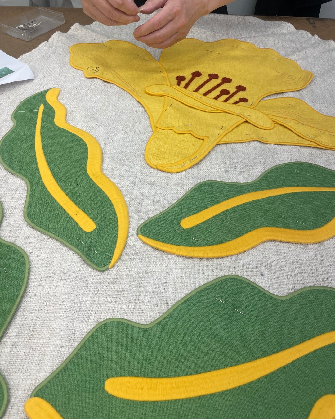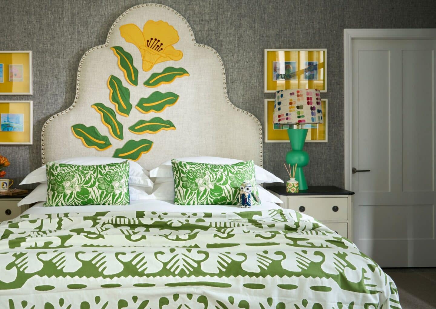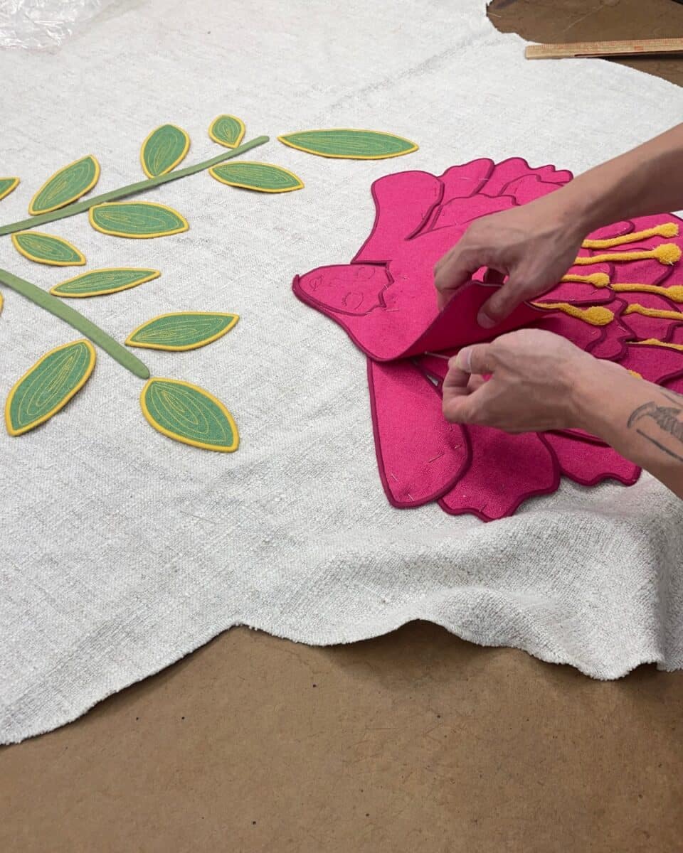 The headboards are defined by their hand-appliquéd floral motifs, paired with embellished leaves set against a backdrop of natural weave. This layering technique gives each design a tactile, sculptural quality, adding a sense of weight and organic texture to a room, while the wide-set nickel studding introduces a note of contemporary sophistication, completing the upholstery with precision.