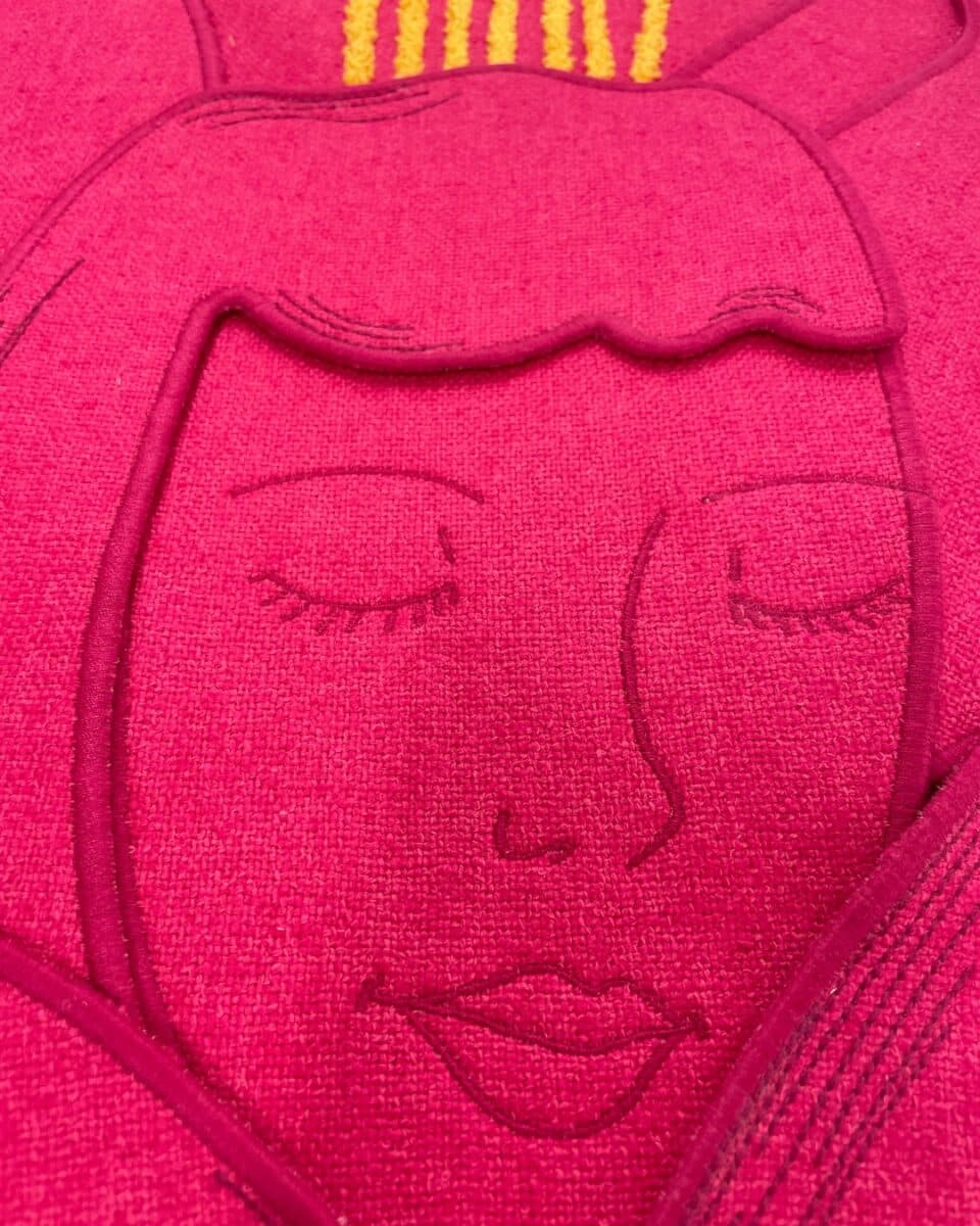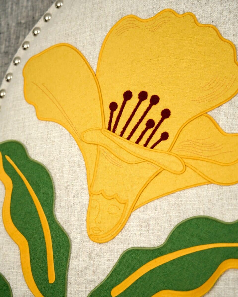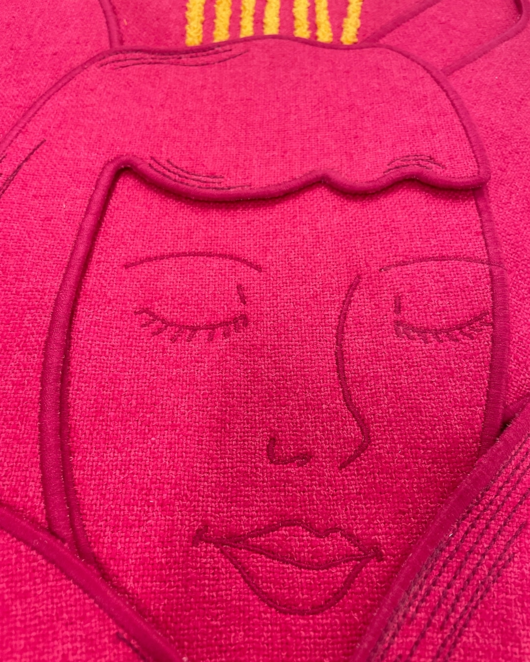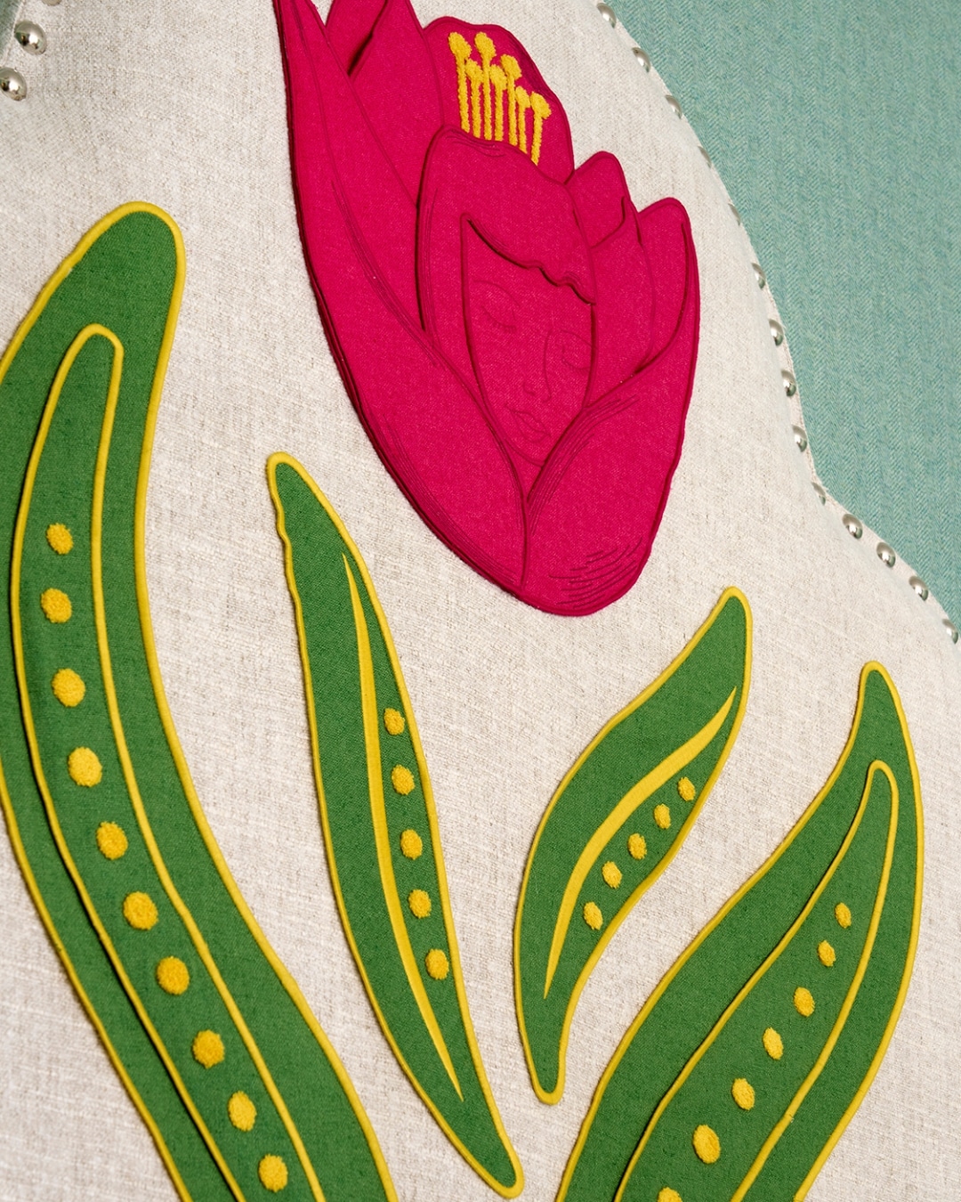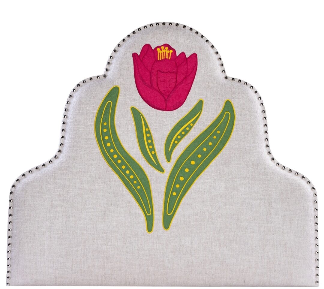 The Carnation headboard features a hand appliquéd pink bloom on natural linen. At first glance, it appears as a vibrant floral, accented by fresh green stems and leaves. On closer inspection, another quiet face reveals itself within the embroidery. Here, the face is framed by a crown of petals, built up through layers of appliqué to create a gently raised surface. The result is a piece defined by depth and a quiet, feminine grace.