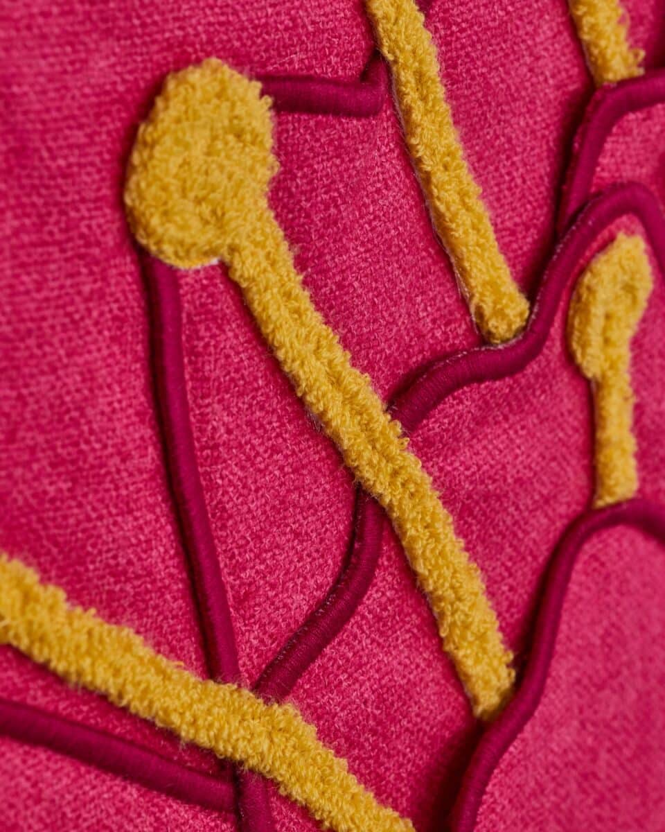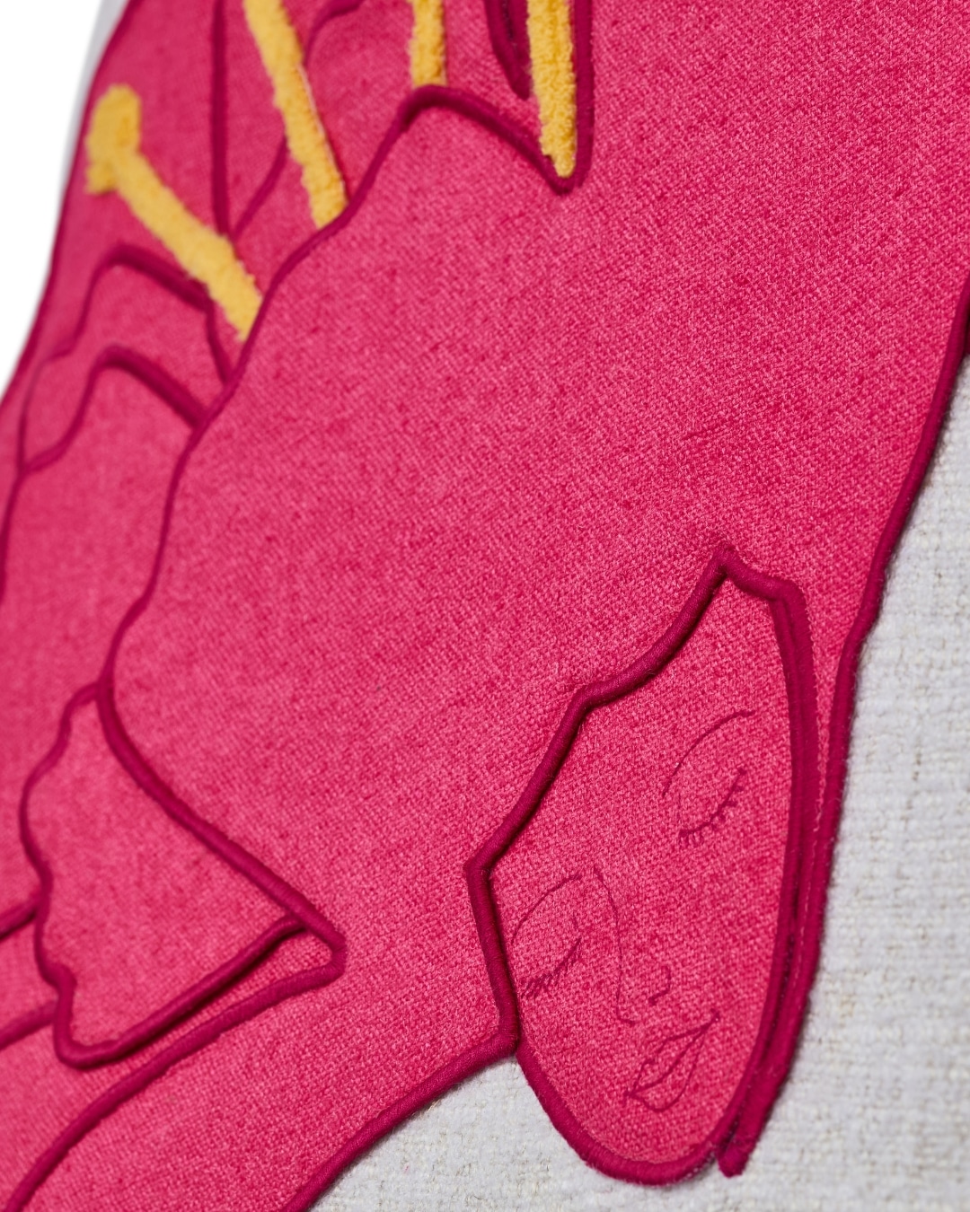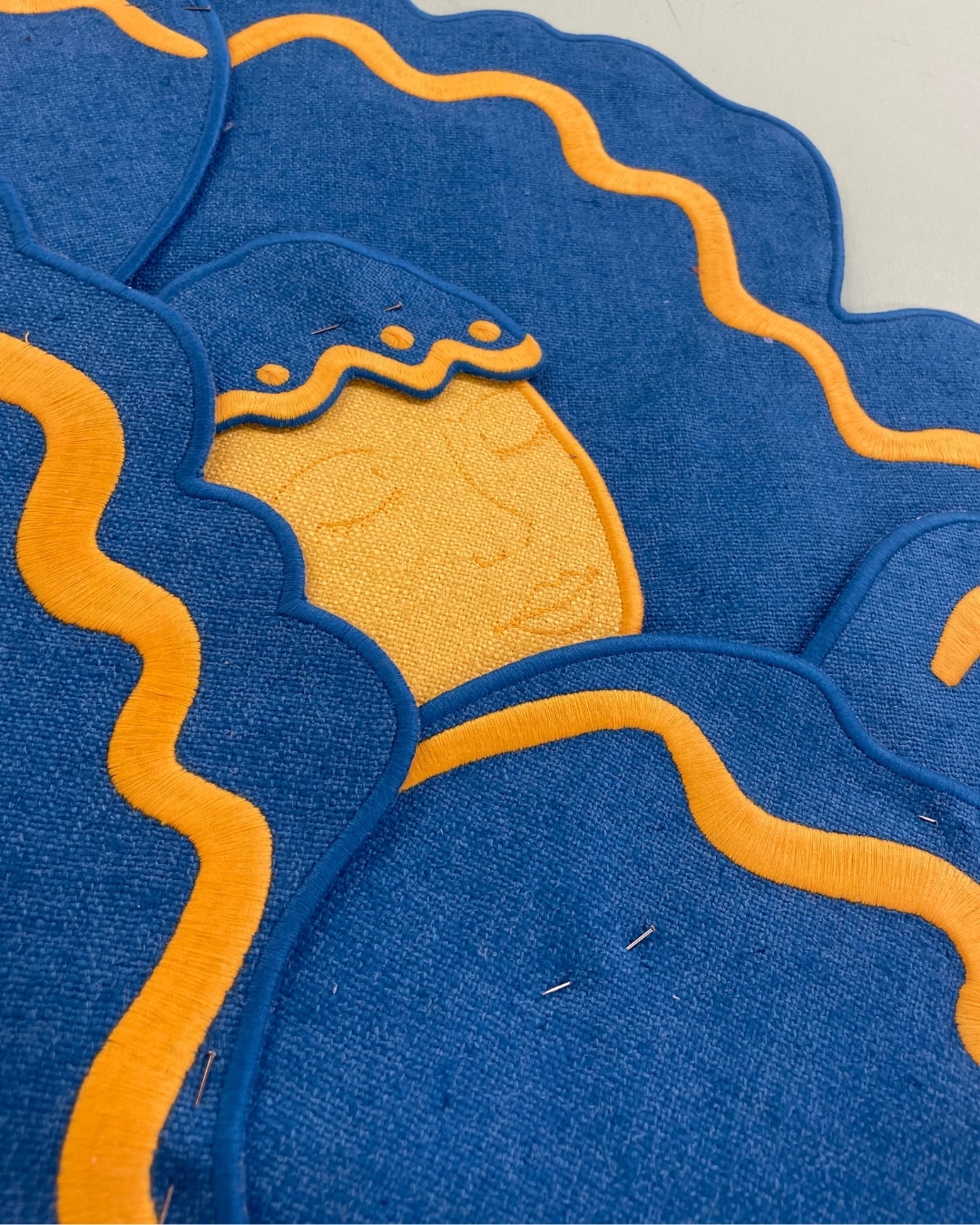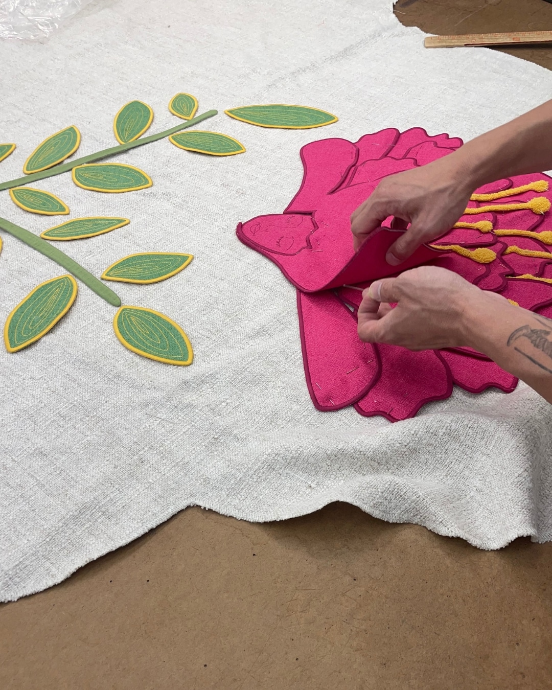 The Carnation headboard features a hand appliquéd pink bloom on natural linen. At first glance, it appears as a vibrant floral, accented by fresh green stems and leaves. On closer inspection, another quiet face reveals itself within the embroidery. Here, the face is framed by a crown of petals, built up through layers of appliqué to create a gently raised surface. The result is a piece defined by depth and a quiet, feminine grace.