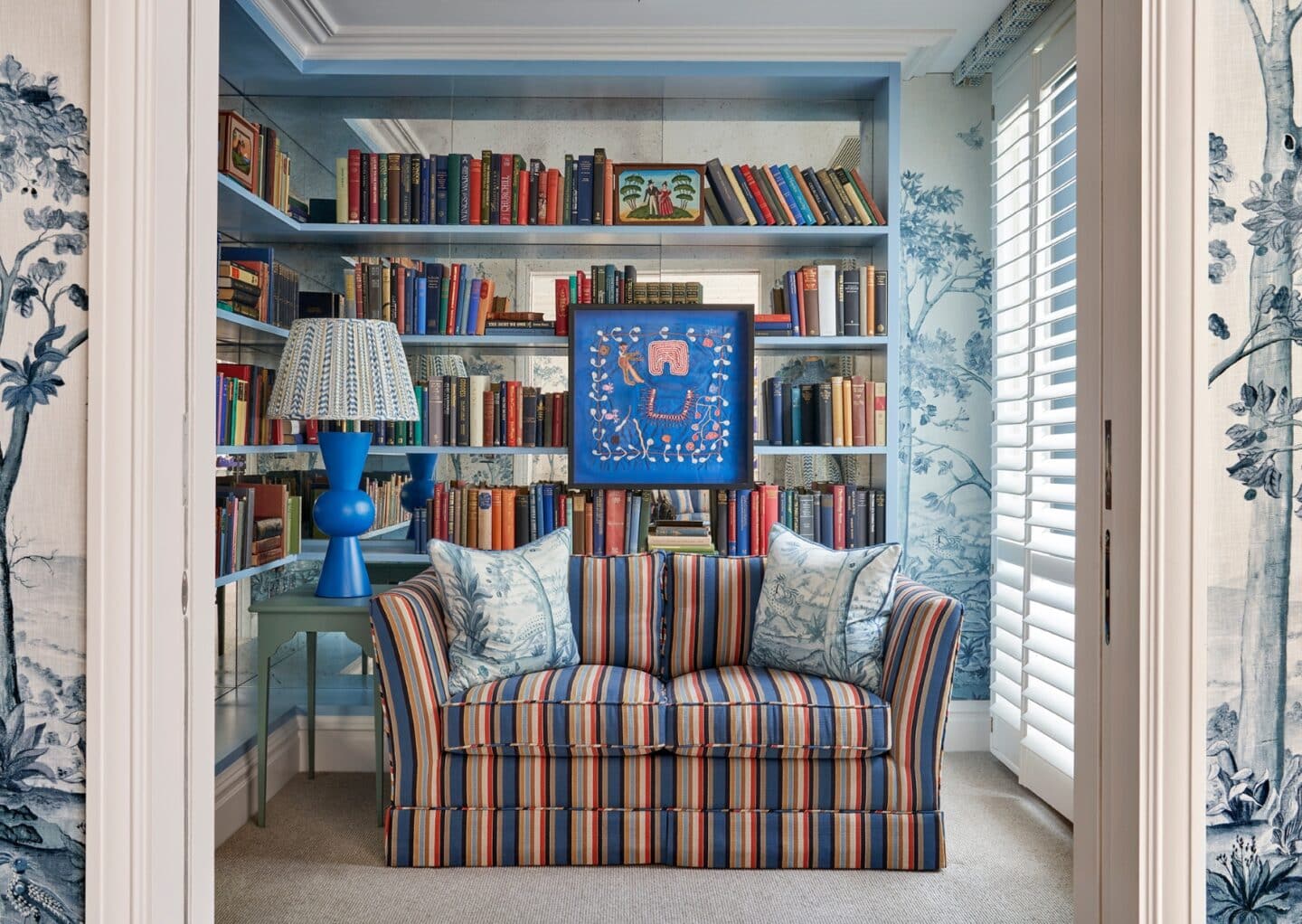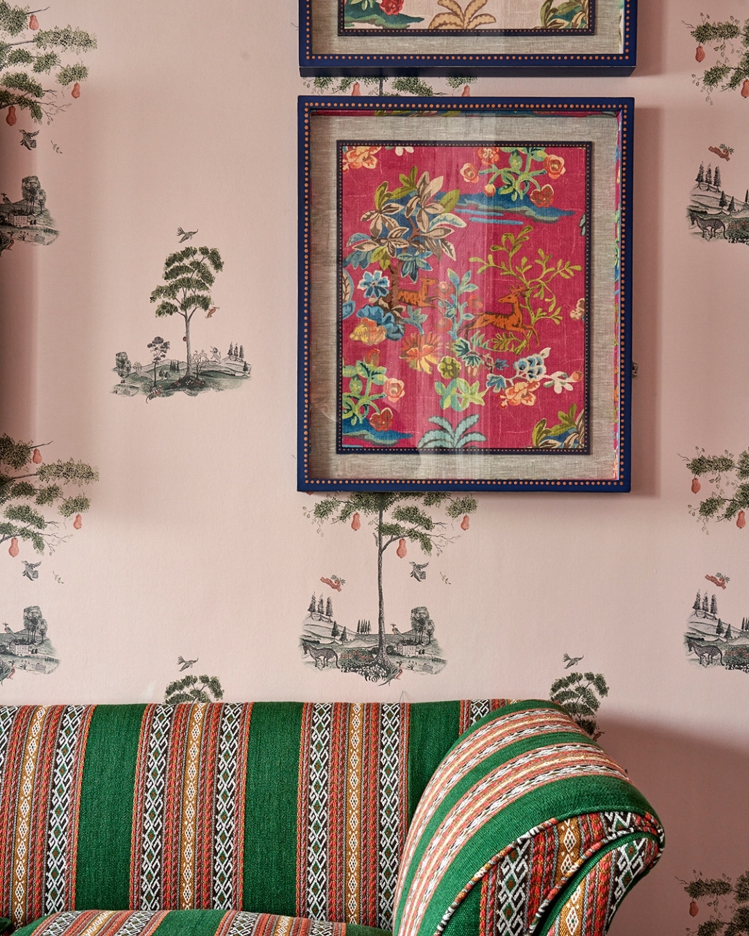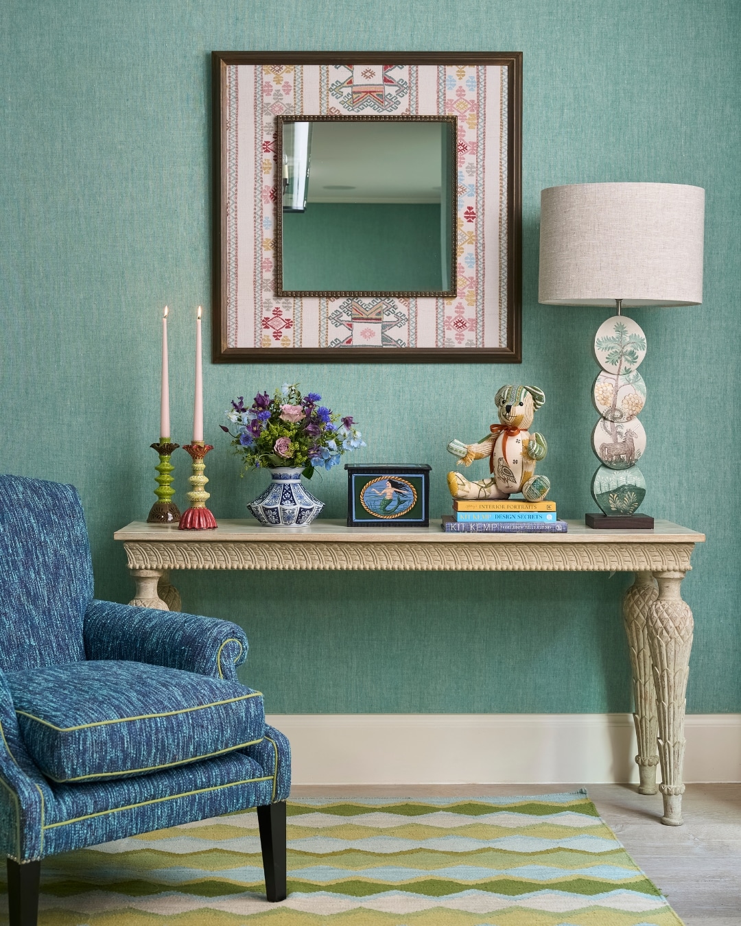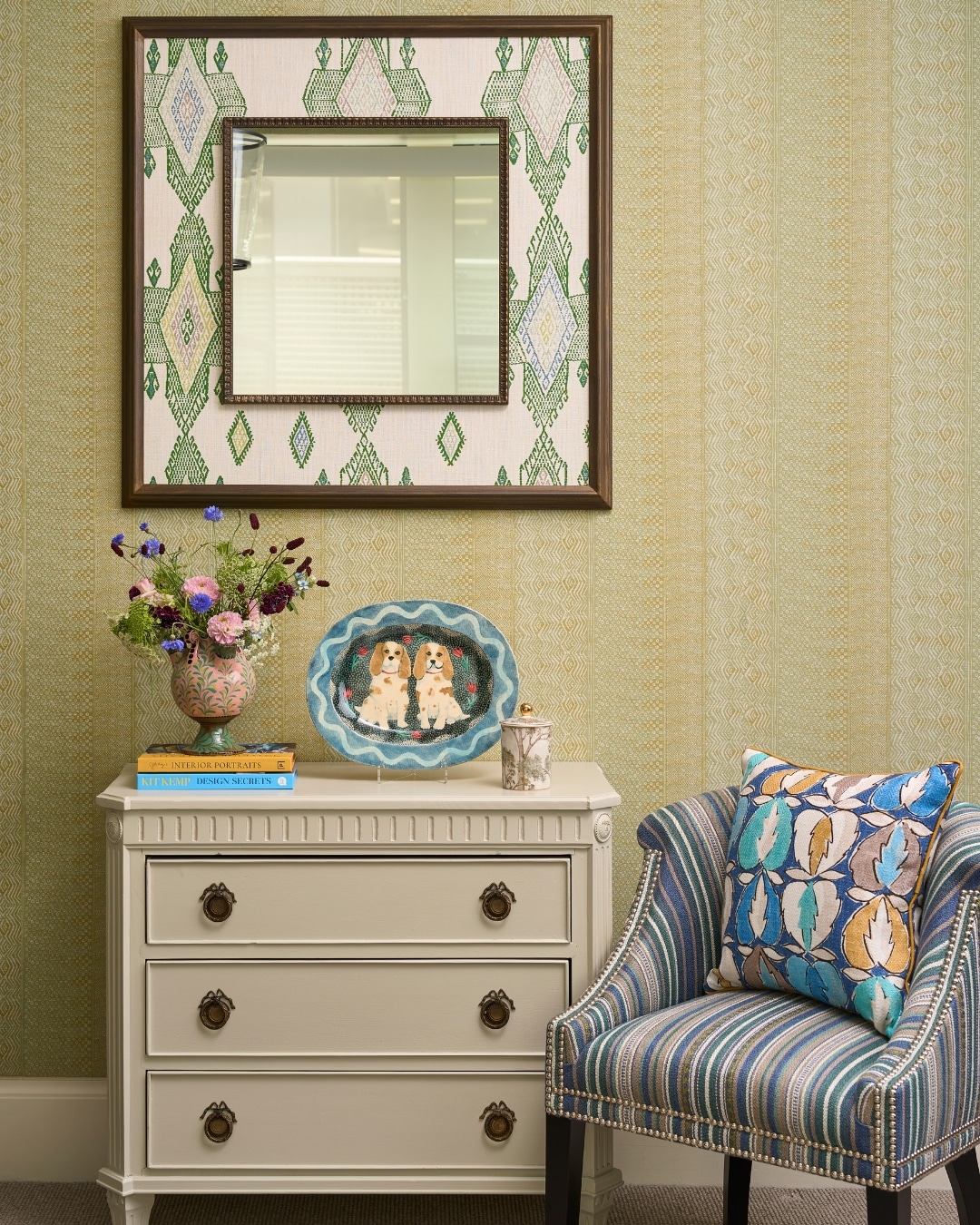 A fabric framed mirror can also become a decorative feature in its own right, adding interest to something otherwise simple. Set against plain walls, the contrast between the solid form and patterned fabric brings an extra layer of visual richness. If you have a spare mirror at home, it is well worth experimenting.