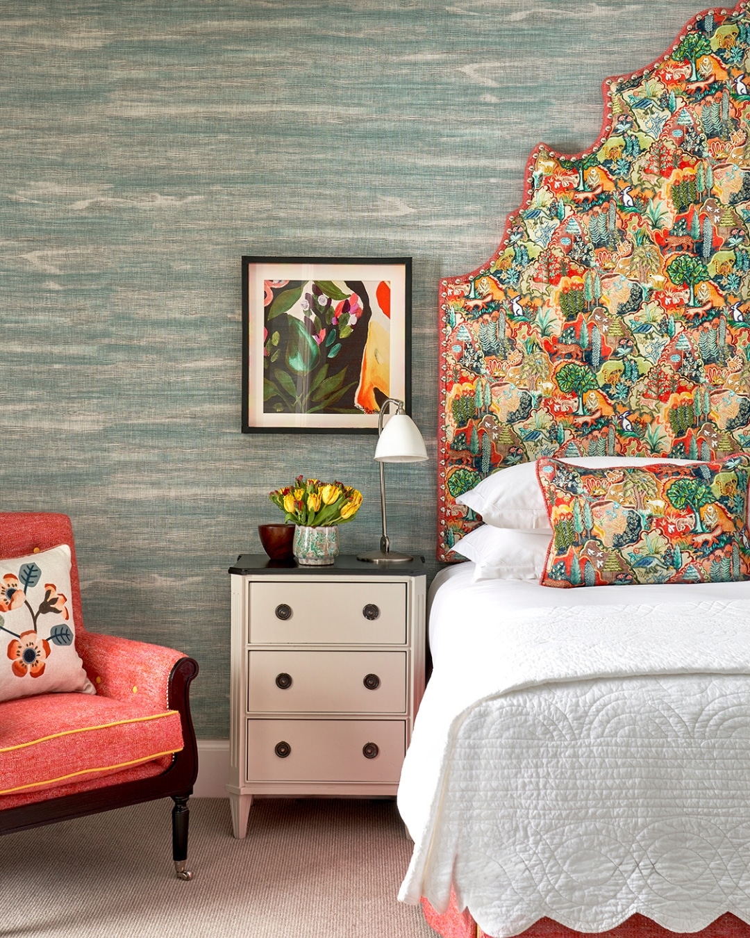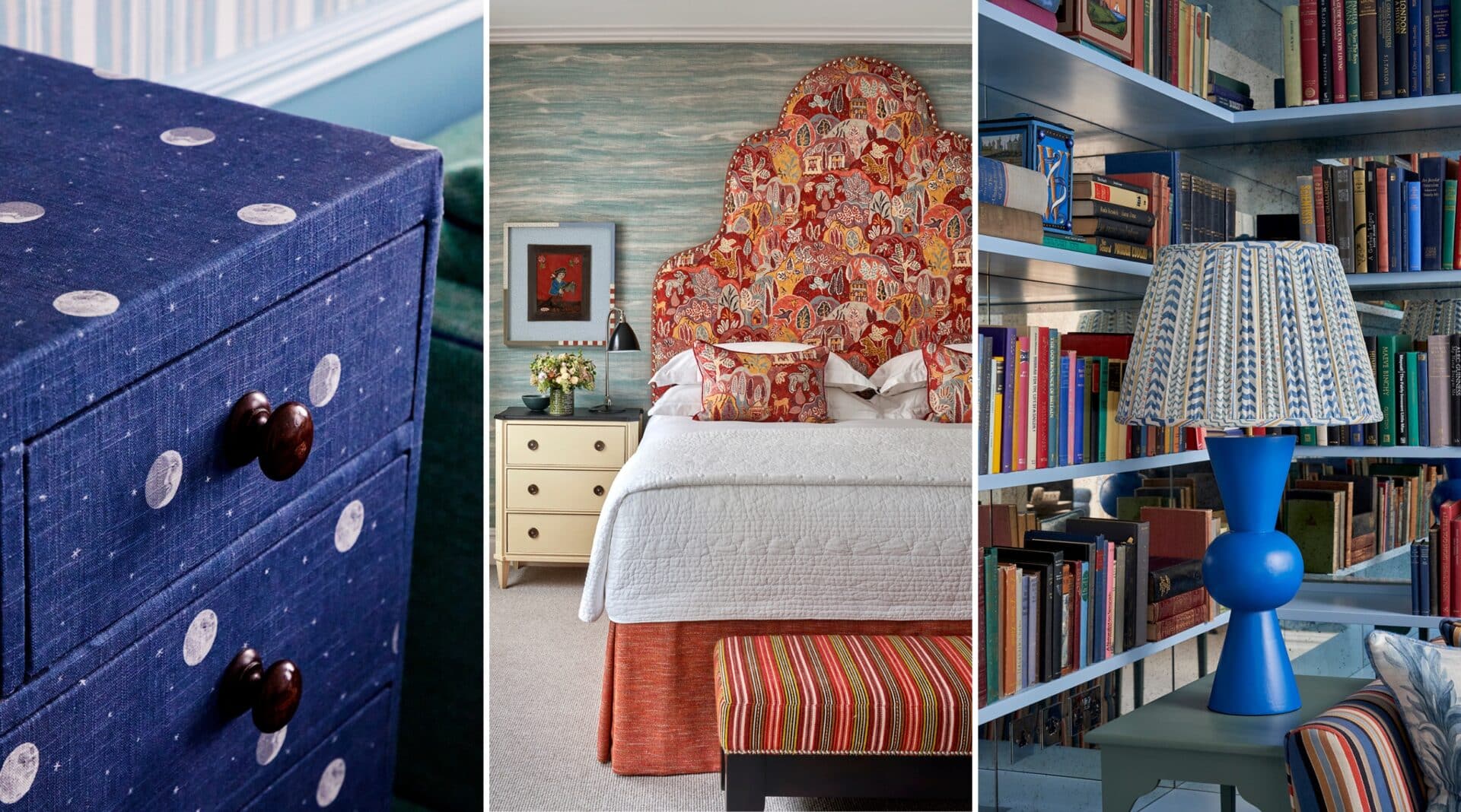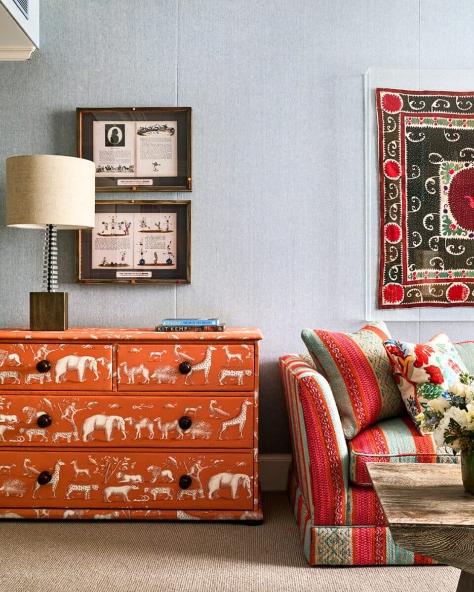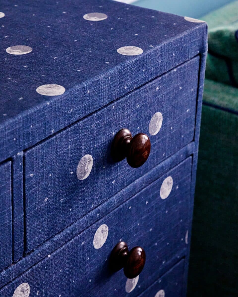 A painted chest of drawers is always appealing, but a fabric-covered piece can be just as striking. It introduces texture, creates a distinctive look and allows for more fluid, organic shapes that complement the rest of the room. It can also become a unique piece that evolves with the space over time.
