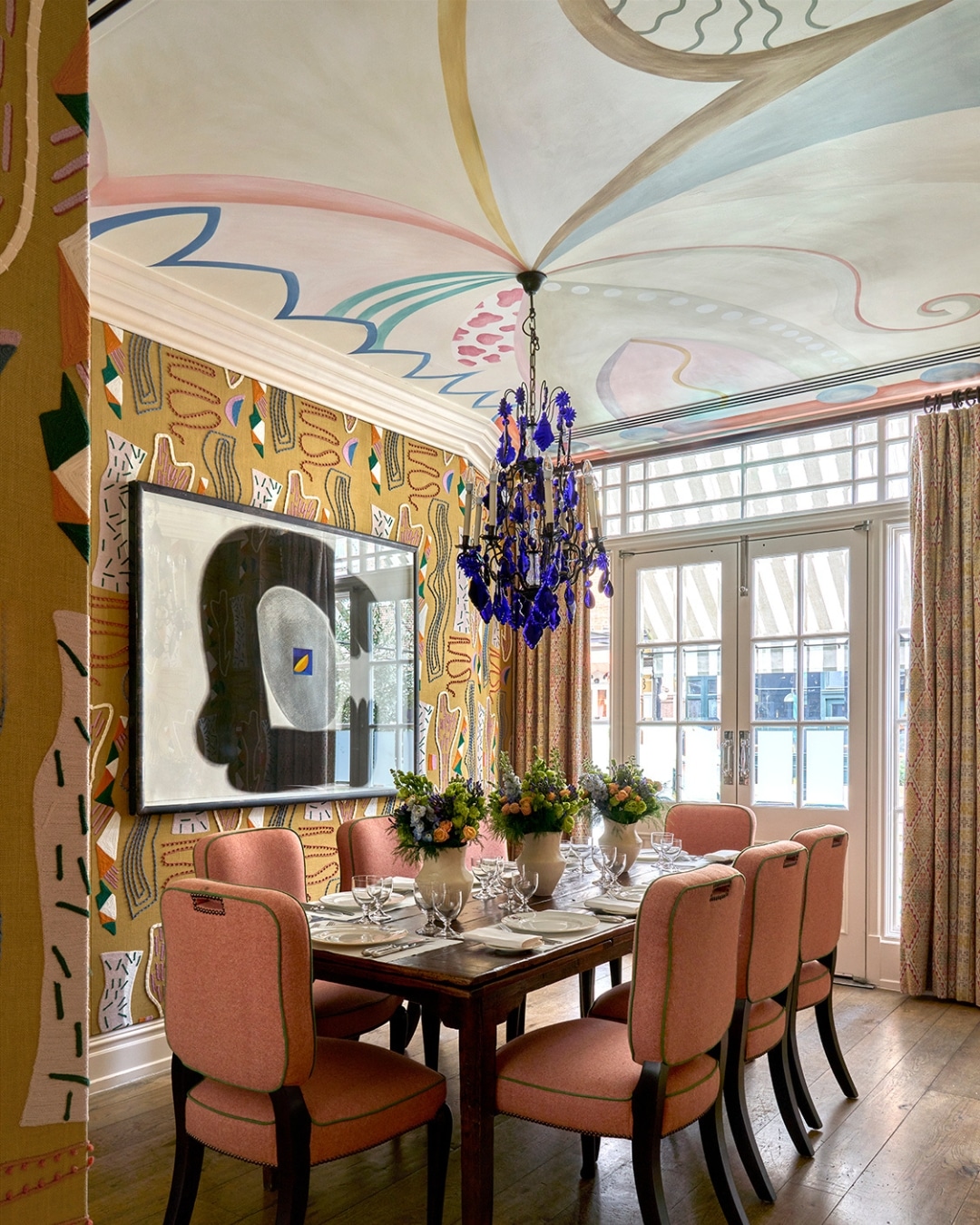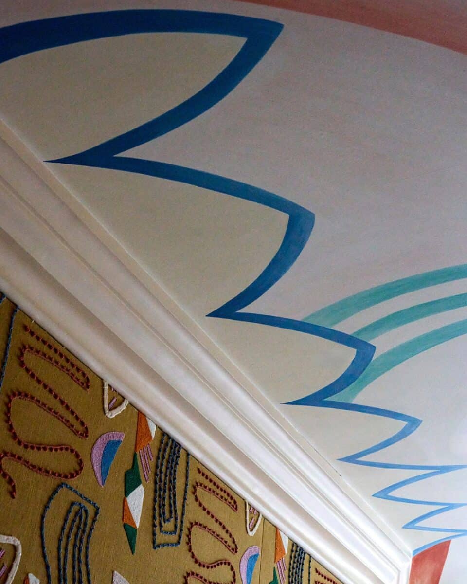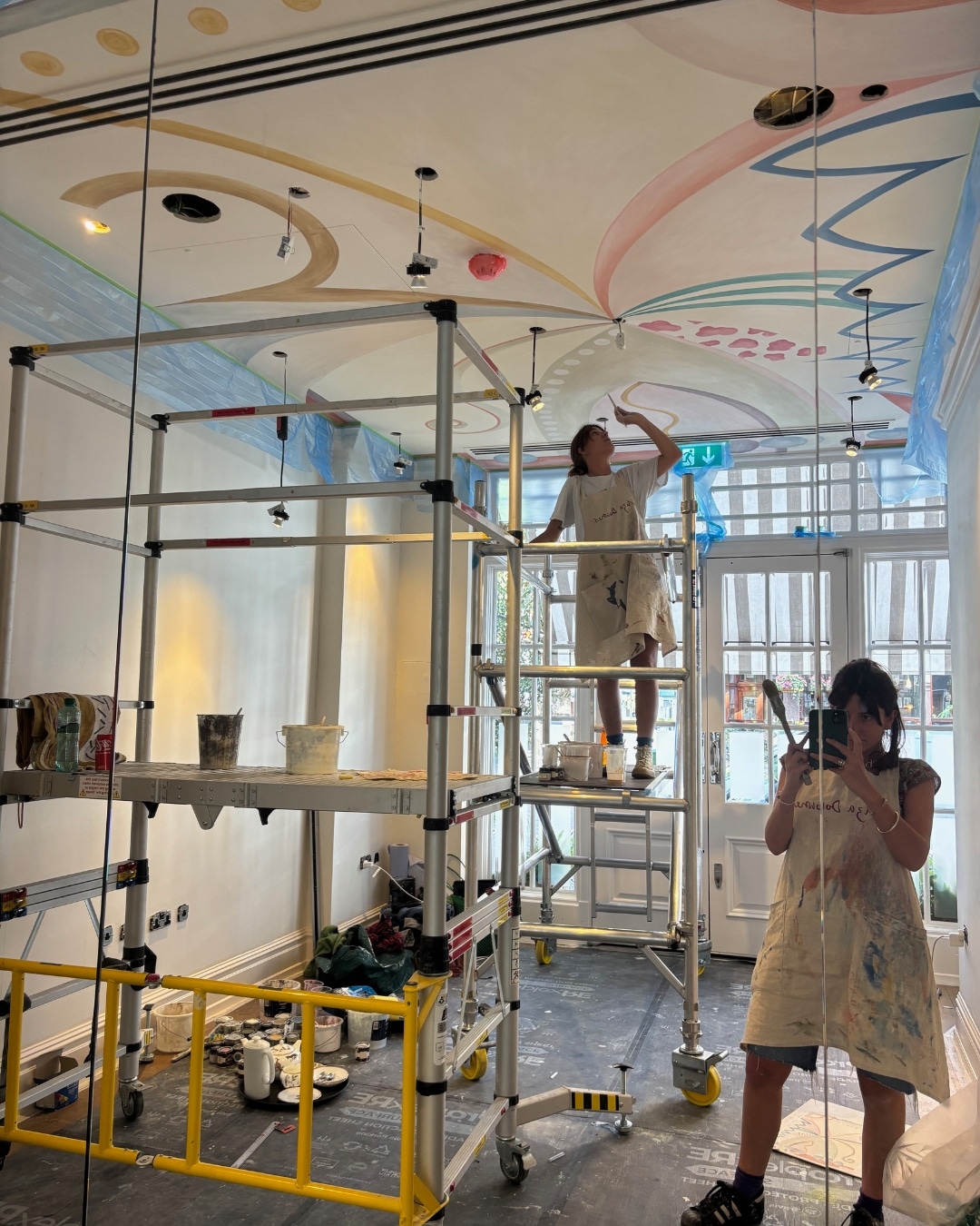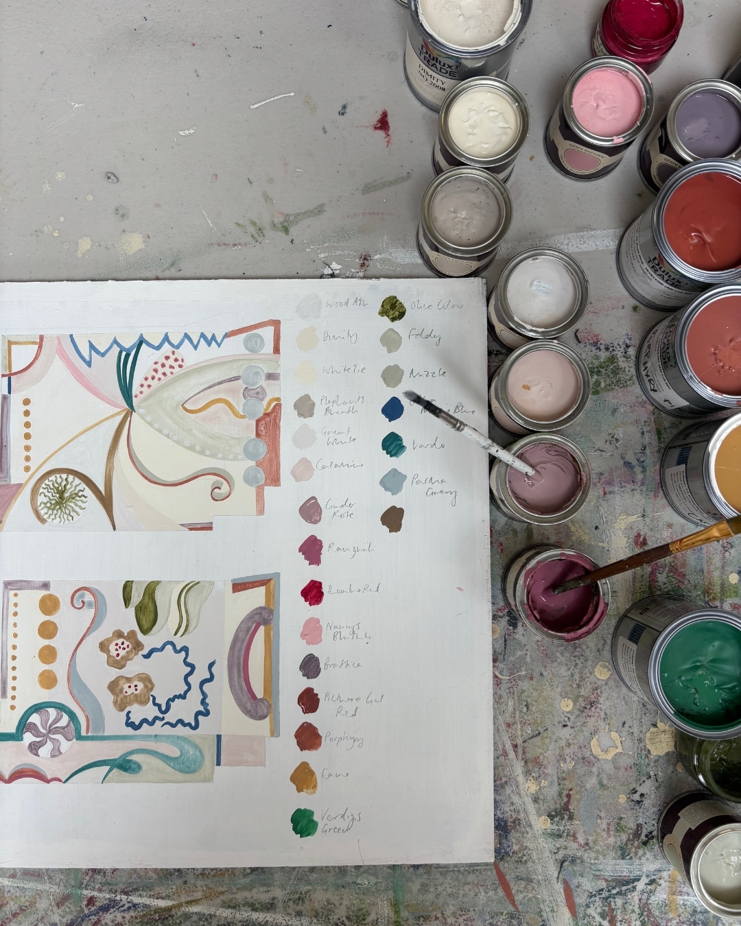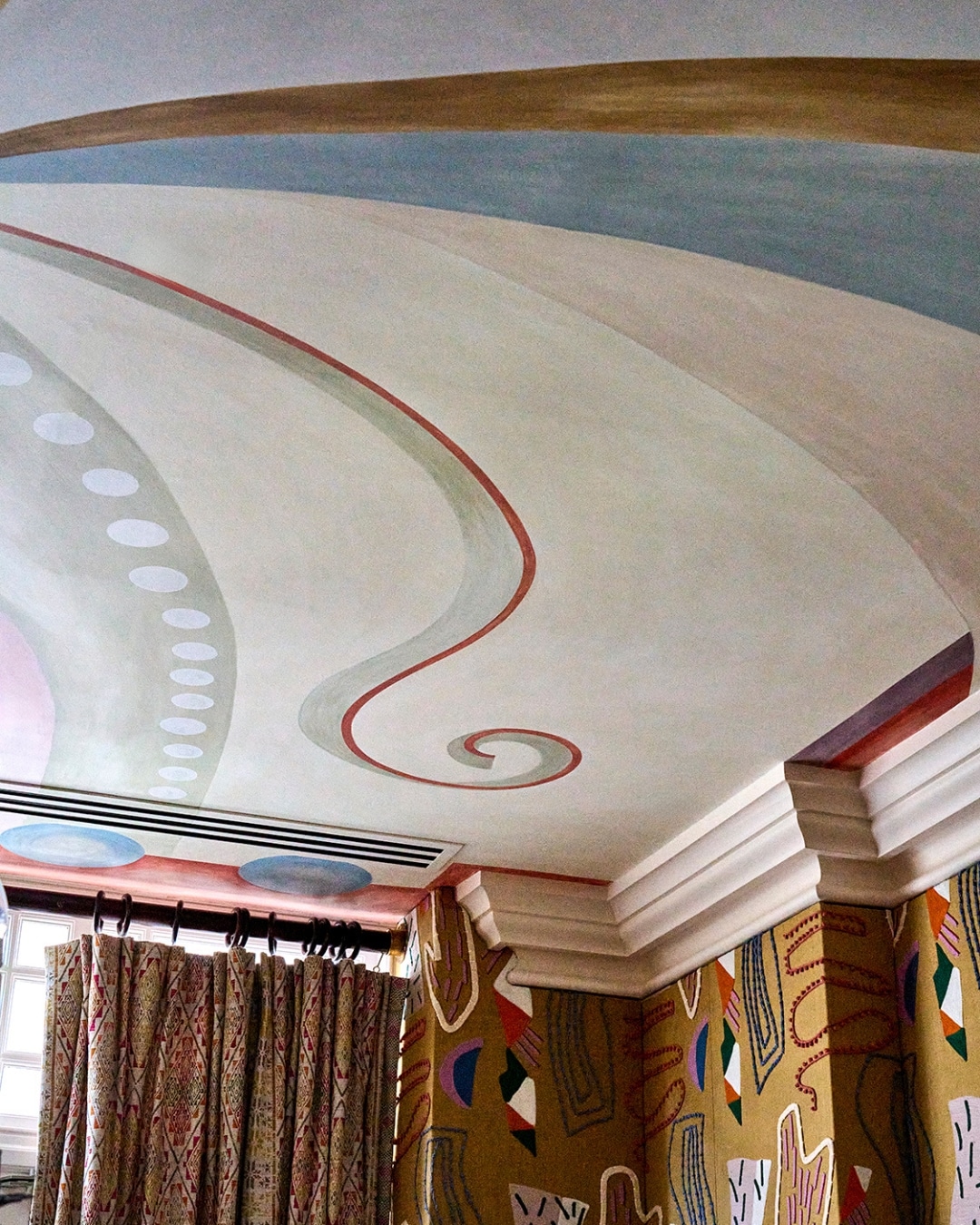 It began with spending time in the hotel and absorbing the Bloomsbury Group stories woven through the interiors. I was particularly inspired by Duncan Grant and Vanessa Bell, and especially by Alexander Hollweg’s mural in the Oscar Bar, which I loved. From there, I experimented with Bloomsbury inspired motifs, sketching and rubbing out countless ideas before pulling everything together into three final designs. I focused on ensuring the shapes flowed and felt balanced. Colour is my favourite part of the process and it develops alongside the fabrics and finishes in the room so nothing feels too loud. Once on site with the chosen design, my team and I spent a week painting through the summer and eating a lot of their delicious macaroons.